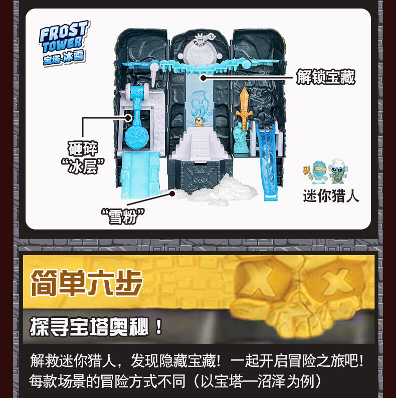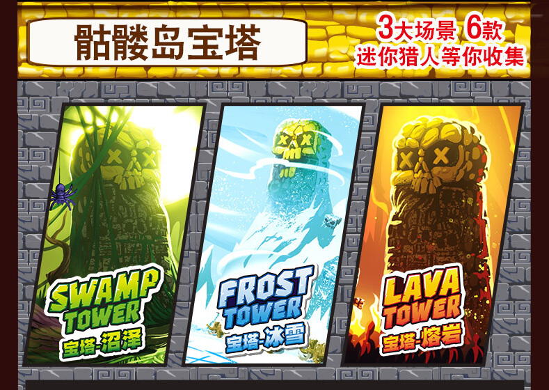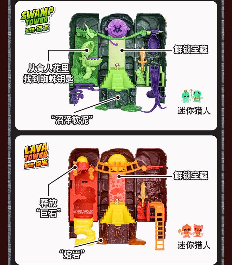 1. 3种不同游戏场景——选择哪个宝塔开启冒险之旅? 宝塔共有 3 种不同的游戏场景可供选择,分别为沼泽、熔岩、冰雪。每个场景都能发现2款迷你猎人,完成任务找出钥匙更能解锁宝塔里隐藏的宝藏!