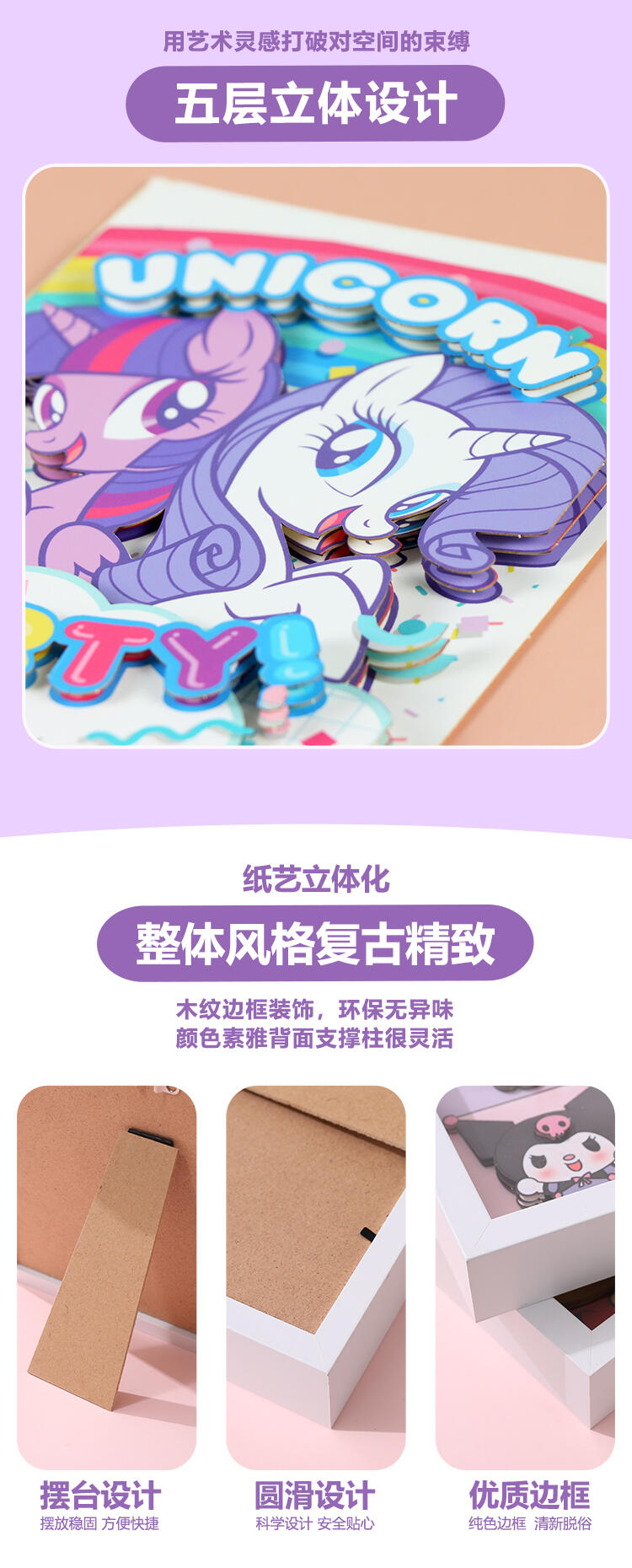1.纸艺立体化、整体风格复古精致; 2.木纹边框装饰、环保无异味; 3.颜色素雅背面支撑柱很灵活;