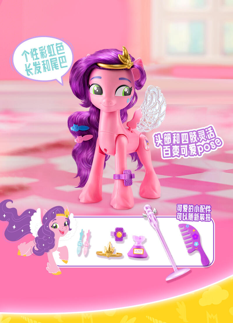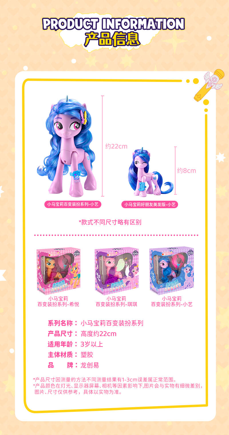 20cm可动小马宝莉可动公仔,头部/四肢/尾巴灵活可动,多彩靓发加上丰富的装扮配件,快来装扮你的专属小马宝莉吧!