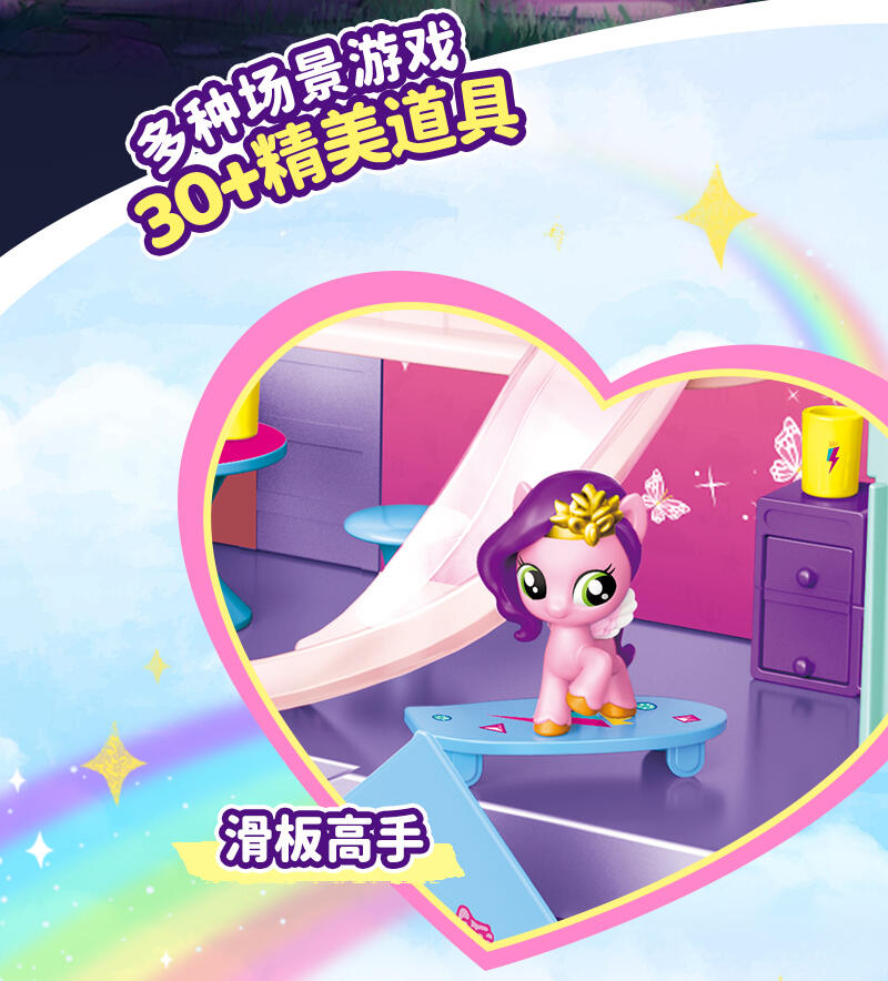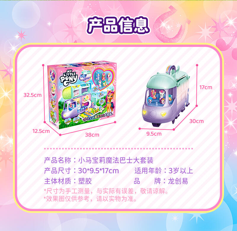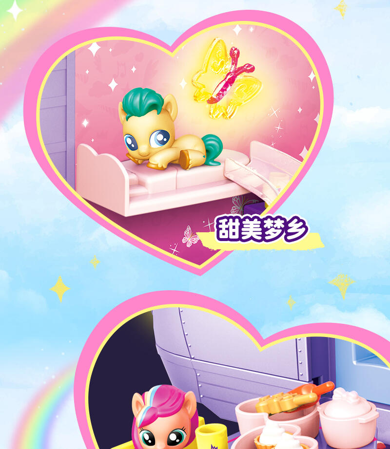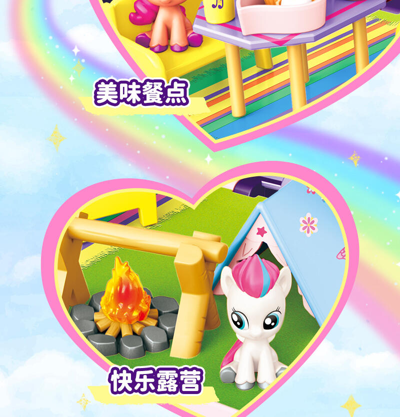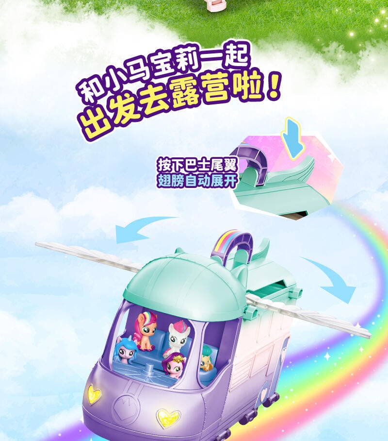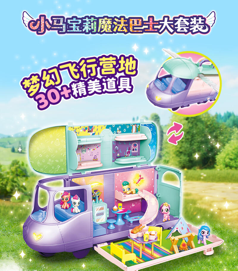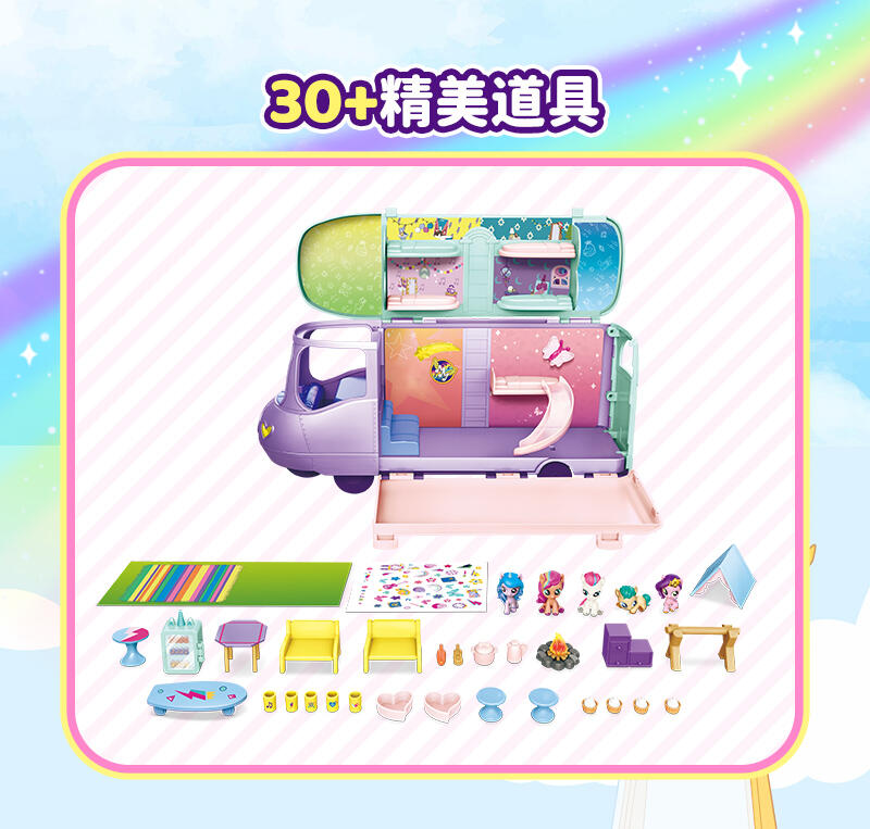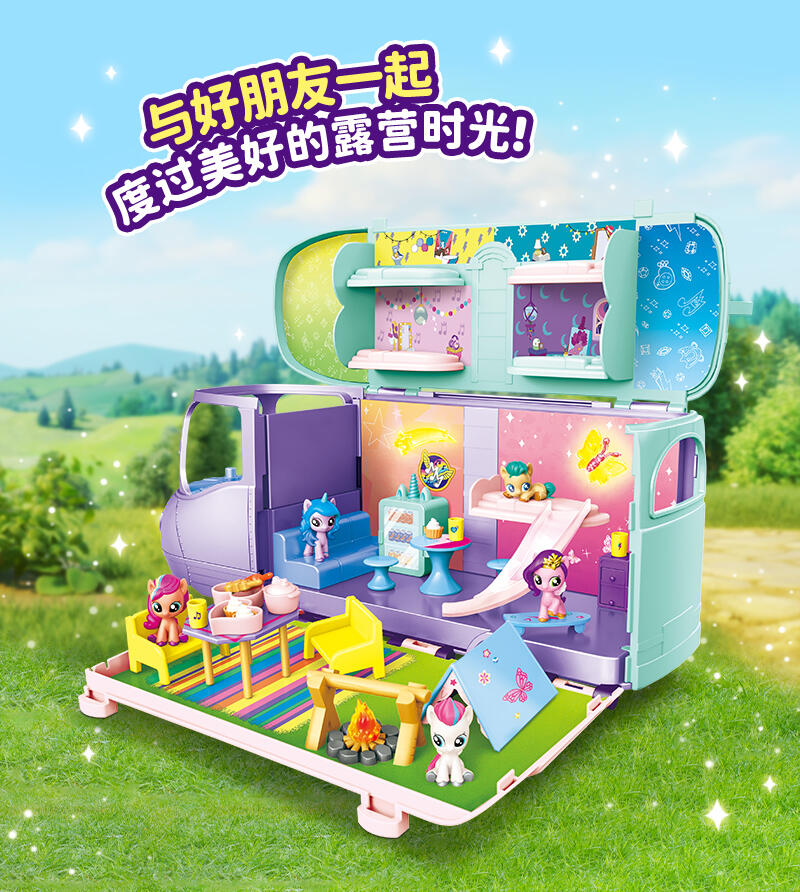 1、可爱巴士造型; 2、5只可爱小马宝莉一起用房车露营,丰富的配件和多种玩法还3、有温馨的氛围灯!
