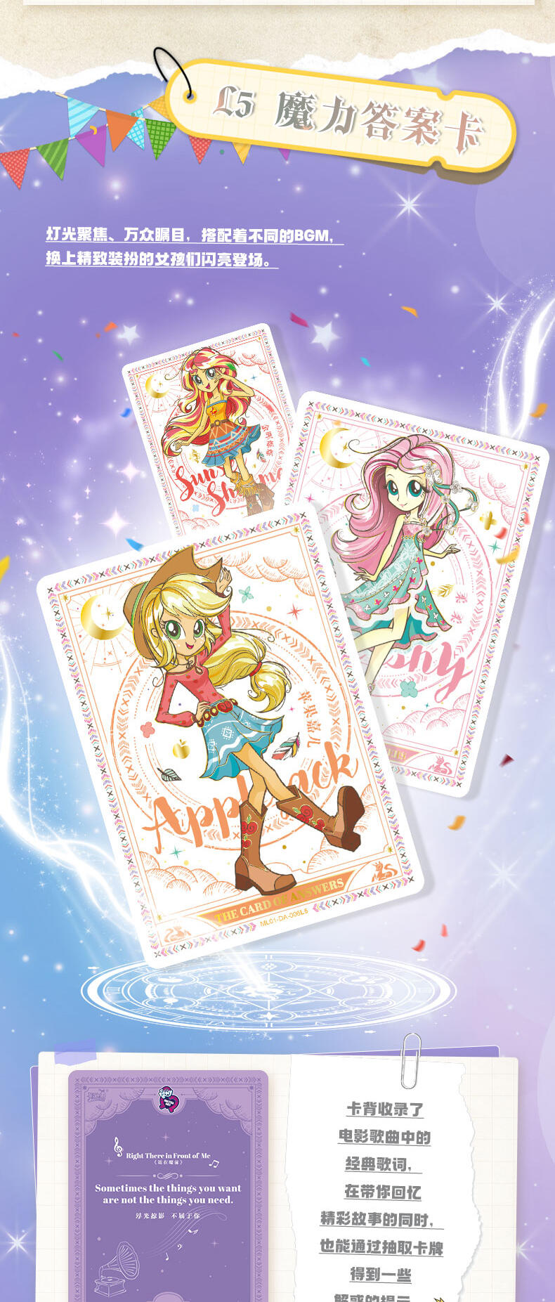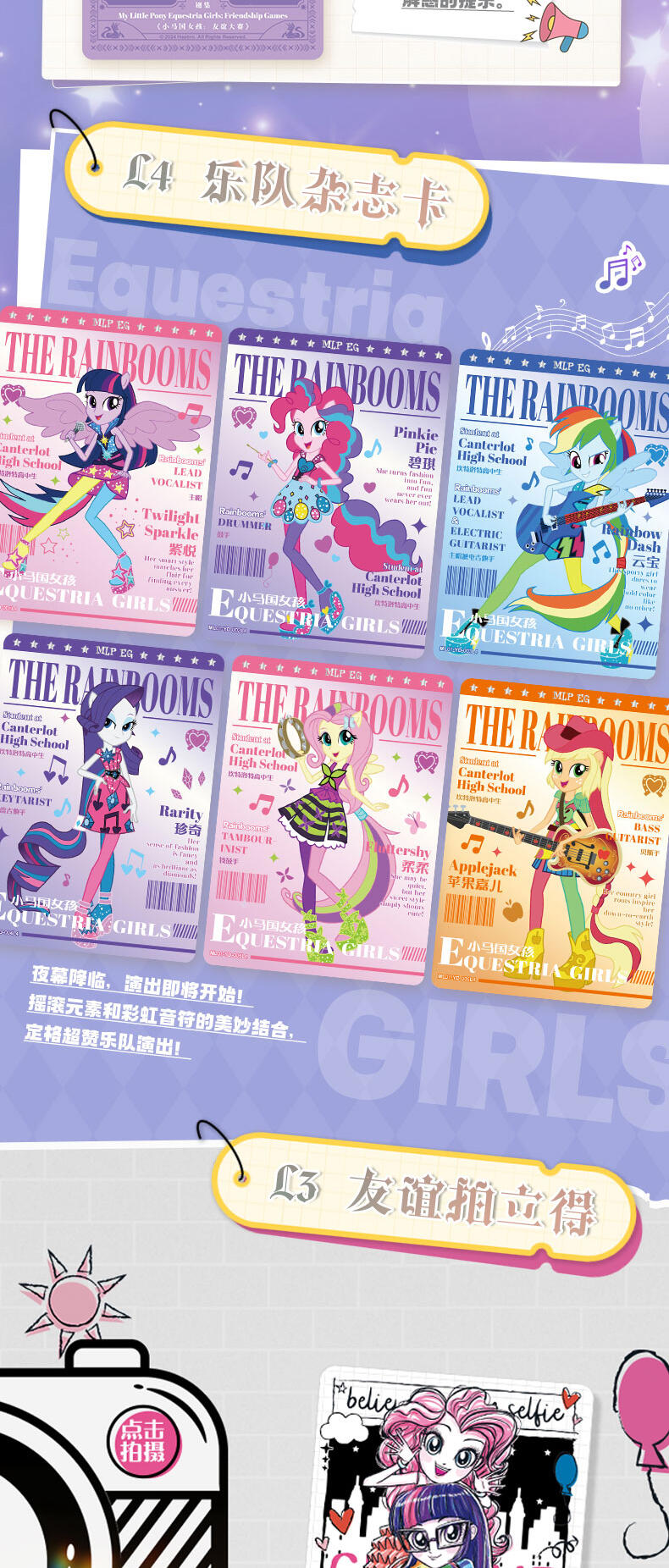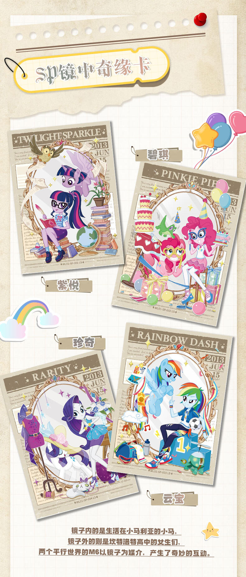 本产品共有87种卡牌,22种L2角色身份卡,20中L3友谊拍立得卡,18种L4乐队杂志卡,20种L5魔力答案卡,7种SP镜中奇缘卡,5张每包,每盒含4包补充包,1张SP卡