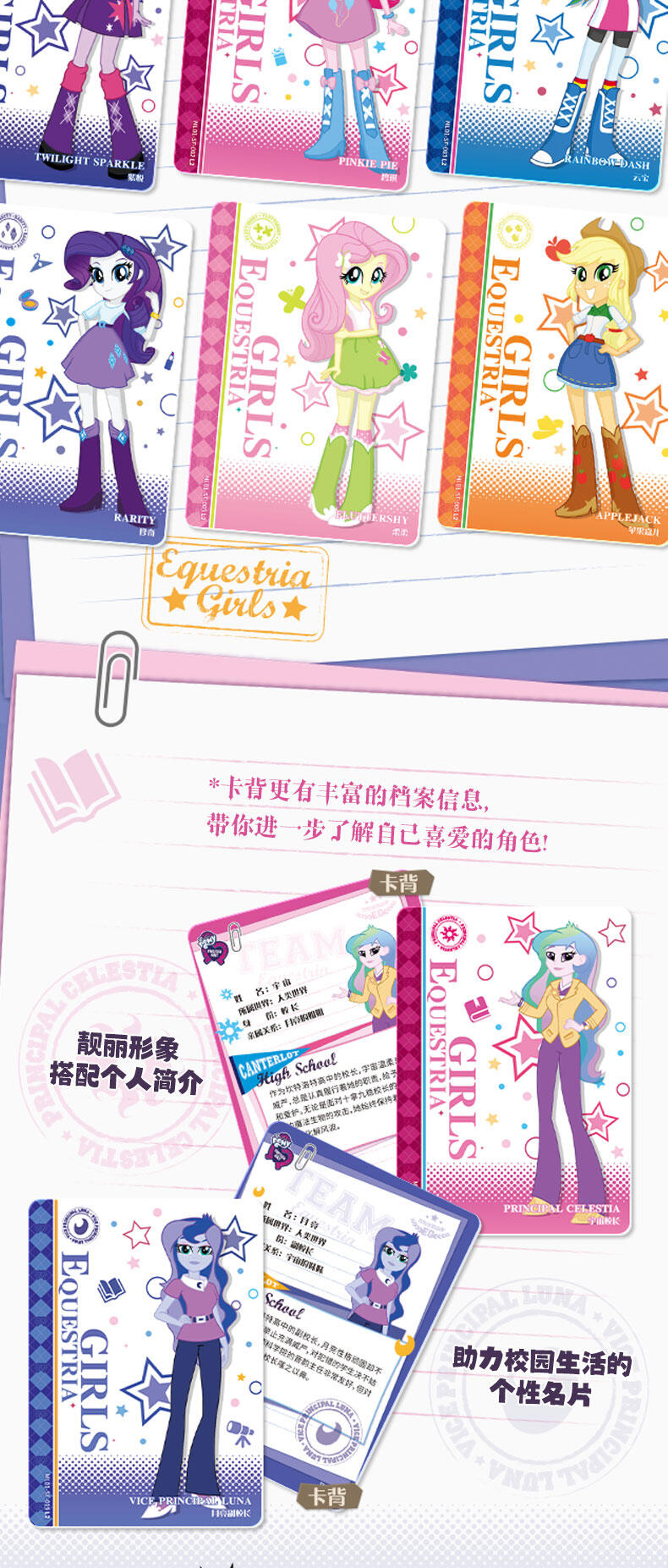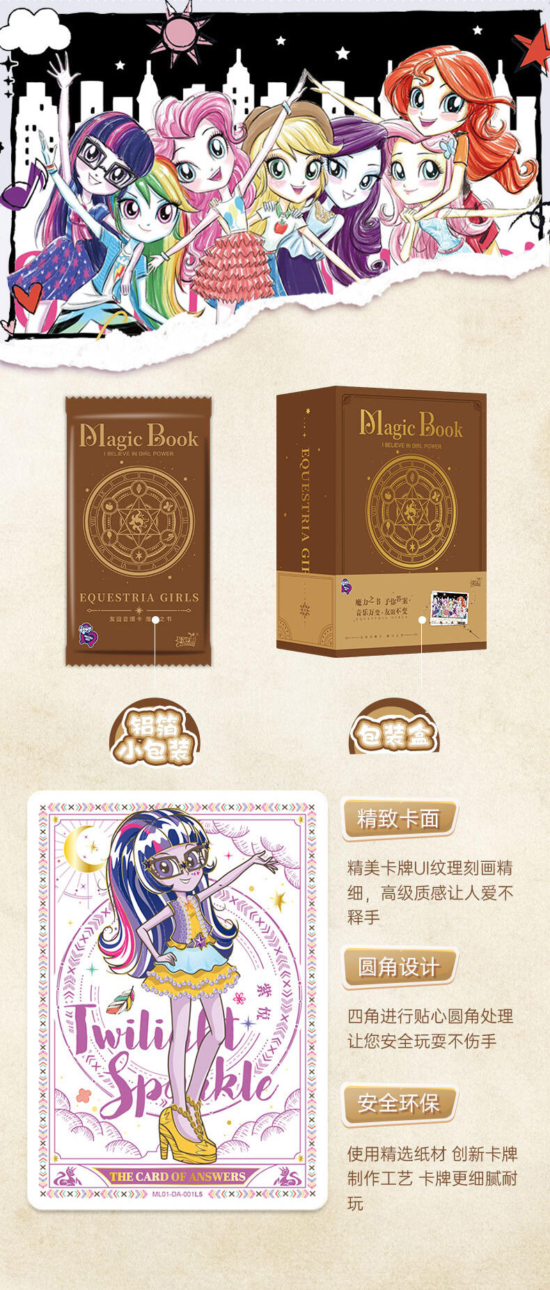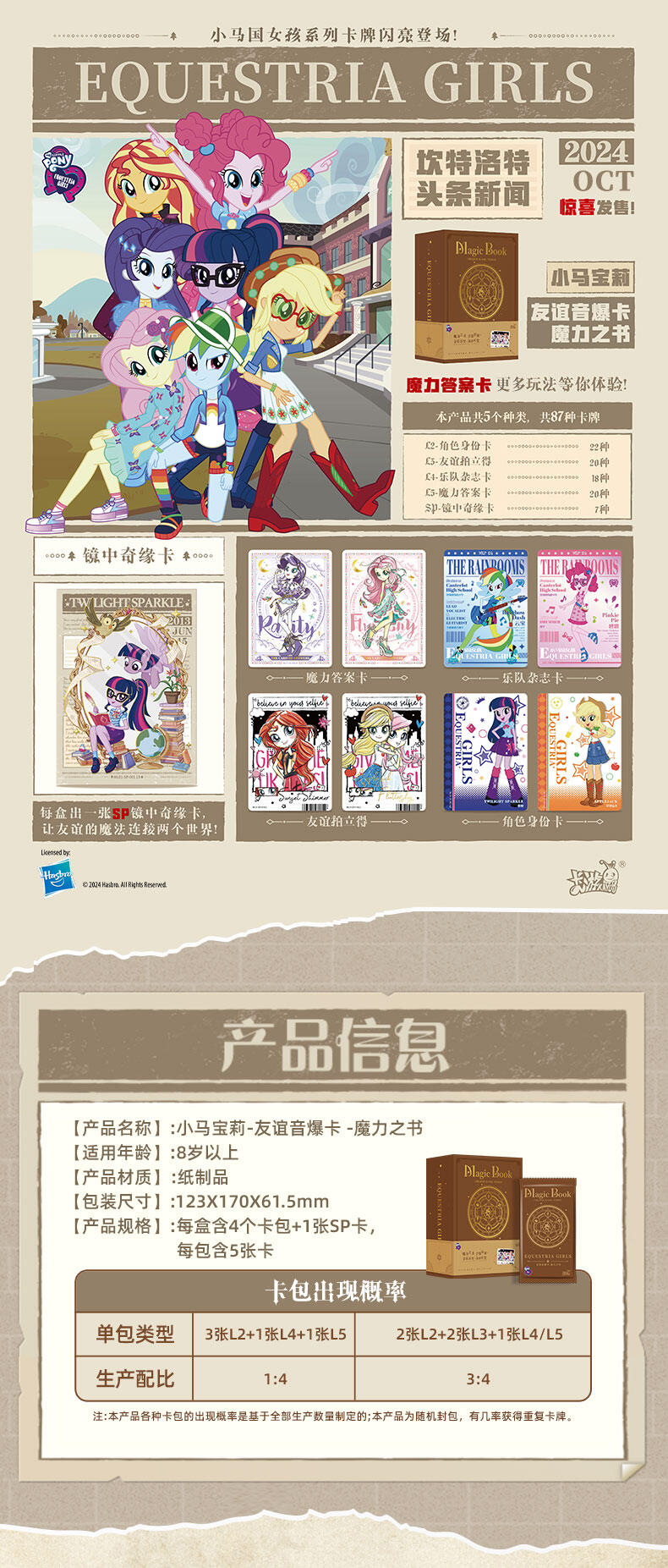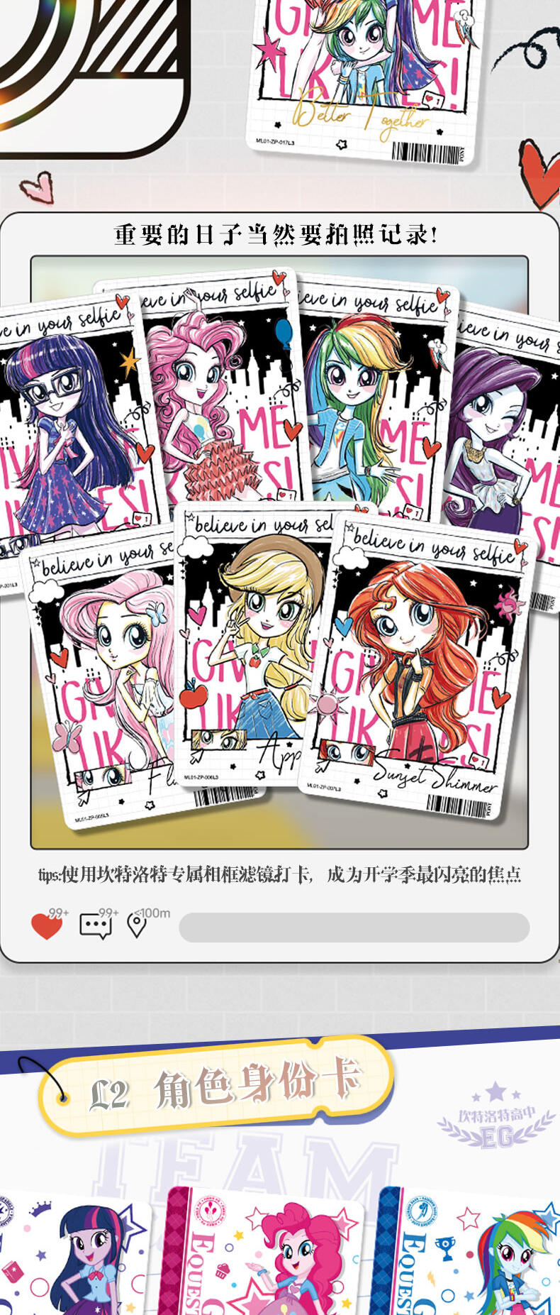 本产品共有87种卡牌,22种L2角色身份卡,20中L3友谊拍立得卡,18种L4乐队杂志卡,20种L5魔力答案卡,7种SP镜中奇缘卡,5张每包,每盒含4包补充包,1张SP卡
