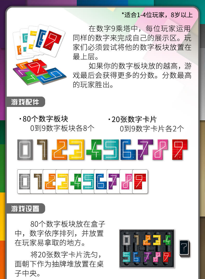 数字9乘塔是一款数字堆叠游戏。玩家根据每轮抽到的数字卡牌上显示的数字,使用相应的数字板块进行摆放,并尽可能将数字板块堆叠得更高以获得更高的分数。注意:数字版块的数字面都要朝上,上层与下层之间不能有镂空部分。如何合理安排每一层的数字版块,才能给上层预留更多的空间