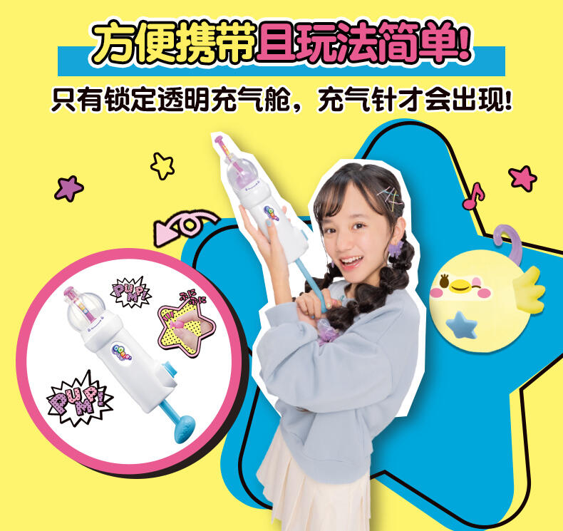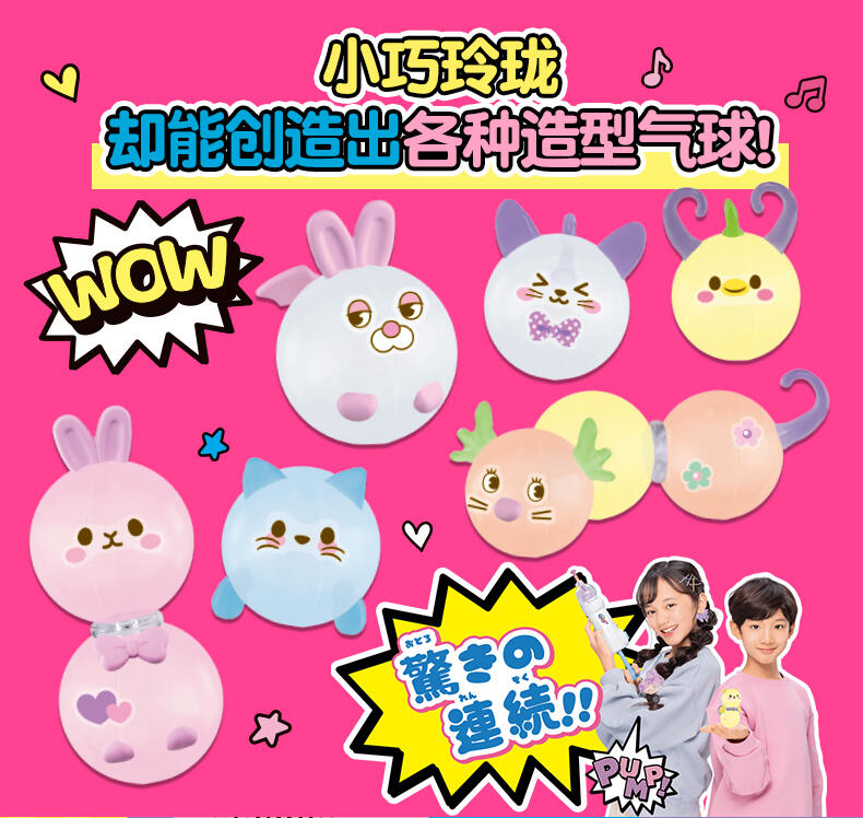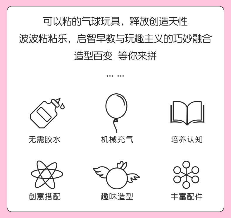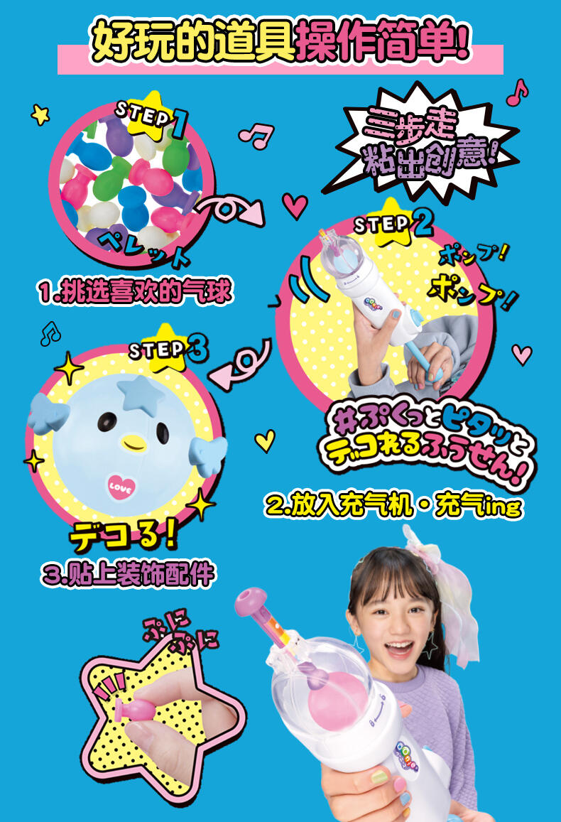 方便携带且玩法安全,小巧玲珑, 却能创造出各种造型气球,发挥无限想象力, 用波波粘粘乐进行装扮吧!