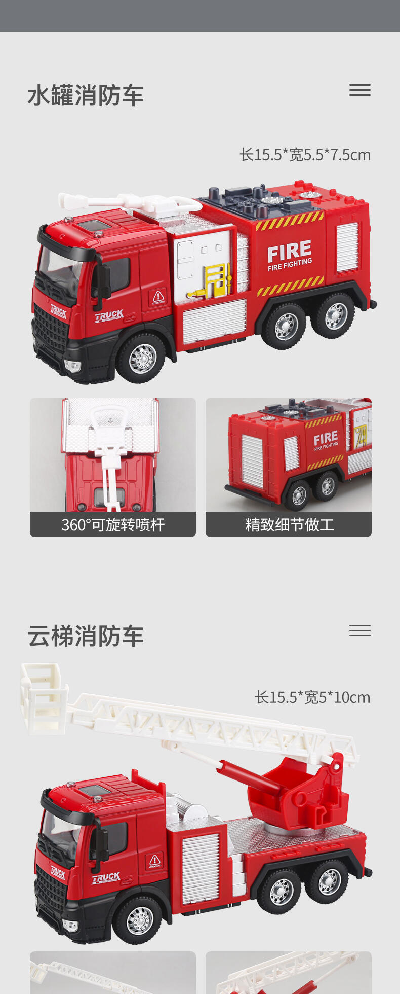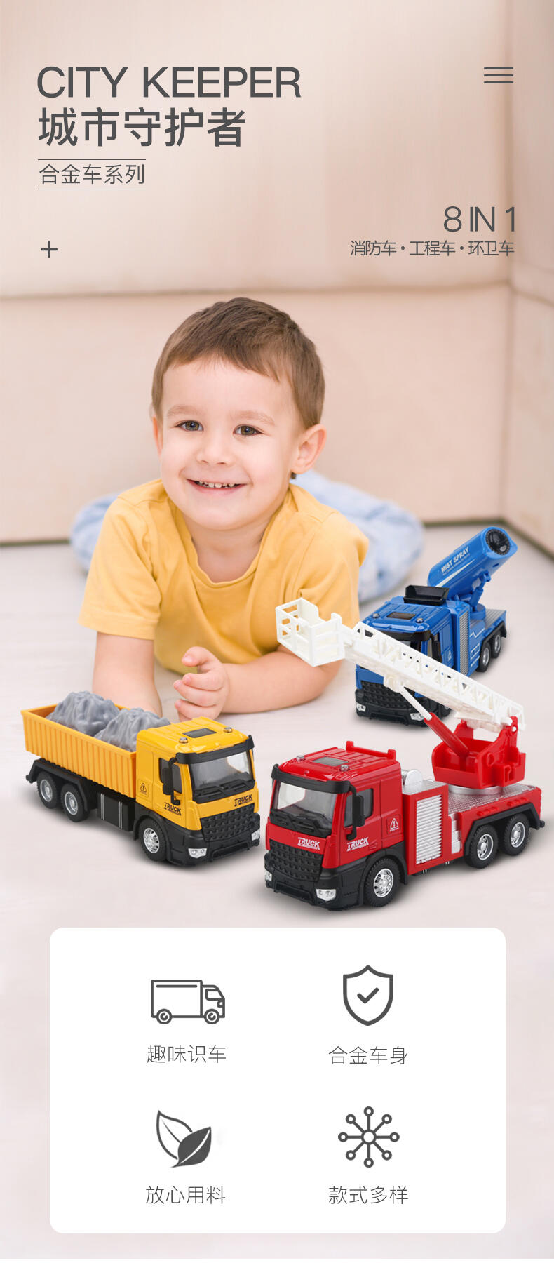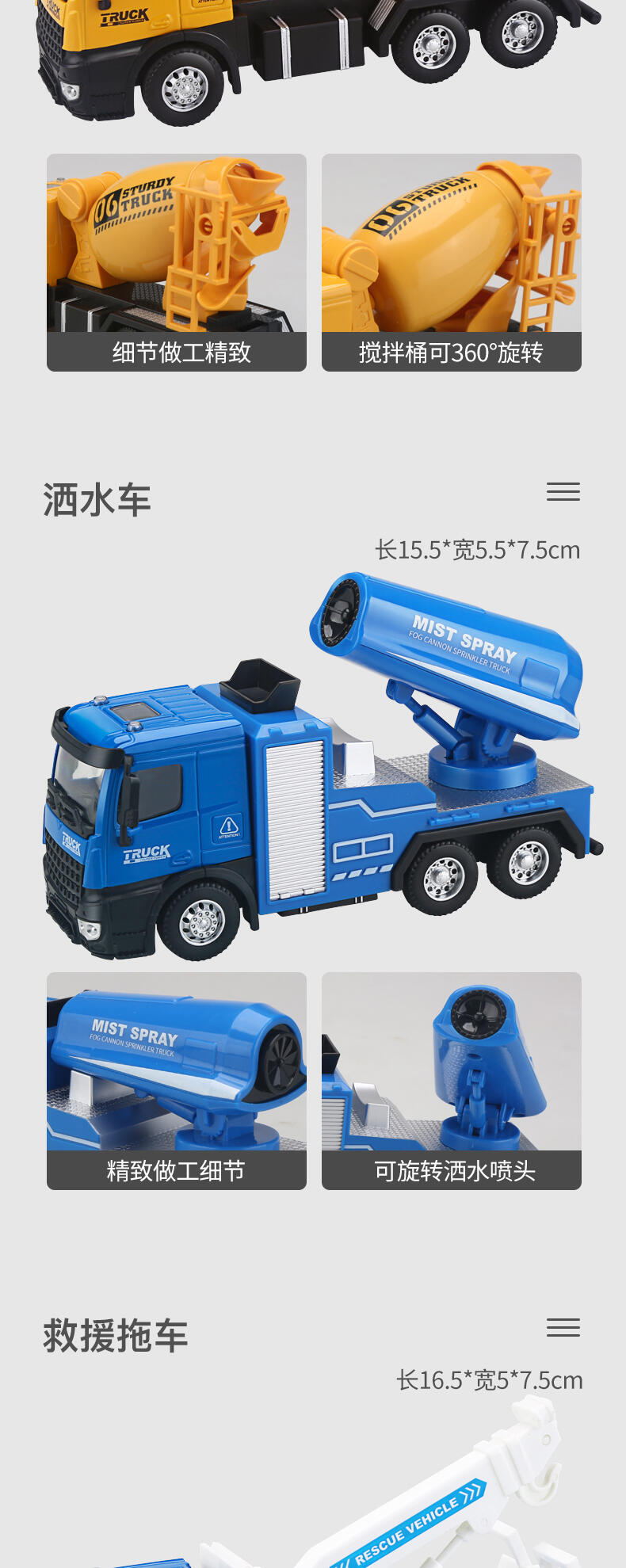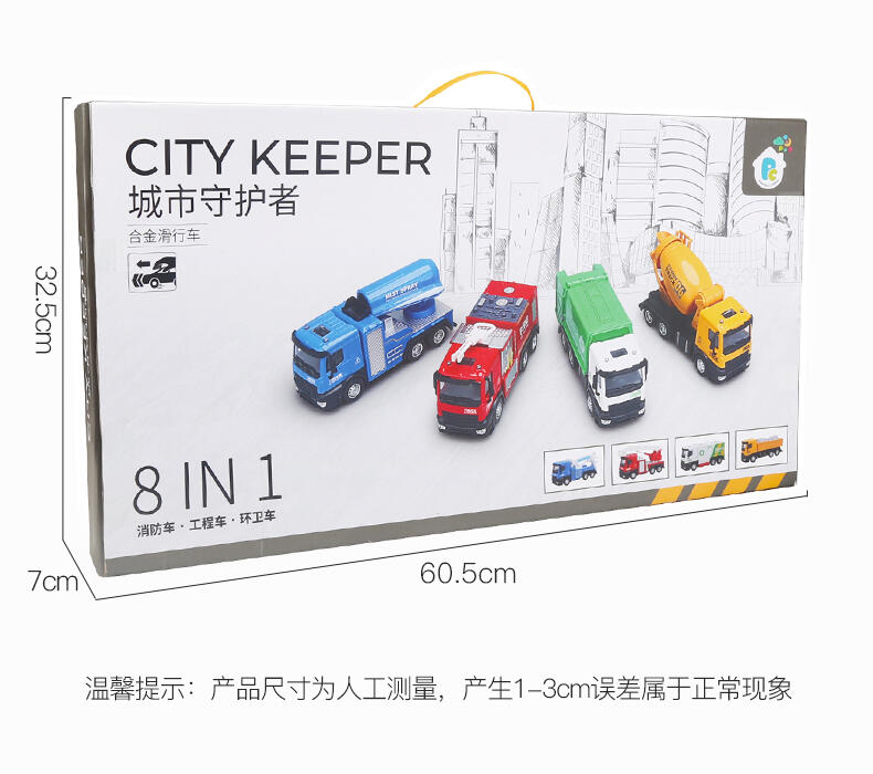 8合1套装车,四种主题城市车,帮助宝宝趣味识车(水罐消防车,云梯消防车,环卫车,洗扫车,运输车,搅拌车,洒水车,救援拖车)