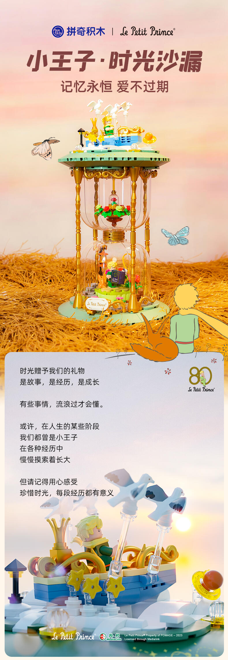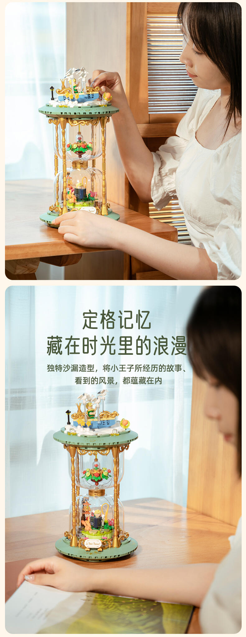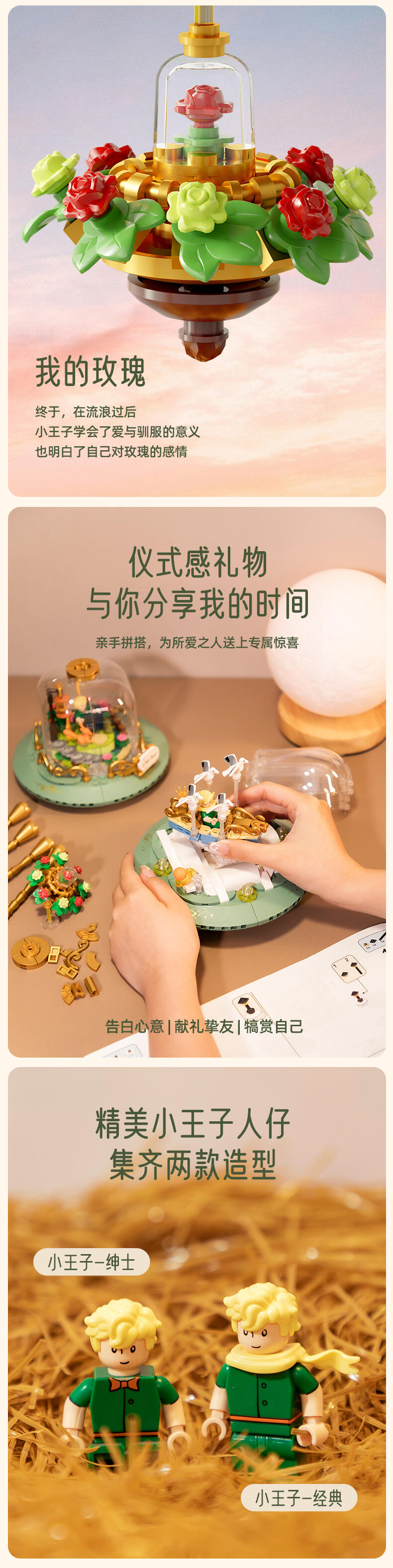 根据IP设定元素出发,以积木沙漏为载体,分为上、中、下三个部分,结合精致的二创小场景来唤醒用户对小王子、狐狸和玫瑰之间的故事画面感。顶部场景通过梦幻童话的氛围感来开启小王子的星空之旅程;中部场景运用了精致花环的衬托来彰显“唯一的玫瑰”。底部场景,用积木描绘出小王子向狐狸讲述自己的往事画面,营造 “睡前故事”的温馨感来表达彼此“驯化”后的亲密关系。