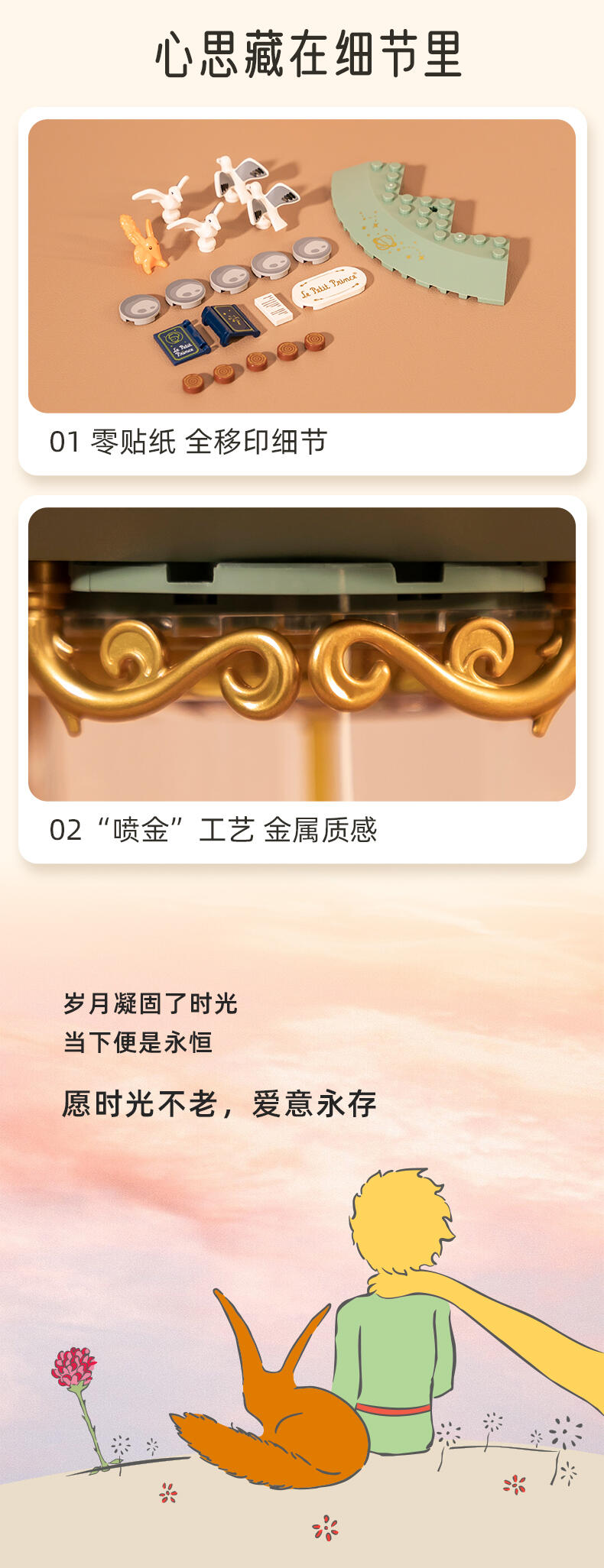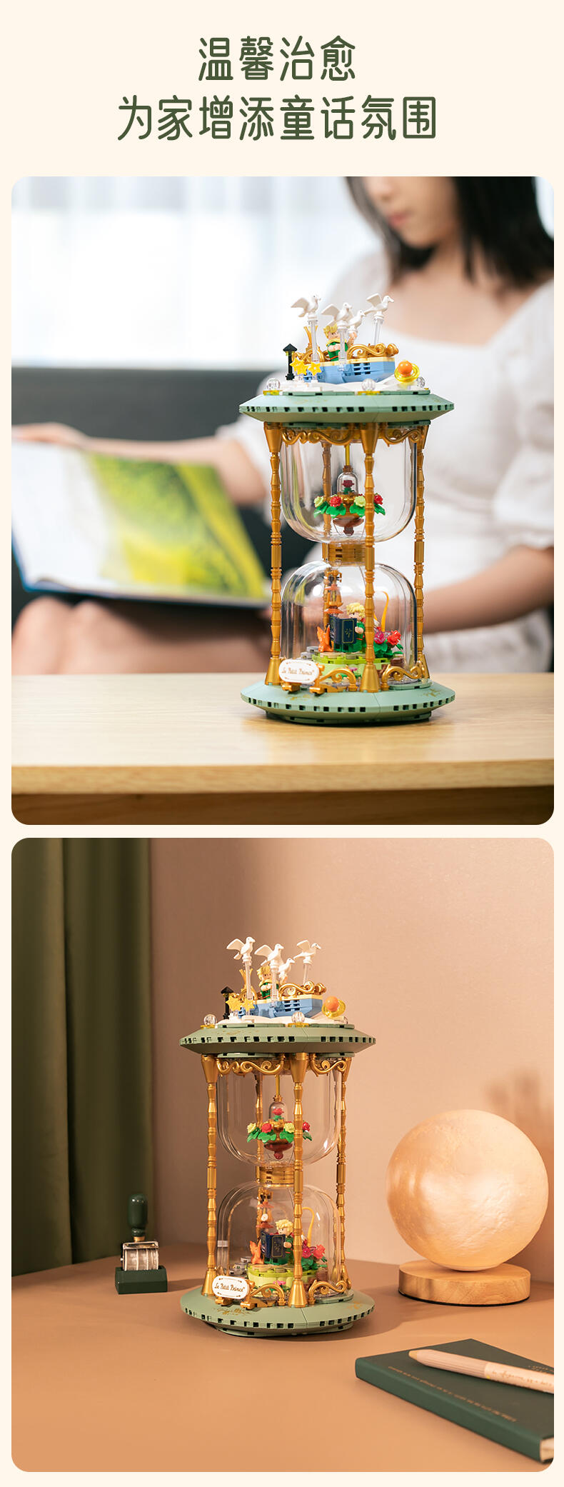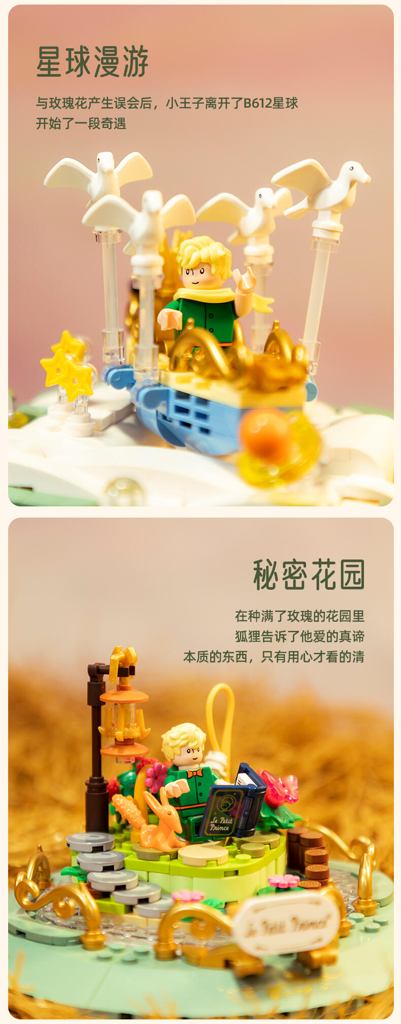 根据IP设定元素出发,以积木沙漏为载体,分为上、中、下三个部分,结合精致的二创小场景来唤醒用户对小王子、狐狸和玫瑰之间的故事画面感。顶部场景通过梦幻童话的氛围感来开启小王子的星空之旅程;中部场景运用了精致花环的衬托来彰显“唯一的玫瑰”。底部场景,用积木描绘出小王子向狐狸讲述自己的往事画面,营造 “睡前故事”的温馨感来表达彼此“驯化”后的亲密关系。