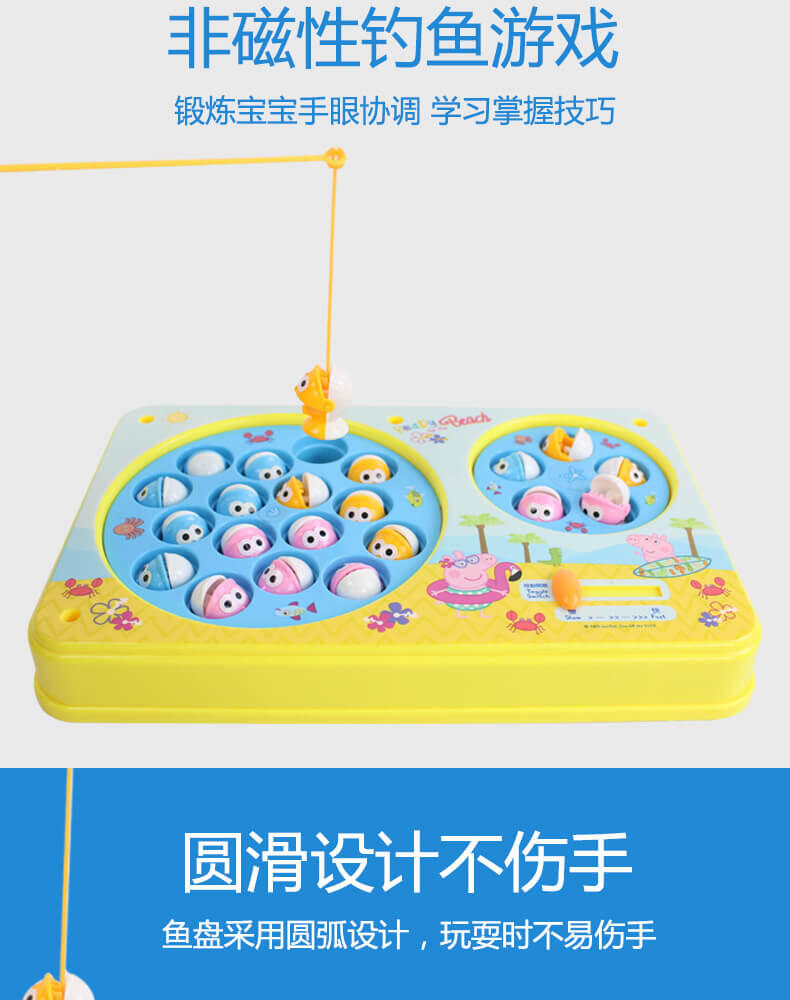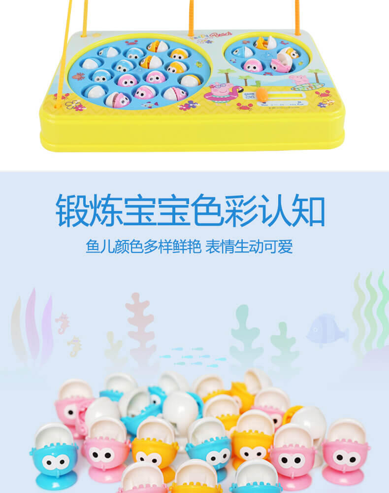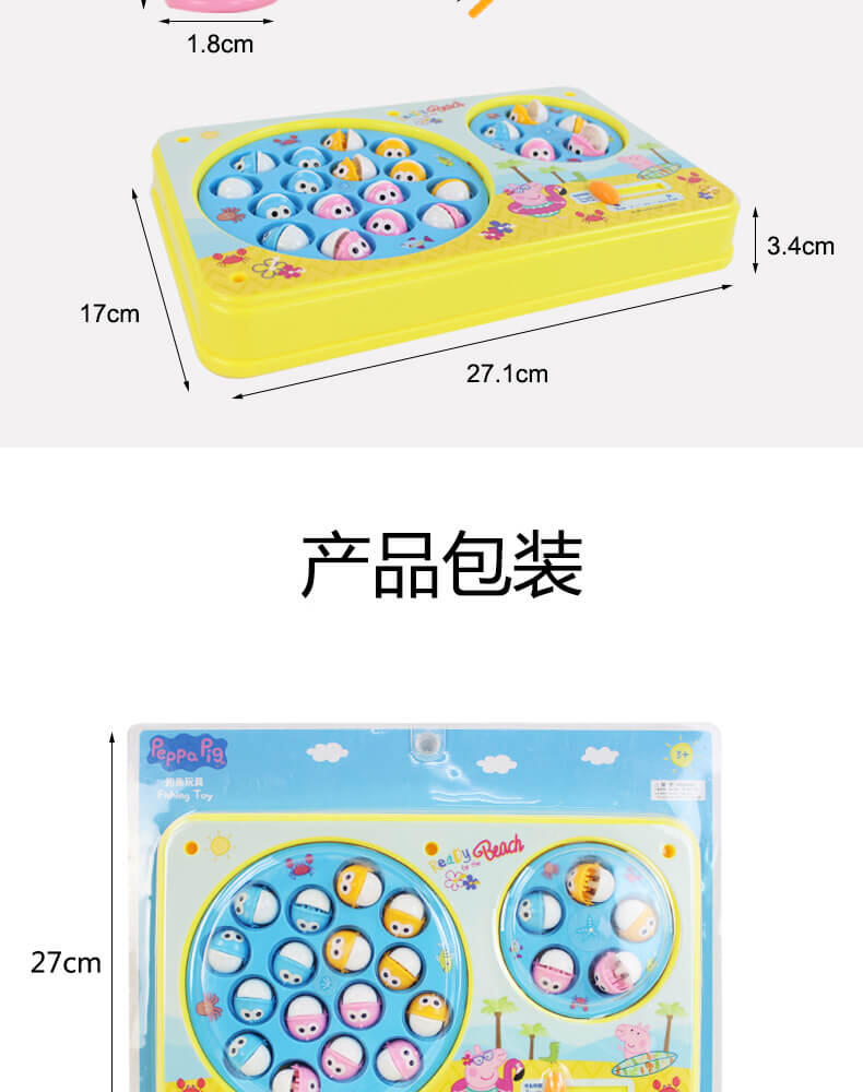 小猪佩奇钓鱼玩具包含一大一小两个钓鱼盘,大的钓鱼盘,可以利用磁吸的原理来玩耍。