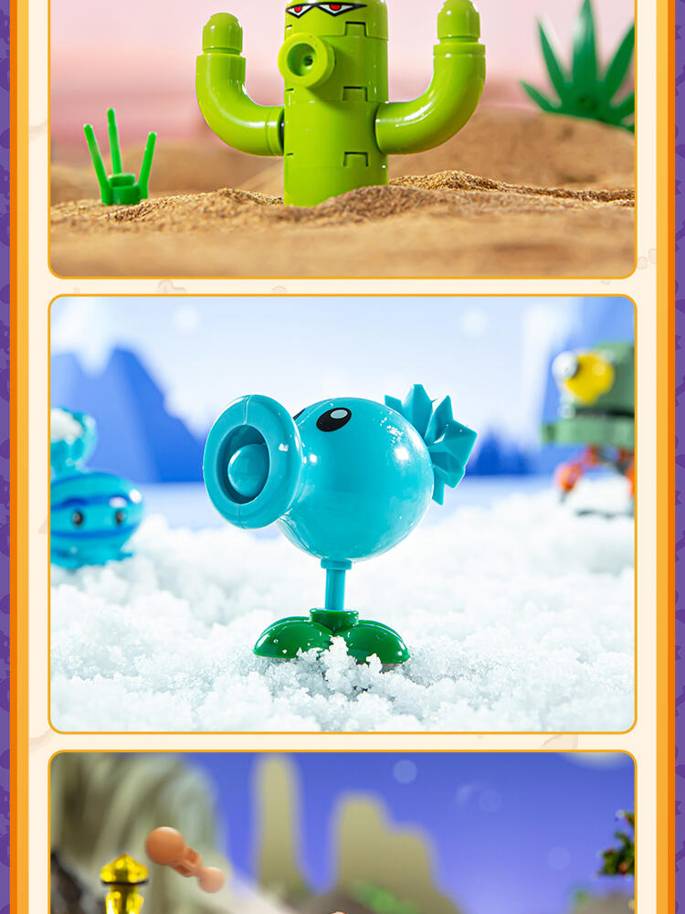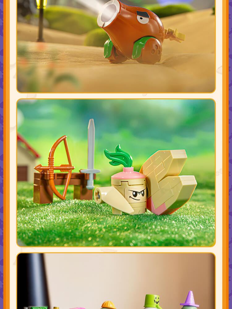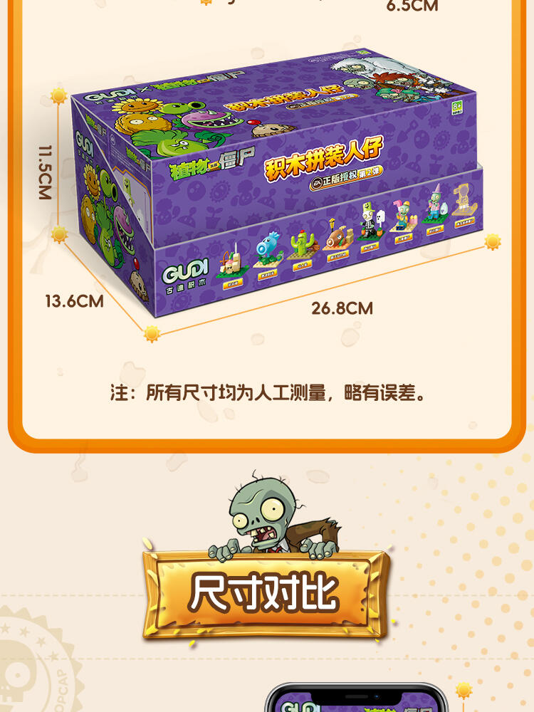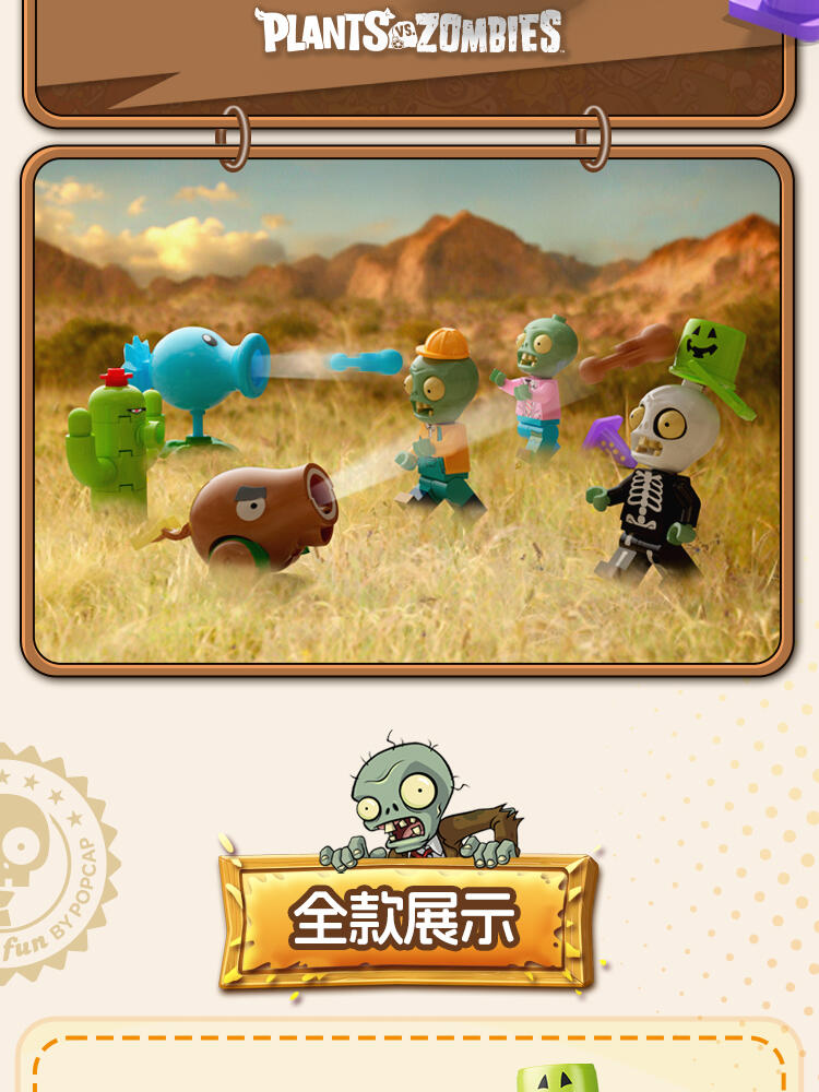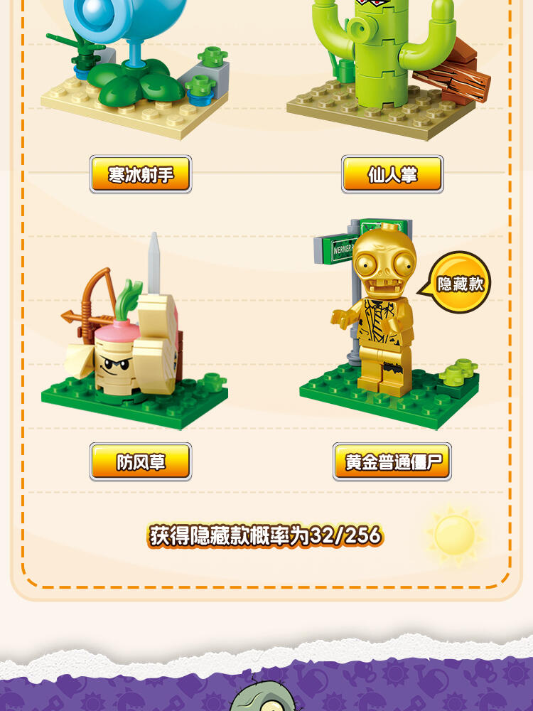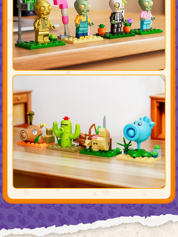 "产品以盲盒呈现,设有8款植物大战僵尸人仔。 一个展示盒内含8小盒,每小盒均采用人仔小场景的搭配,附带说明书1份。"