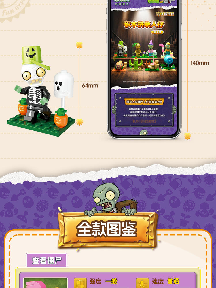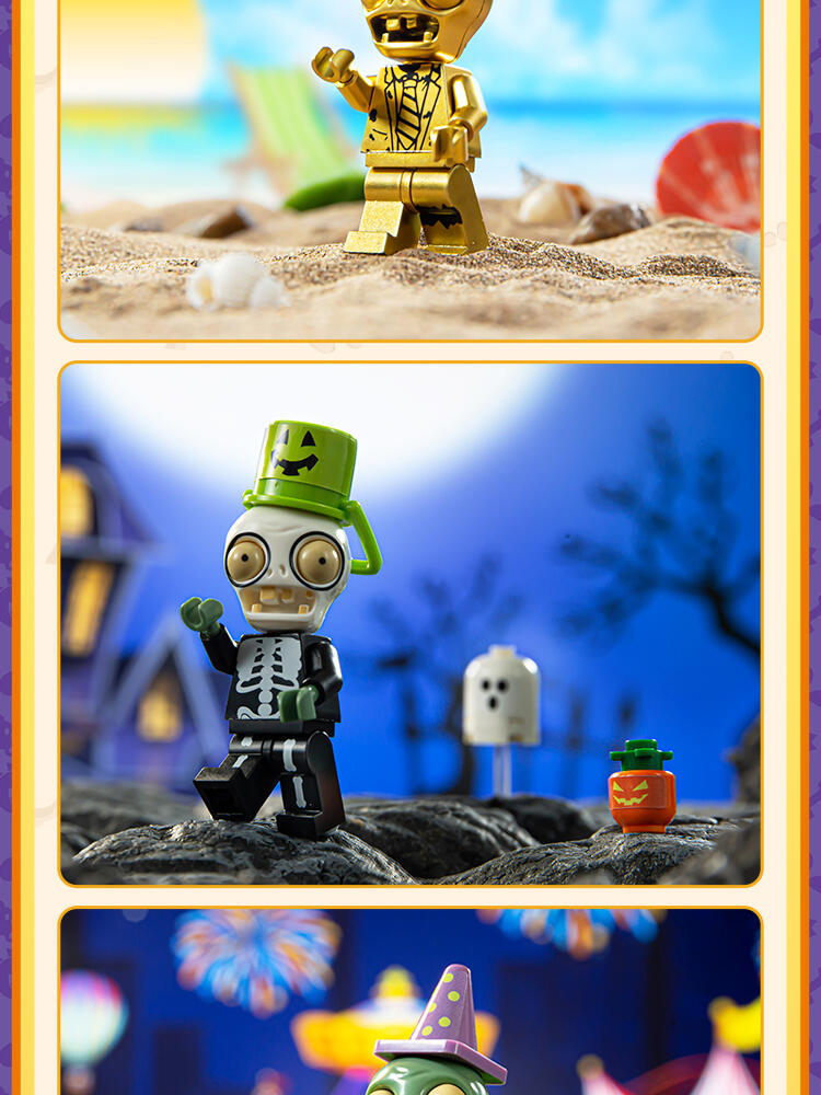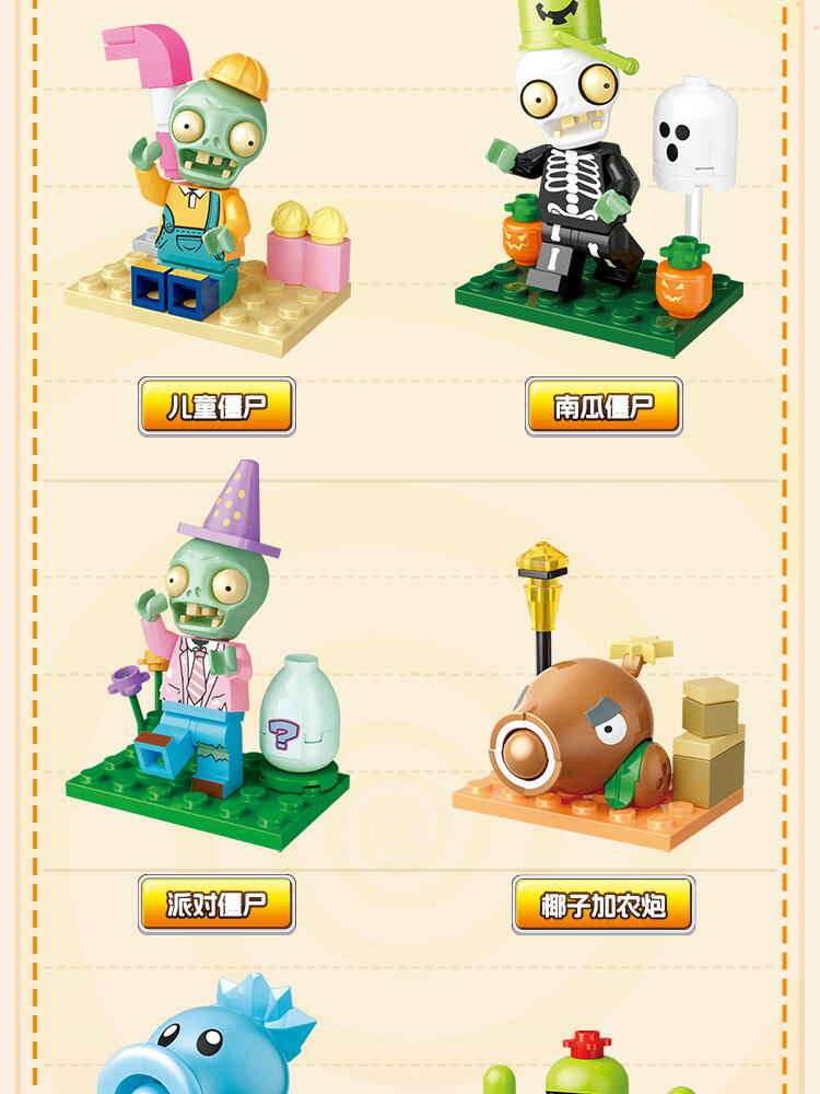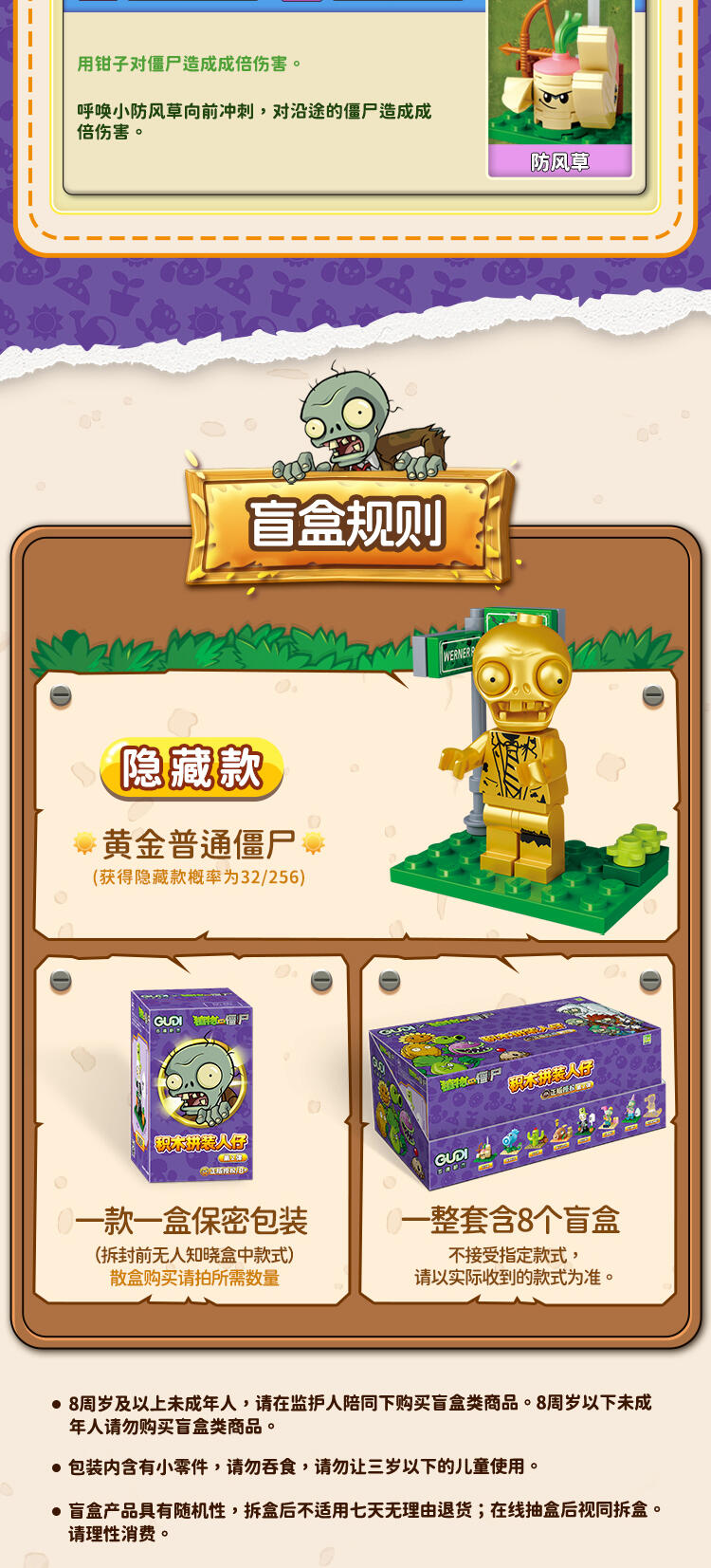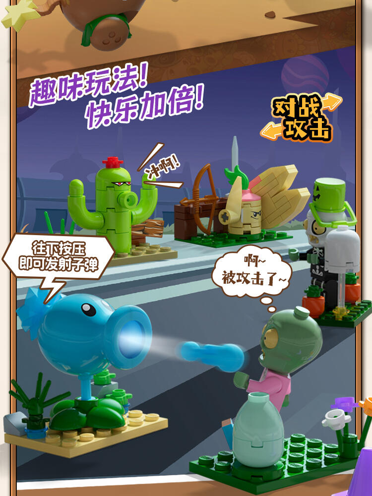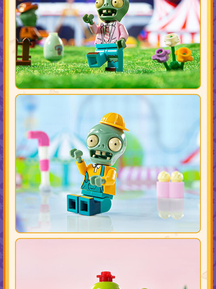 "产品以盲盒呈现,设有8款植物大战僵尸人仔。 一个展示盒内含8小盒,每小盒均采用人仔小场景的搭配,附带说明书1份。"