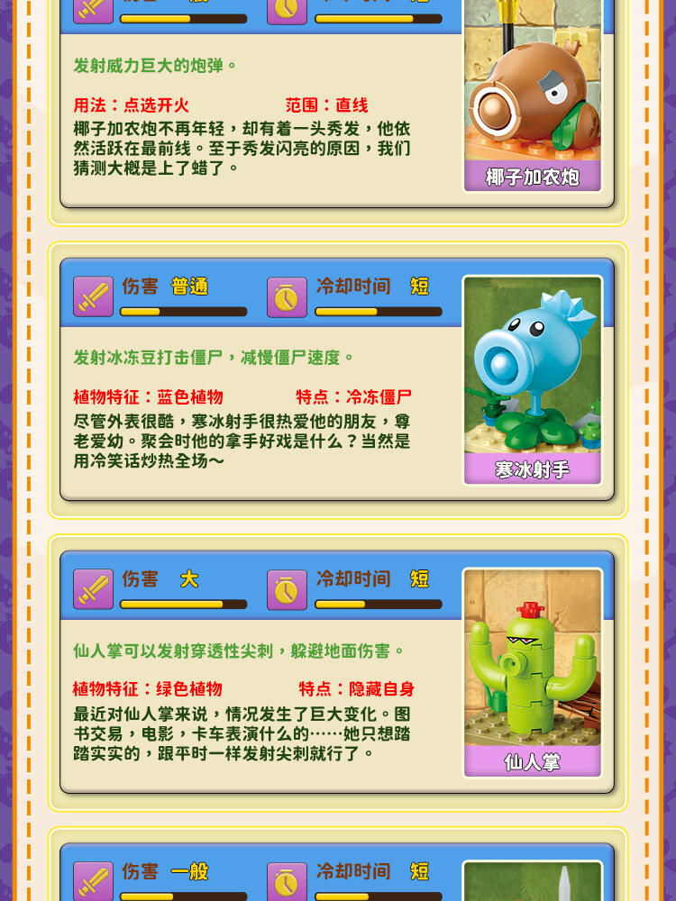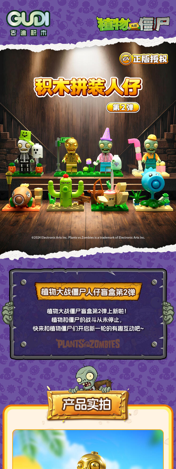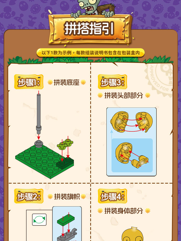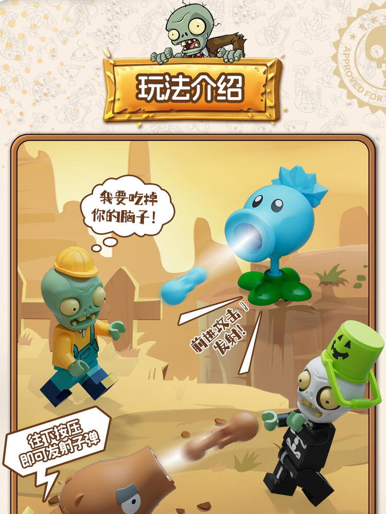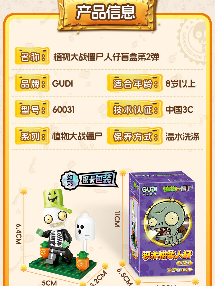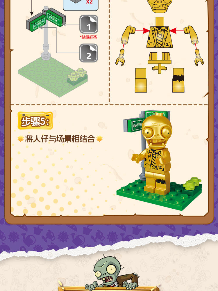 "产品以盲盒呈现,设有8款植物大战僵尸人仔。 一个展示盒内含8小盒,每小盒均采用人仔小场景的搭配,附带说明书1份。"