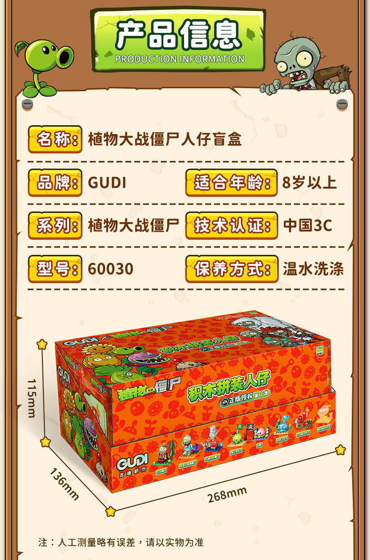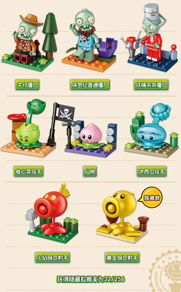 植物大战僵尸正版授权,产品一共八款,端盒不重复,其中三款为植物大战僵尸高人气僵尸角色,四款为高人气植物角色,豌豆射手子弹可发射,隐藏款为黄金豌豆射手。 隐藏款:黄金豌豆射手:32/256