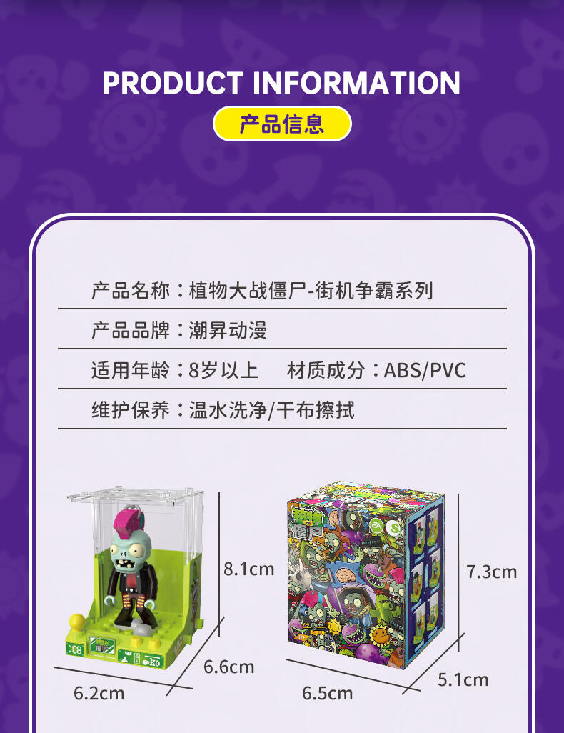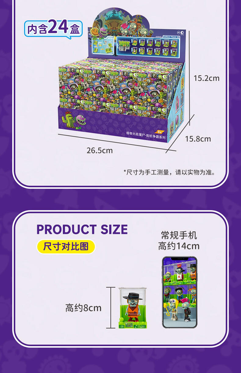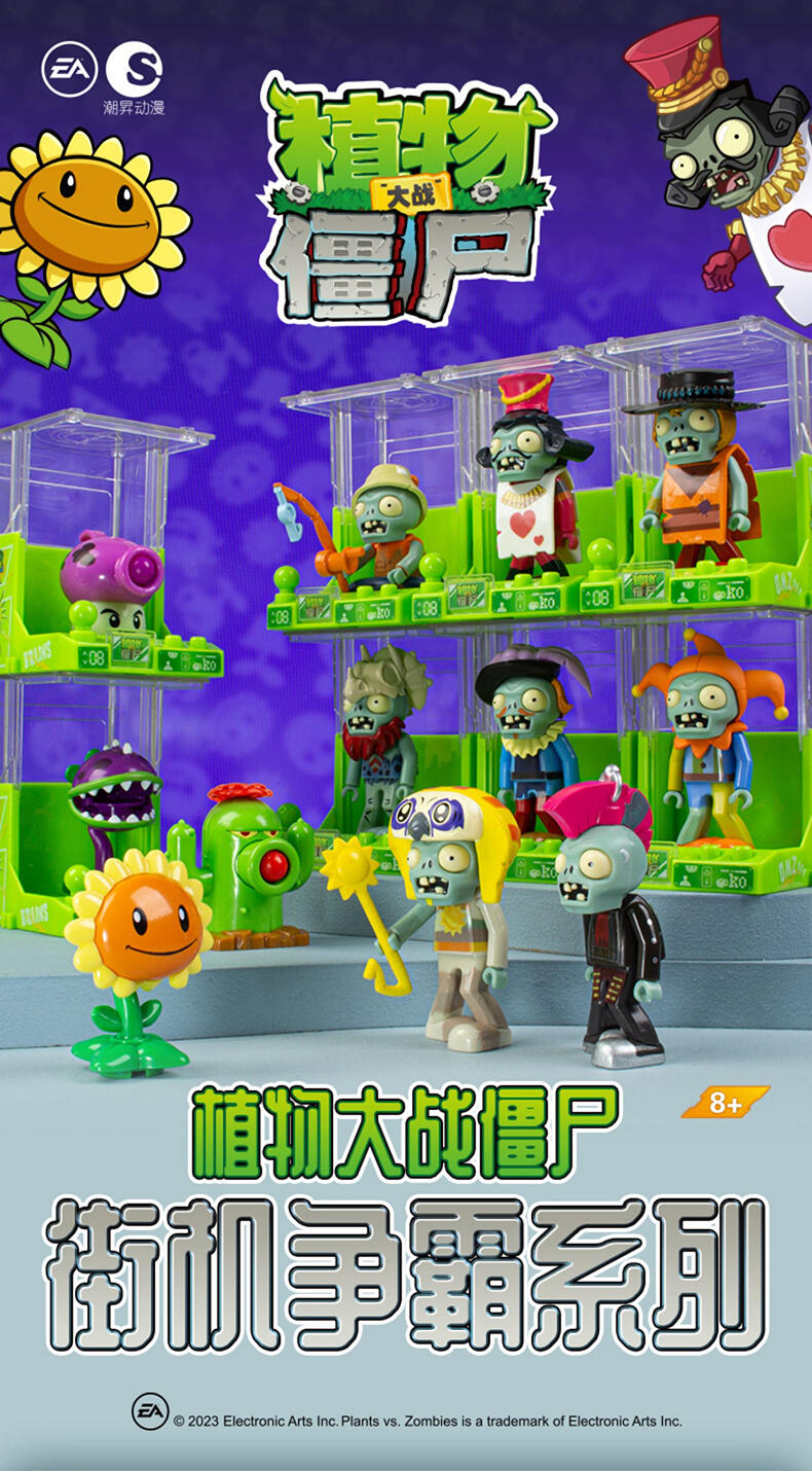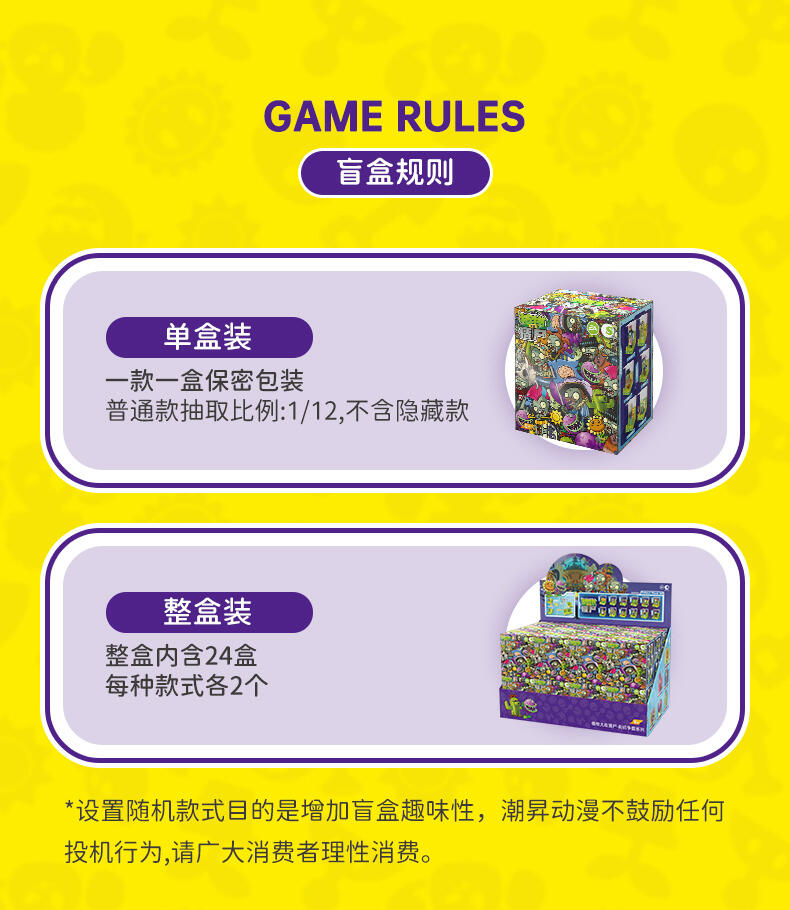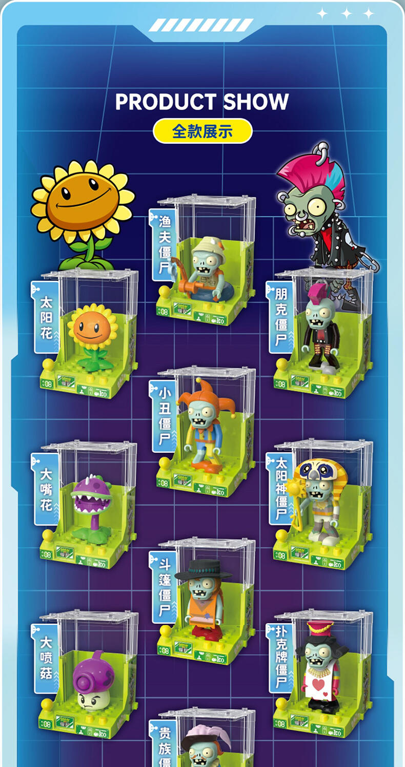 还原动画片角色人偶造型,居家、车载摆设玩偶,普通款抽取比例为1/12,没有隐藏款,植物形象均有弹射功能,外盒可进行积木拼搭联动玩法,