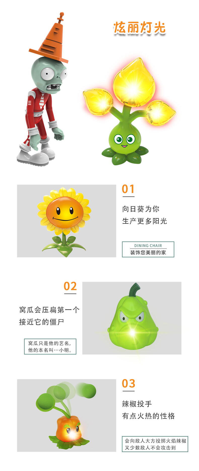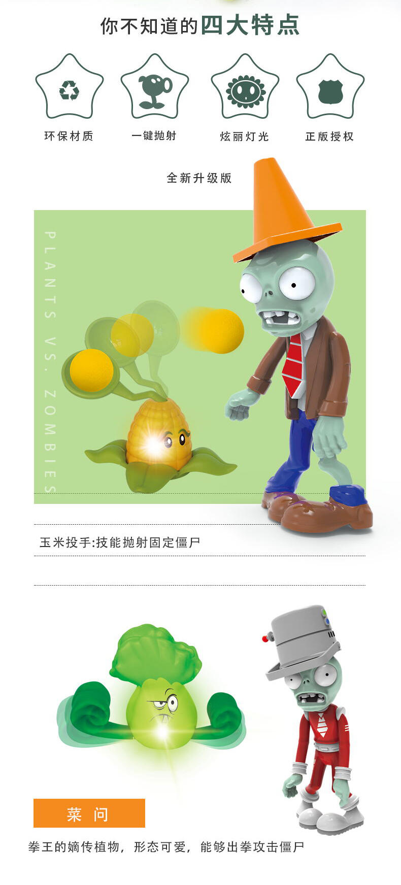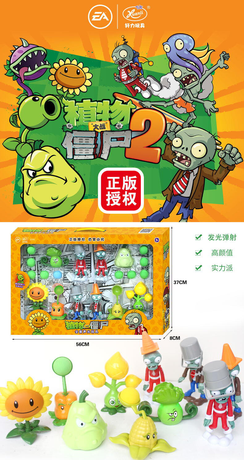 植物大战僵尸,由EA正版授权,产品造型卡通可爱,颜色鲜艳活泼,功能多,款式多。产品做工精细,采用环保材料制作而成,深度还原了游戏里面的人物形象,每个植物玩具都增加了灯光功能。