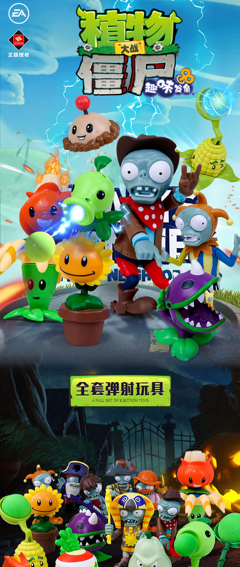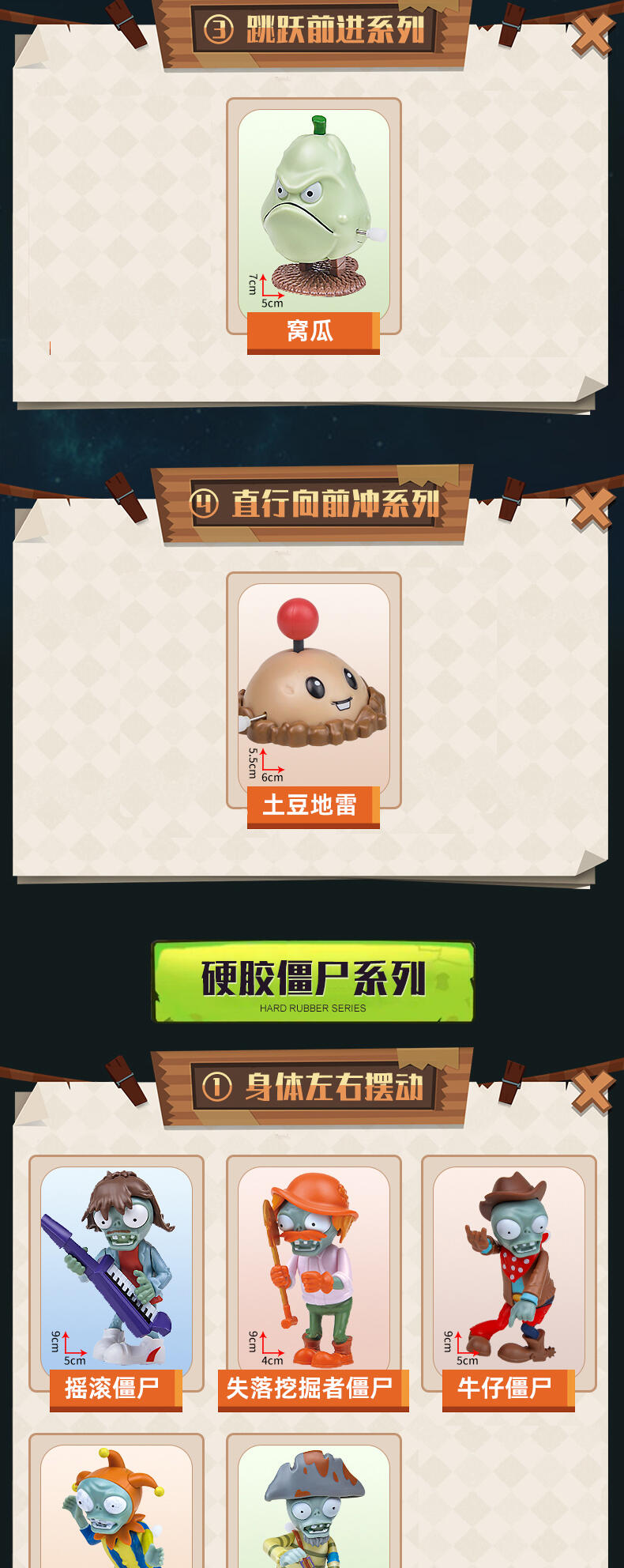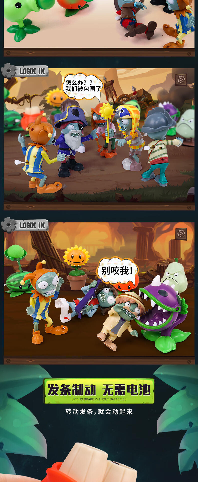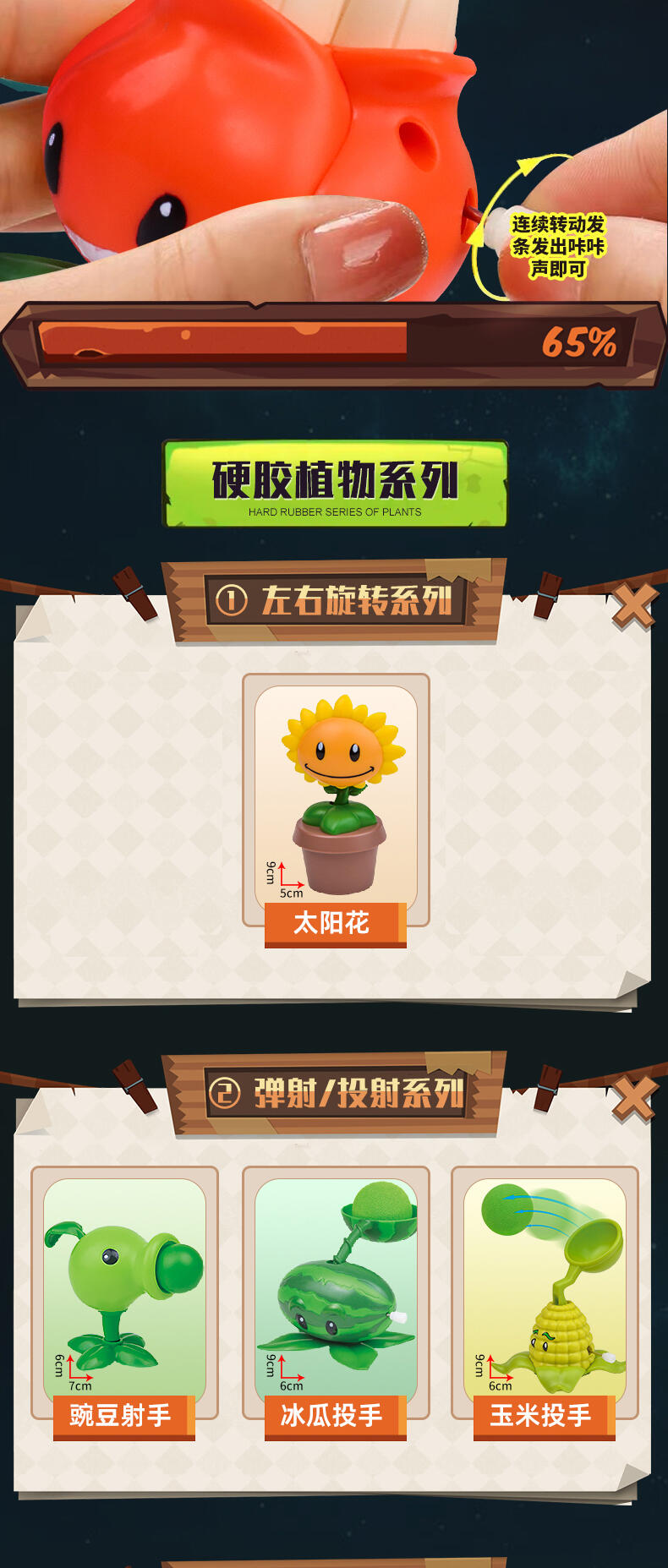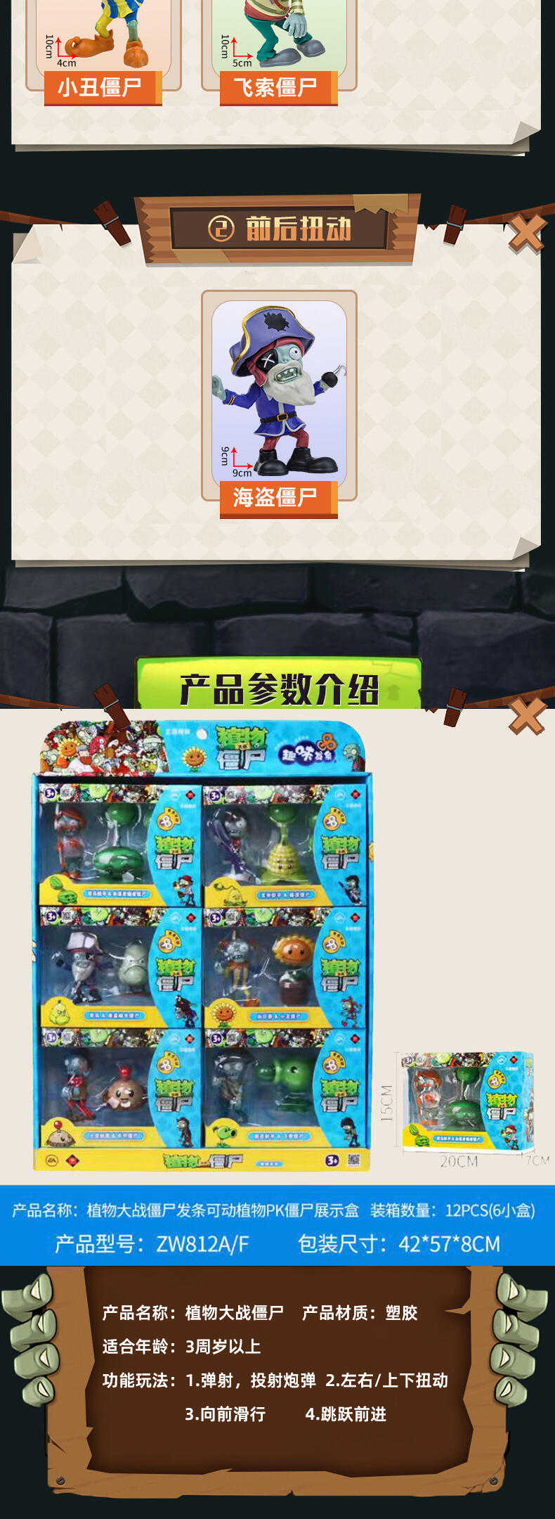 植物大战僵尸具有正版授权,外观造型设计高度还原,玩法新颖(发条提供动力),植物/僵尸(左右旋转摆动,弹射,投射,跳跃前进,直行前进,身体左右摆动,前后扭动)环保无毒材质,做工精致。每款产品配备(1僵尸+1植物)。