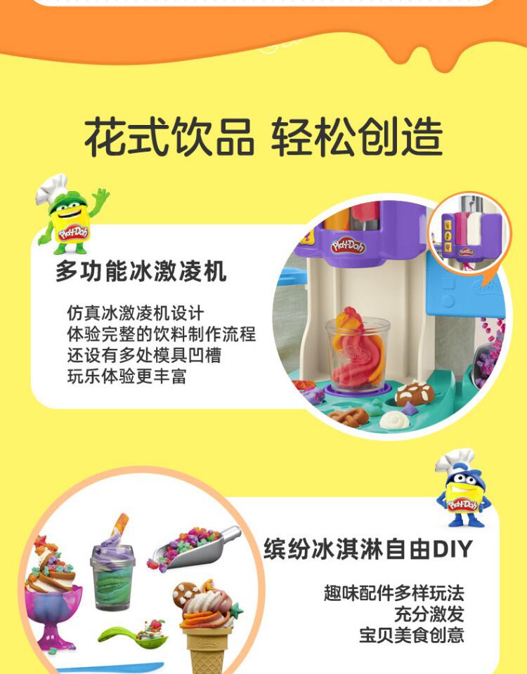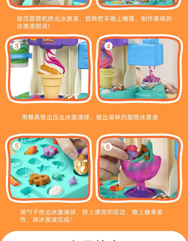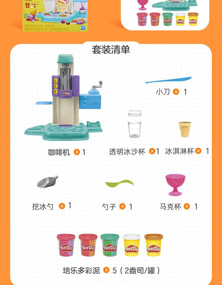 用play Doh彩虹漩涡冰淇淋游戏机旋转到富有想象力的游戏中!在机器上装载两种或多种Play Doh颜色,按下手柄,在旋转的杯子或圆锥体中装满彩虹边的假软发球。制作假撒和其他Play Doh食物,如假椒盐卷饼、奇异的水果和疯狂的糖果杯来装饰创意。这个玩具冰淇淋套装配有一把勺子、一把玩具刀、一把洒勺、一个盘子、一个圆锥体和一个带盖子的杯子,所以孩子们可以在假装的冰淇淋店里玩,想象一下他们的play Doh创意。这款Play Doh套装包括284克(10盎司)的Play Doh造型化合物,包括三个制作多色漩涡和装饰的双色罐。像这样的玩具厨房用具Play Doh儿童厨房套装是3岁女孩、男孩及以上的绝佳礼物。PLAY-DOH和HASBRO以及所有相关商标和徽标均为HASBRO,股份有限公司的商标。