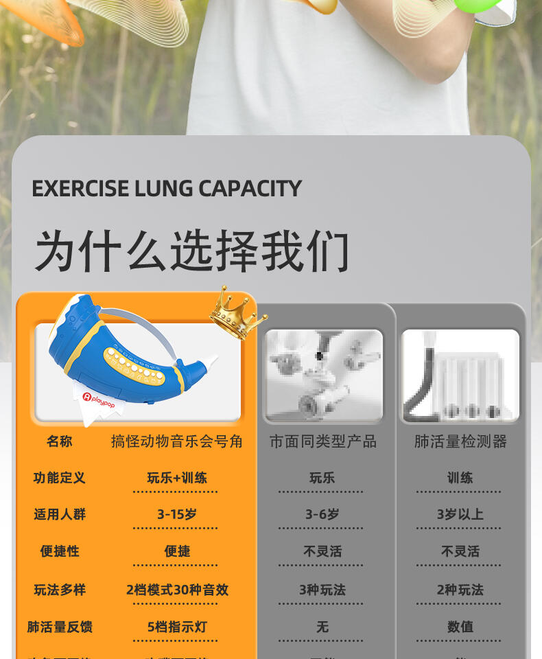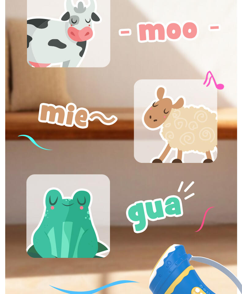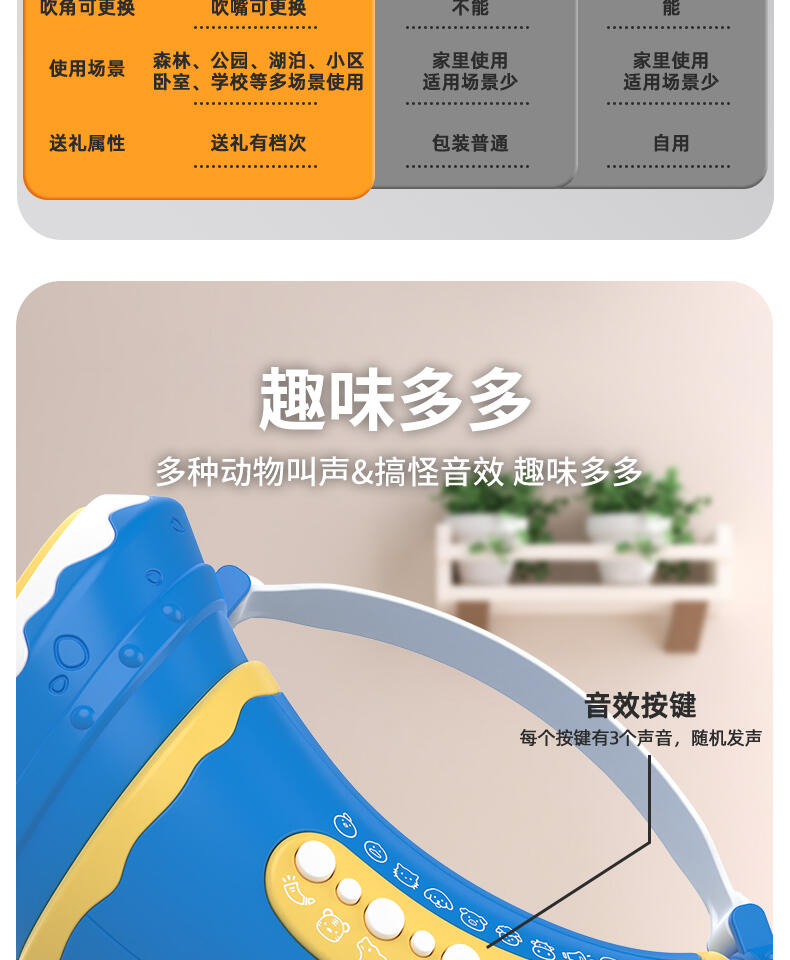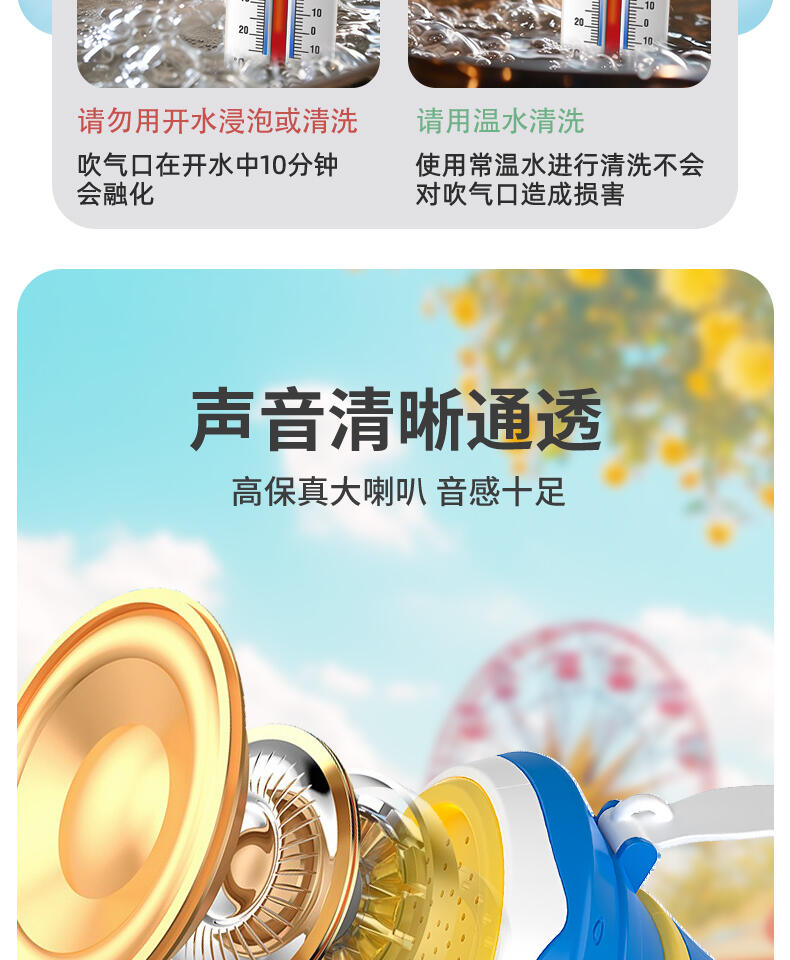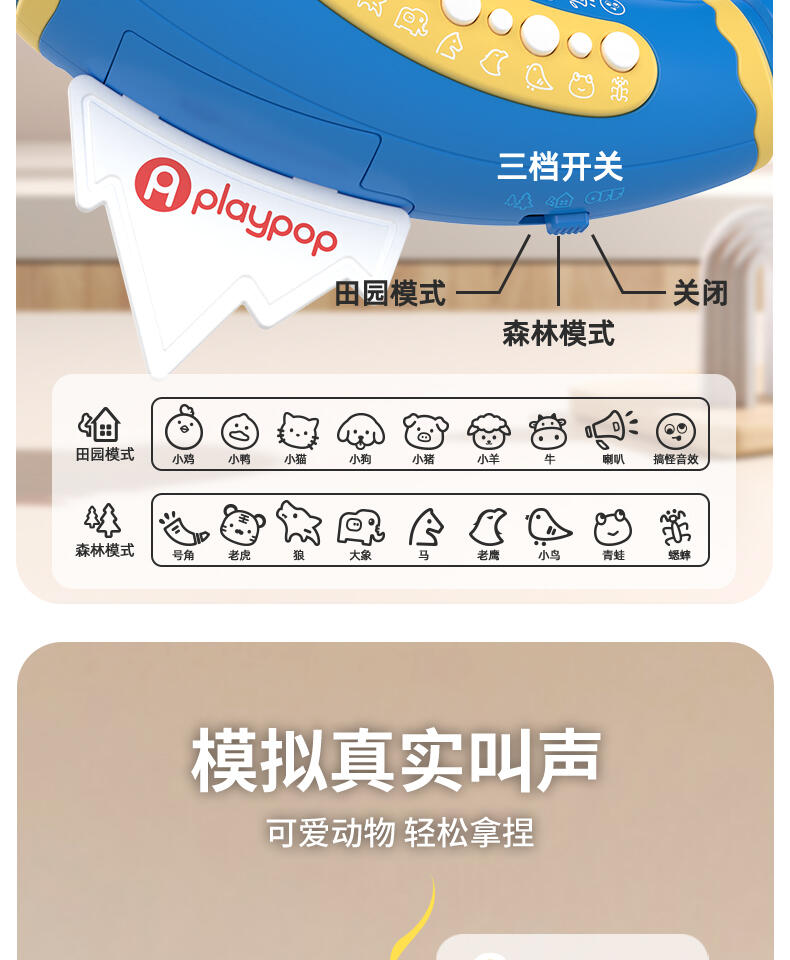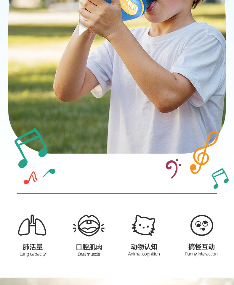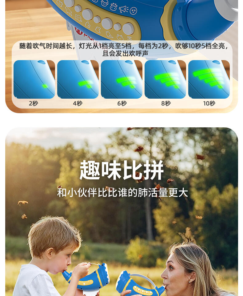 1. 30种动物&搞怪音效,通过吹气发出神奇的声音。 2. 两种模式切换森林/田园动物,摁下按钮快速切换选择声效。 认知学习动物的真实声音。 3. 肺活量练习。挑战模式隐藏玩法:吹起20秒逐步亮灯,5盏满灯触发奖励欢呼。 4. 外形符合人体工程学设计,抓握轻松便利。 5. 大功率扬声器,声音通透清晰。 6. 背带+手提,携带方便。 7. 双吹嘴替换,清洗方便。