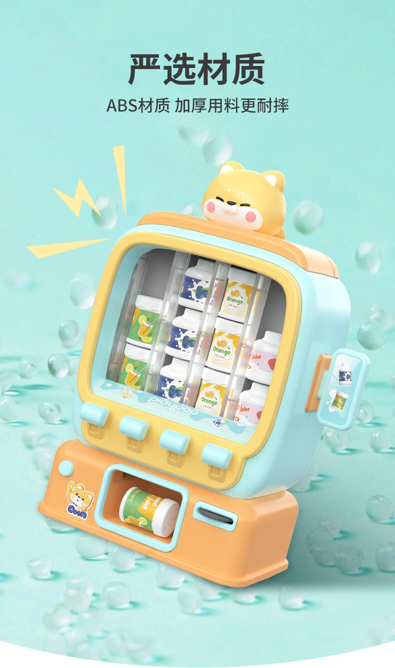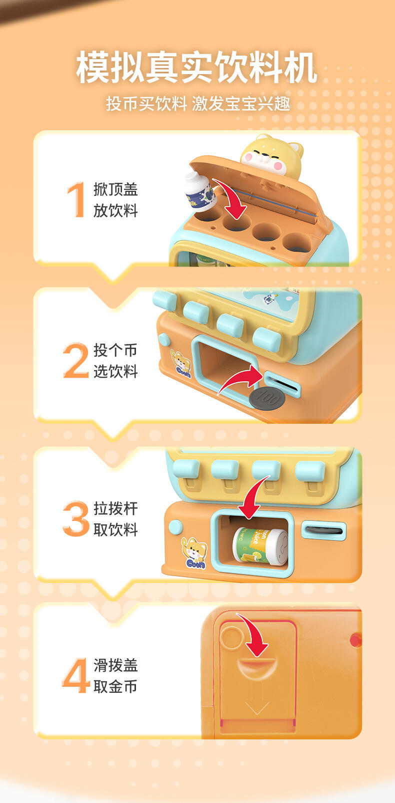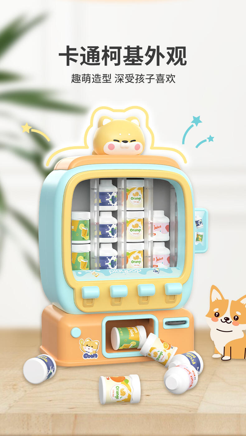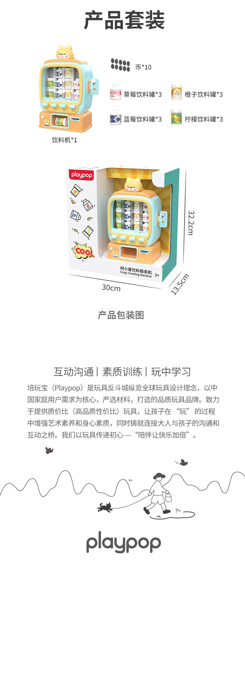 1. 模拟真实饮料机,投币后选择想要的饮料,拉动对应操作杆选取饮料。 2. 可爱的卡通柯基外观。 3. 全景透明橱窗,搭配灯光音效,体验感满满。 4. 丰富的配件,让小朋友认知更多事物。5. ABS材质,加厚用料更耐摔。