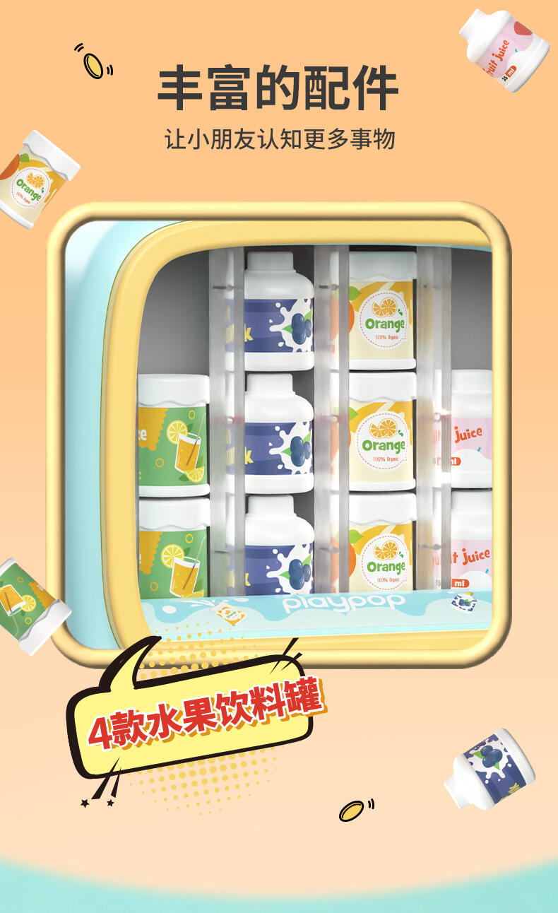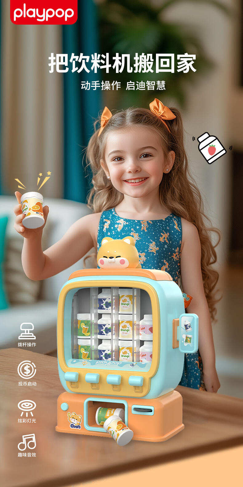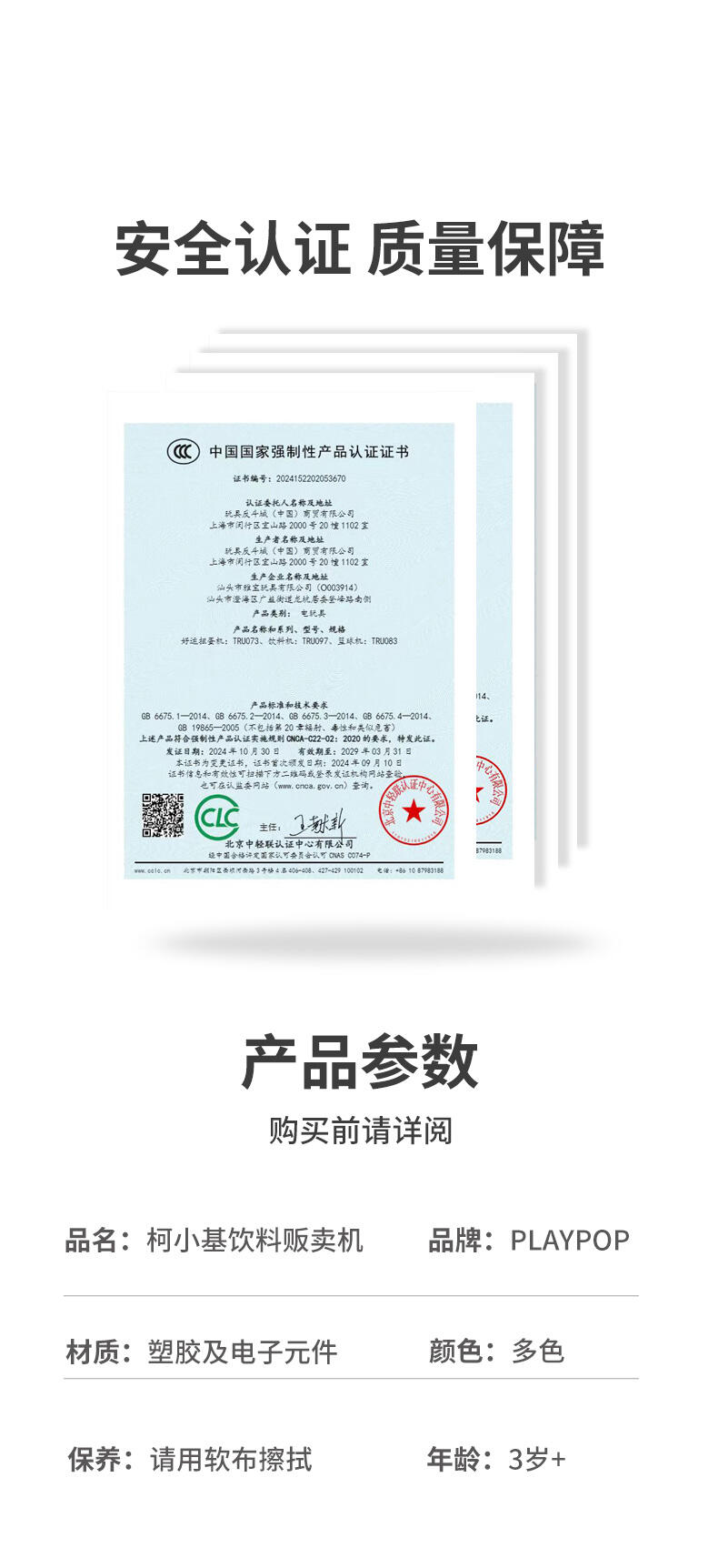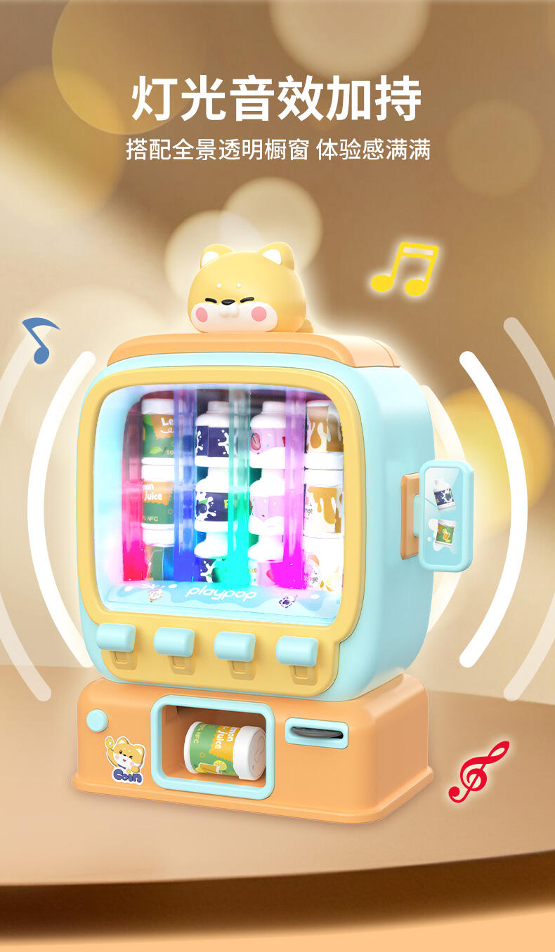 1. 模拟真实饮料机,投币后选择想要的饮料,拉动对应操作杆选取饮料。 2. 可爱的卡通柯基外观。 3. 全景透明橱窗,搭配灯光音效,体验感满满。 4. 丰富的配件,让小朋友认知更多事物。5. ABS材质,加厚用料更耐摔。