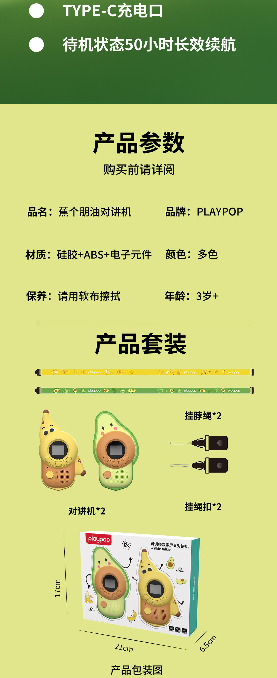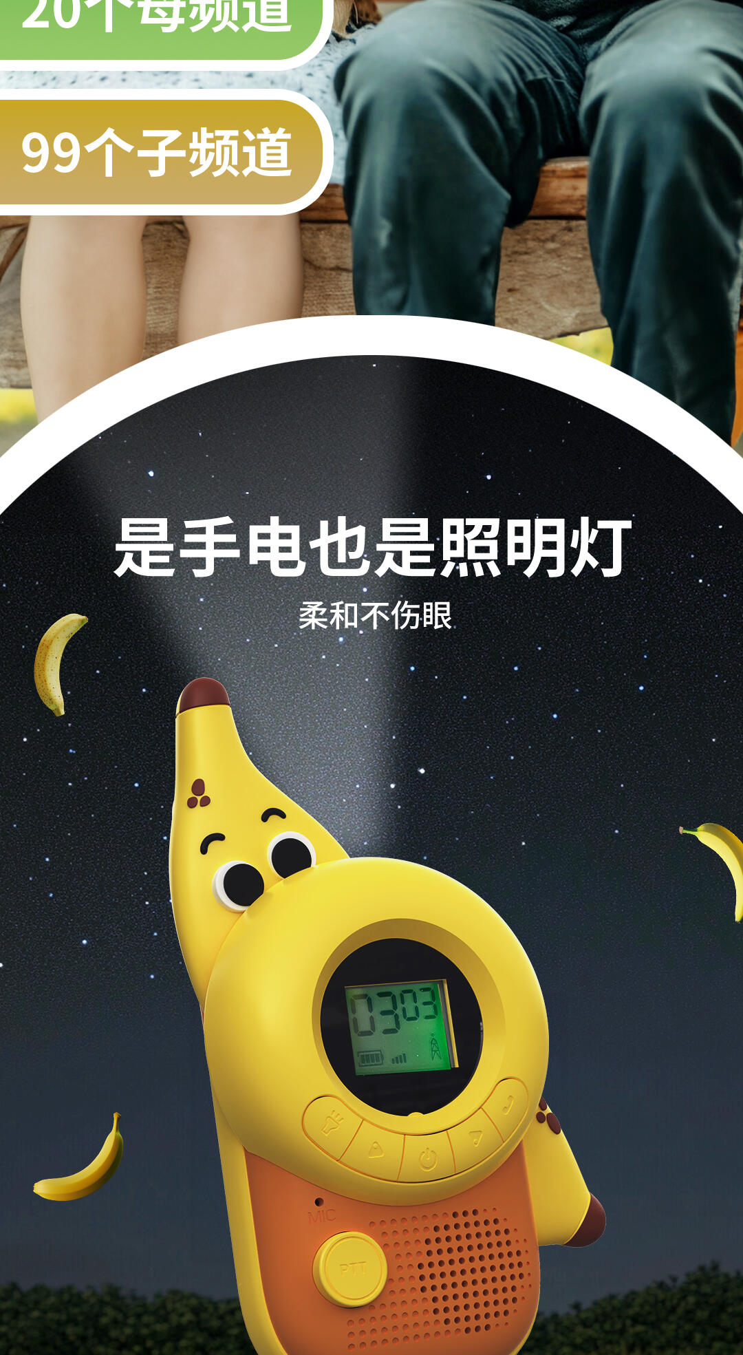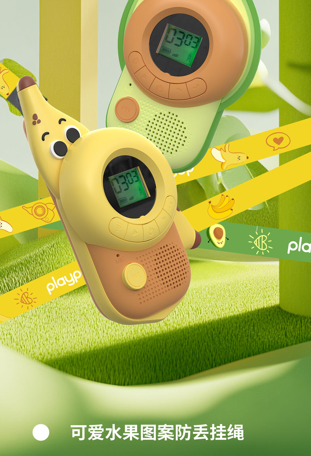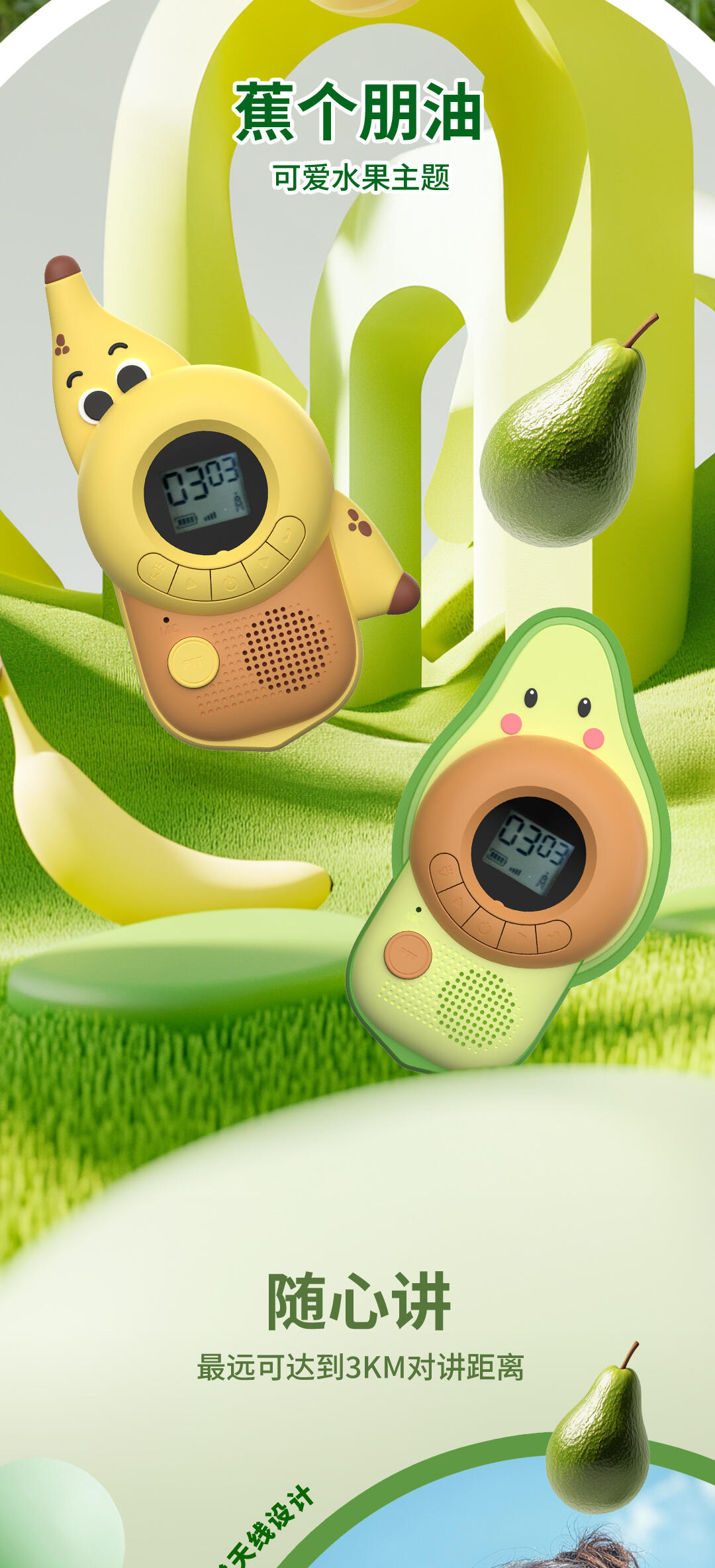 1. 最远可达到 3km 对讲距离,穿透力强,接收灵敏度高。 注:实际距离与使用环境有关。 2. 内置 20 个母频道,每个母频道有 99 个子频道,可设置专属队伍频道,兼 顾多人同时对讲与私密性。 3. 隐藏式天线设计,更美观。 4. 以牛油果和香蕉为可爱水果主题,让小伙伴们“蕉个朋油” ,拉近距离 5. 背扣设计,方便携带,防绕颈锁扣挂绳,更安全。 6. 内置手电功能,柔和不伤眼,是手电也是照明灯 7. 500mAh 内置锂电,待机状态 50 小时长效续航,外置 Type-C 充电口, 无需拆装电池 8. 音量可调节,高清喇叭不伤耳