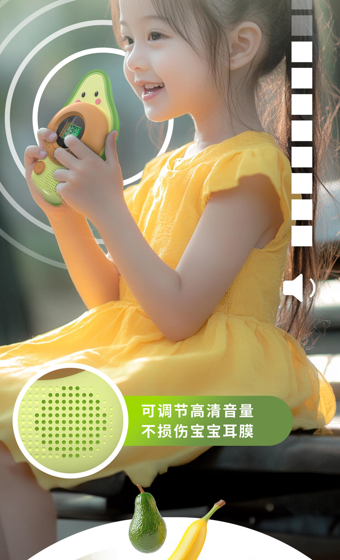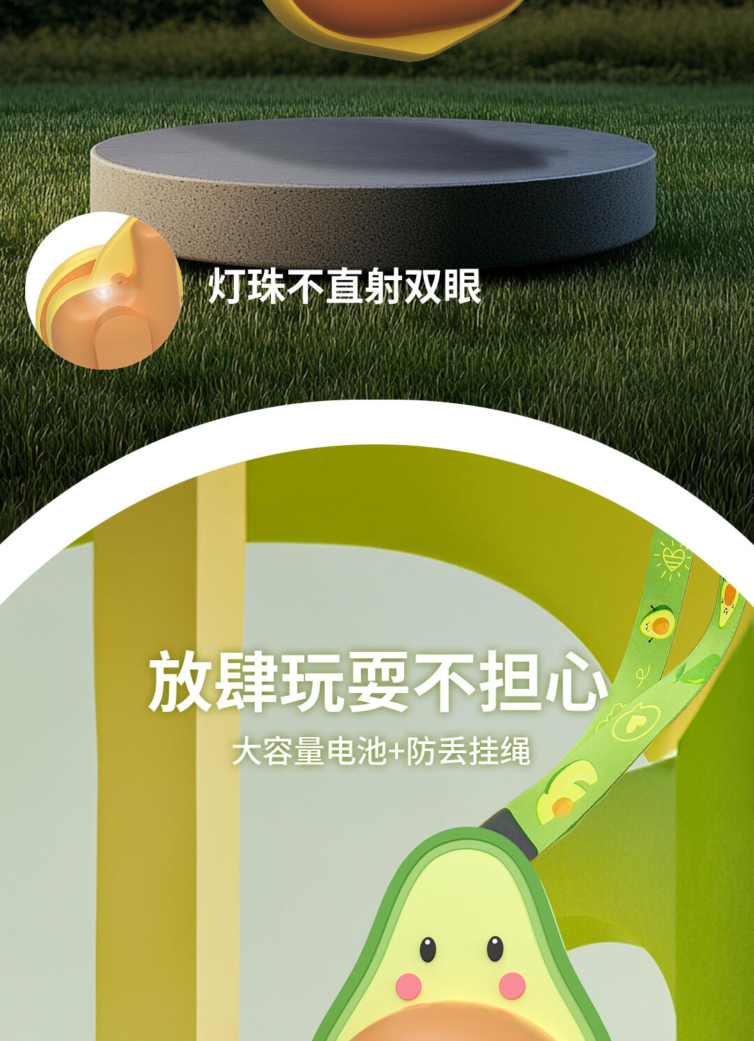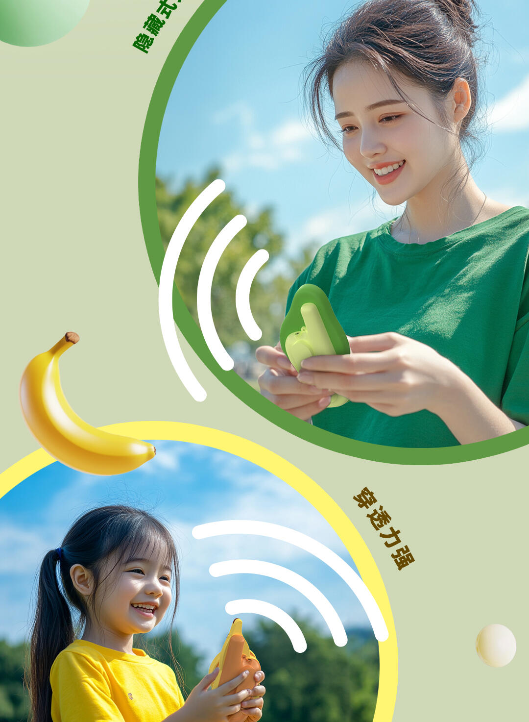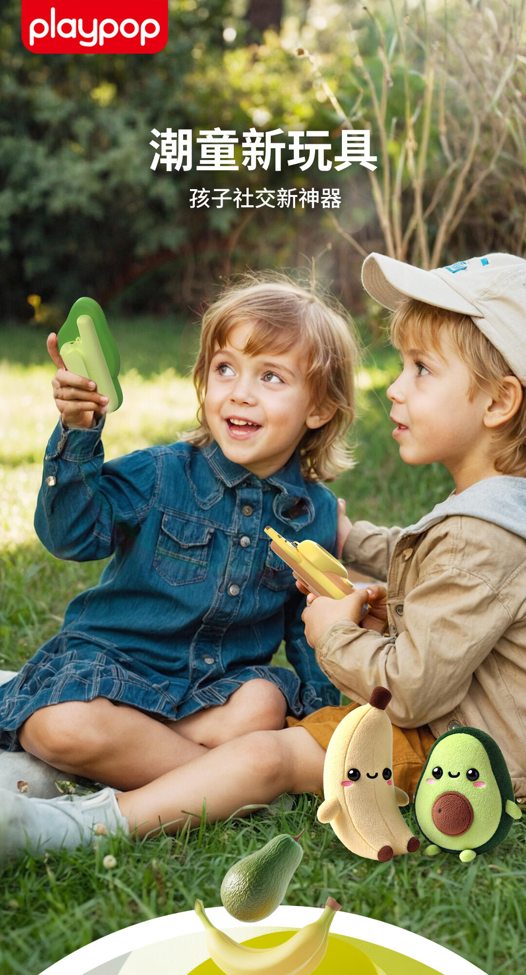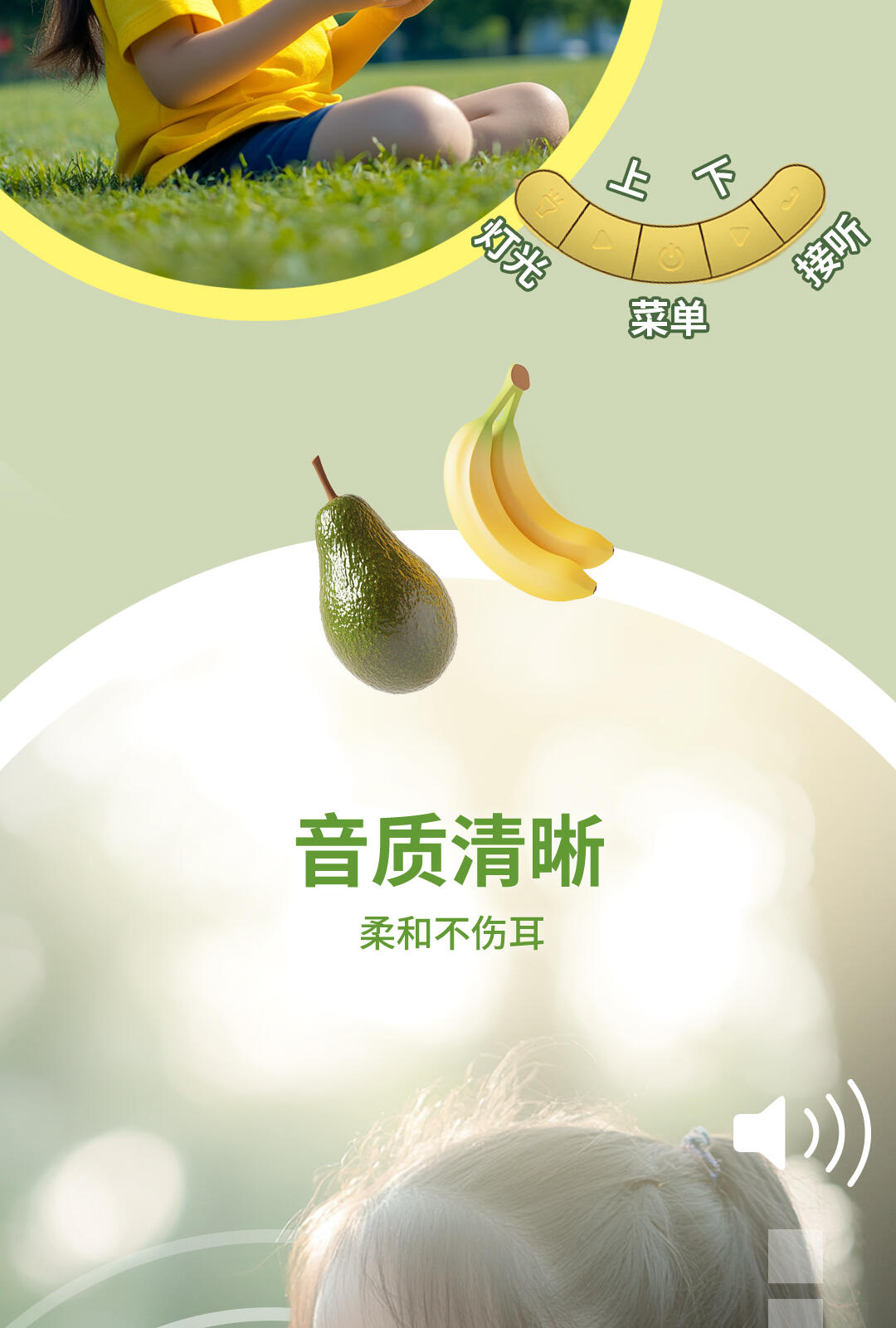 1. 最远可达到 3km 对讲距离,穿透力强,接收灵敏度高。 注:实际距离与使用环境有关。 2. 内置 20 个母频道,每个母频道有 99 个子频道,可设置专属队伍频道,兼 顾多人同时对讲与私密性。 3. 隐藏式天线设计,更美观。 4. 以牛油果和香蕉为可爱水果主题,让小伙伴们“蕉个朋油” ,拉近距离 5. 背扣设计,方便携带,防绕颈锁扣挂绳,更安全。 6. 内置手电功能,柔和不伤眼,是手电也是照明灯 7. 500mAh 内置锂电,待机状态 50 小时长效续航,外置 Type-C 充电口, 无需拆装电池 8. 音量可调节,高清喇叭不伤耳