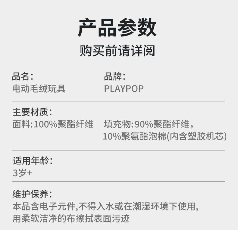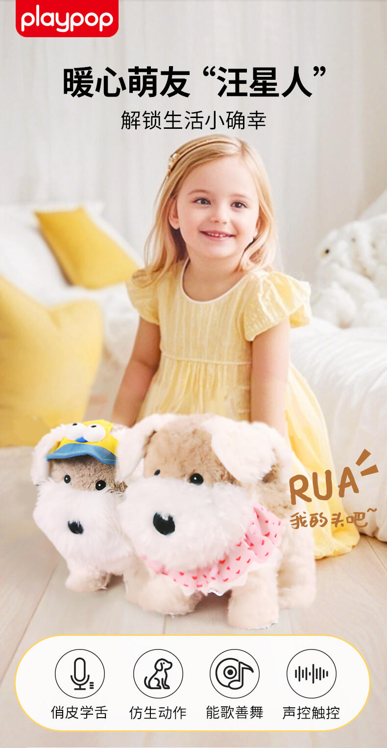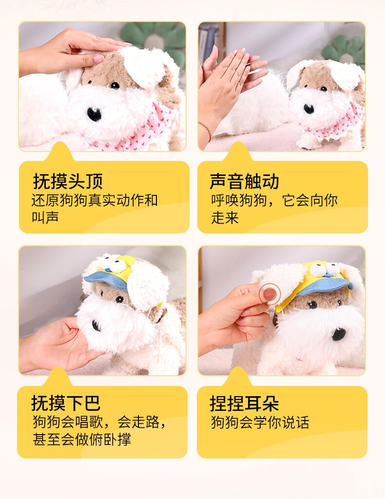 1. 精选羊羔绒,柔软顺滑,不扎皮肤;2.学舌功能,录制主人的声音并转换为童声播放;3. 抚摸头顶、下巴、大声喊狗狗,会触发做俯卧撑、摇摇头、摆摆尾,向主人走来等形象动作;4.可爱造型,仿生动作和声效,如同养了一只真实小宠