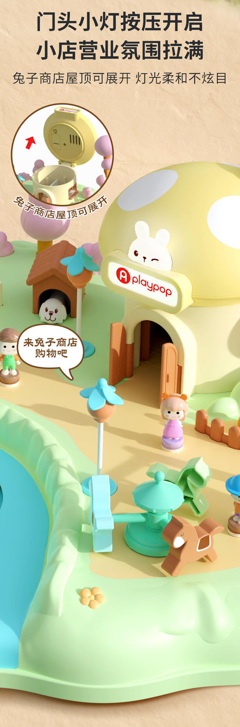 5. 兔子商店屋顶可展开,门头小灯可按压开启,小店开始营业!柔和不炫目