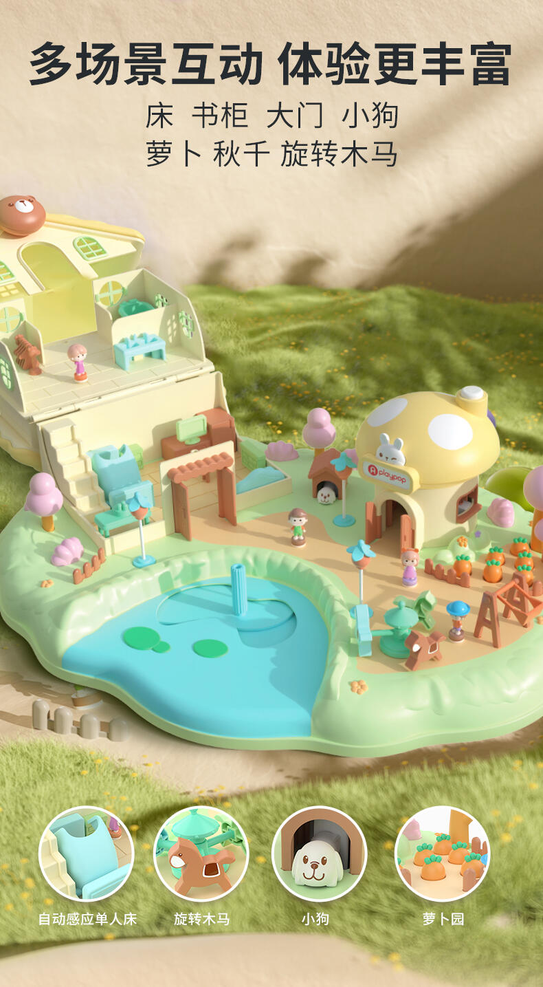 4.场景内具备几处惊喜互动设施(床、书柜、大门、小狗、萝卜、秋千、旋转木马);