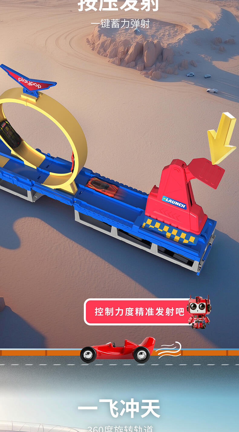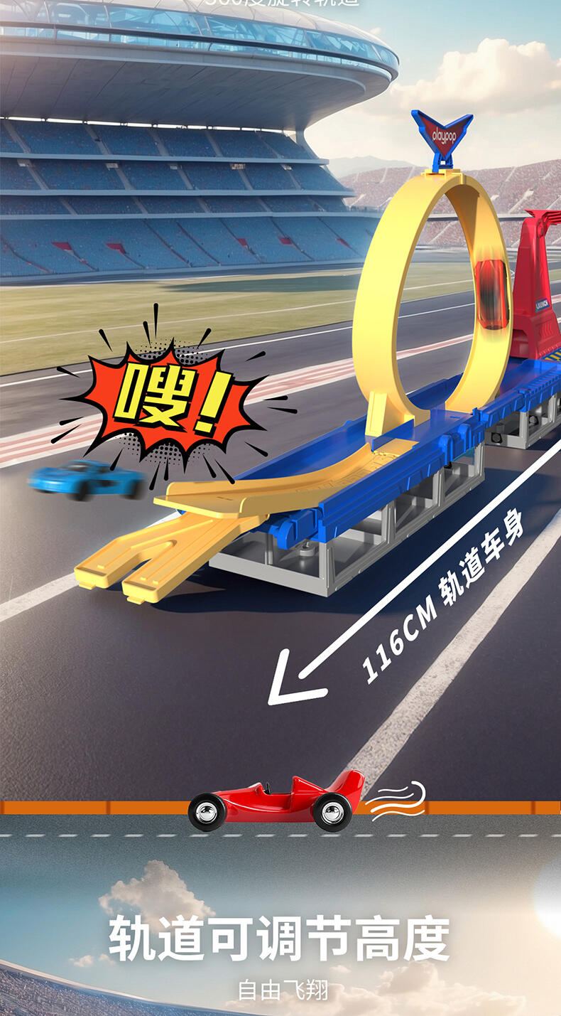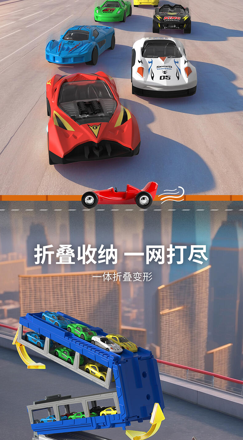 1. 一键弹射,用力一击将小车穿过360°回环轨道,进入轨道尽头,一飞冲天。;2. 可调节轨道终点高度,结合拍击力度,控制小车弹射高度进入不同篮筐。;3.折叠后仅一个抱枕大小,可至多存放18台小车,方便收纳。;4. 展开尺寸长达116cm,超长轨道。;5. 收纳后大车可惯性滑行,一推就走。