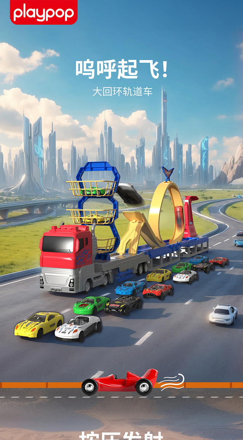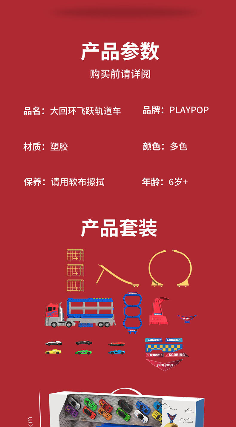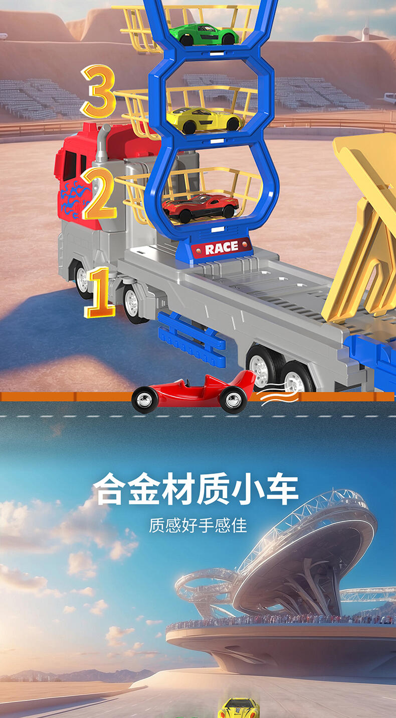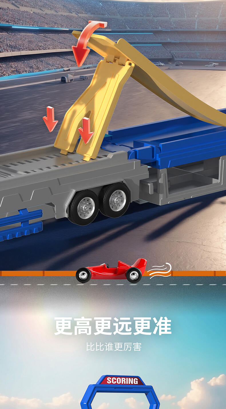 1. 一键弹射,用力一击将小车穿过360°回环轨道,进入轨道尽头,一飞冲天。;2. 可调节轨道终点高度,结合拍击力度,控制小车弹射高度进入不同篮筐。;3.折叠后仅一个抱枕大小,可至多存放18台小车,方便收纳。;4. 展开尺寸长达116cm,超长轨道。;5. 收纳后大车可惯性滑行,一推就走。