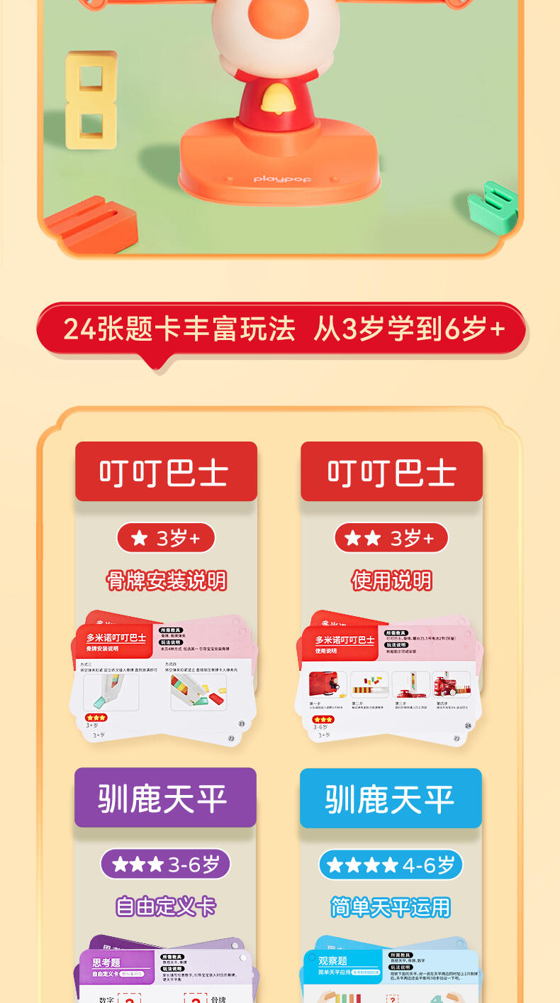 天平:24张正反面题卡,通过四色划分年龄段,又细分为6个阶段,进阶学习,循序渐进