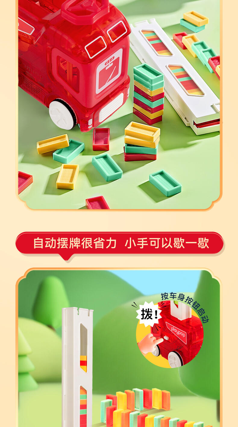 骨牌车:电动投牌,平稳均匀,每码一块骨牌即有叮的一声,为玩耍带来更多乐趣;