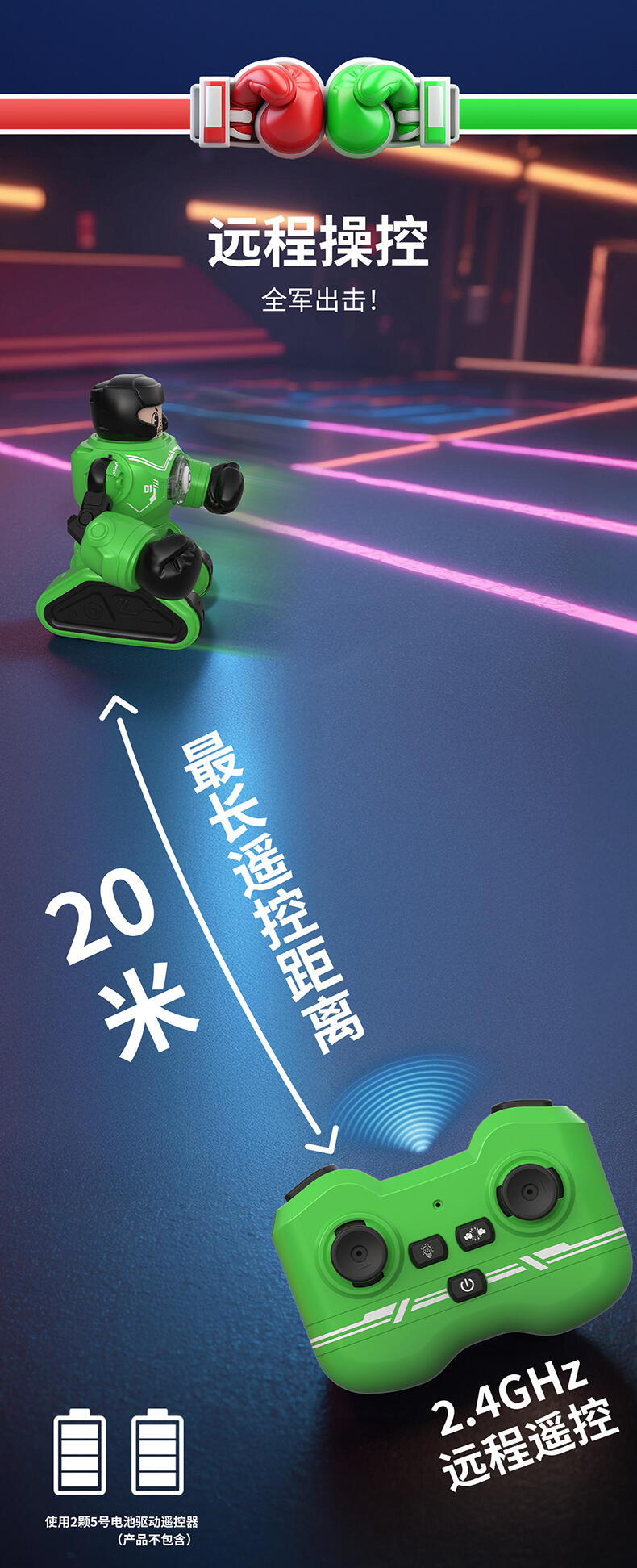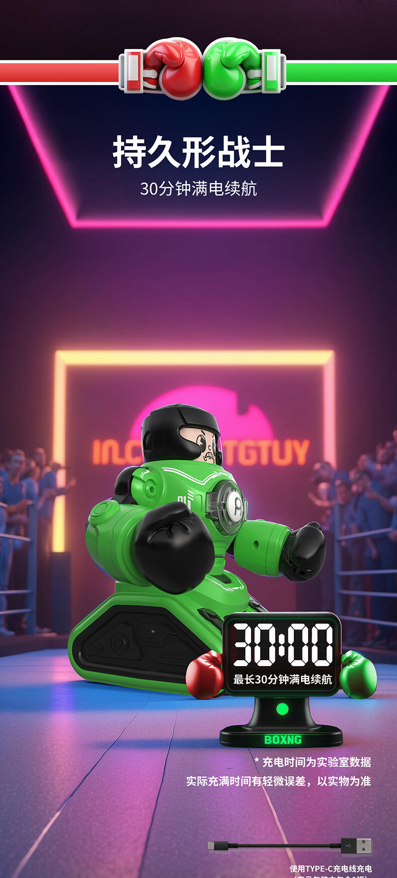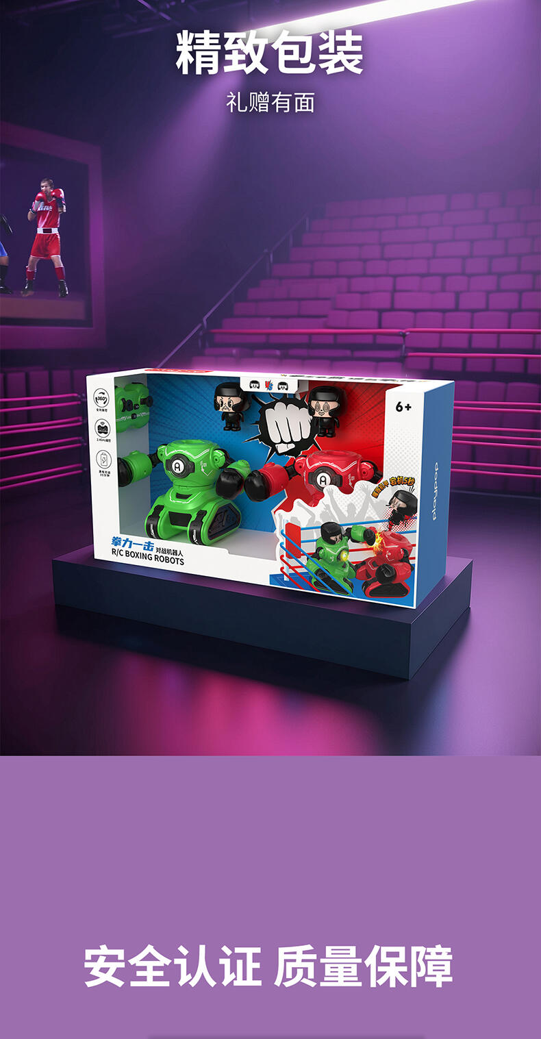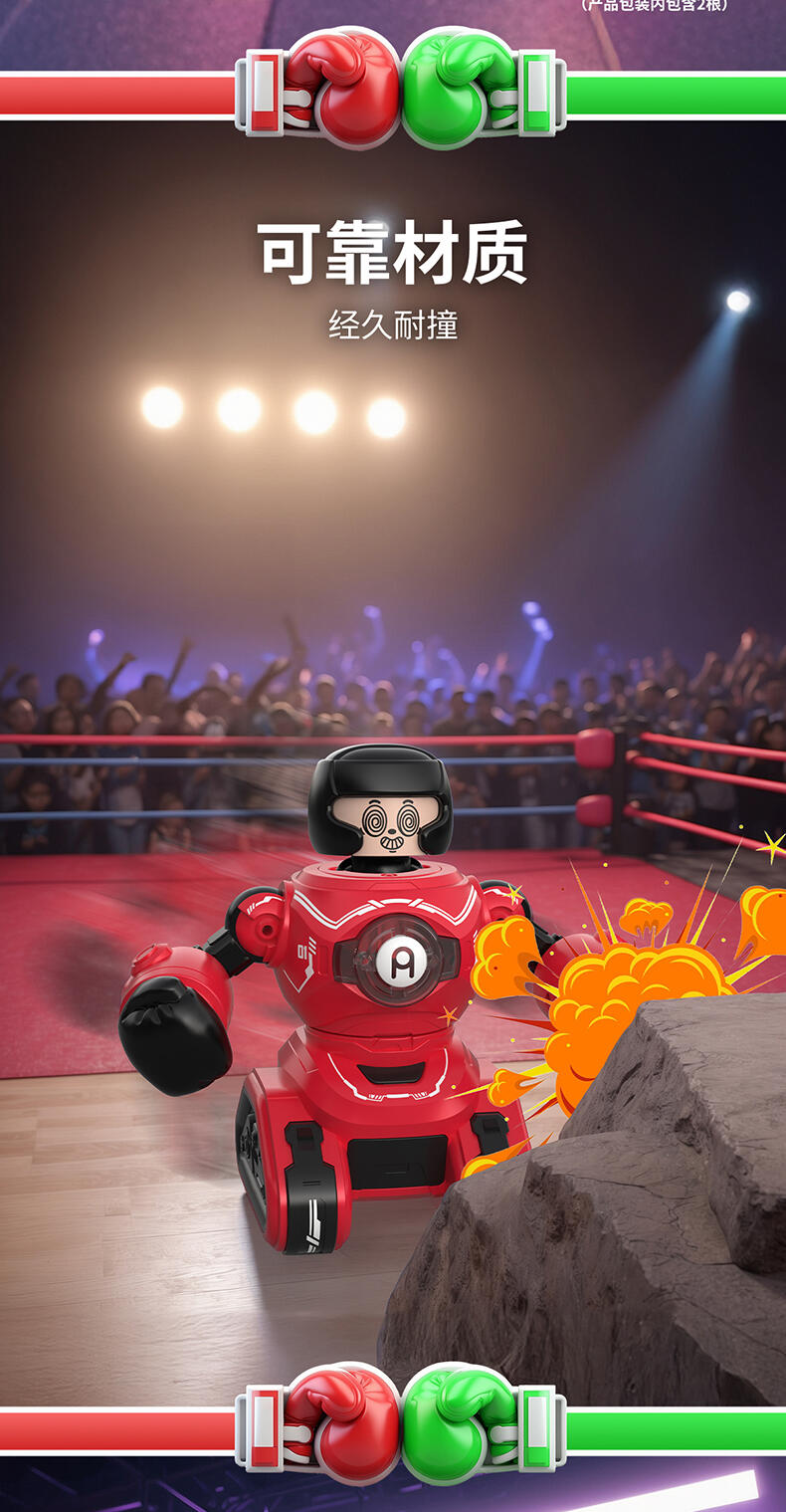 1. 20米操控距离;2.满电可对战30分钟;3. 多重动作(7通道),操作感拉满(前进、后退、左转、右转、左钩拳、右勾拳、暴击连招);4. 公仔被打出后,败者机甲将强制宕机5秒;5. Type-C外置充电口