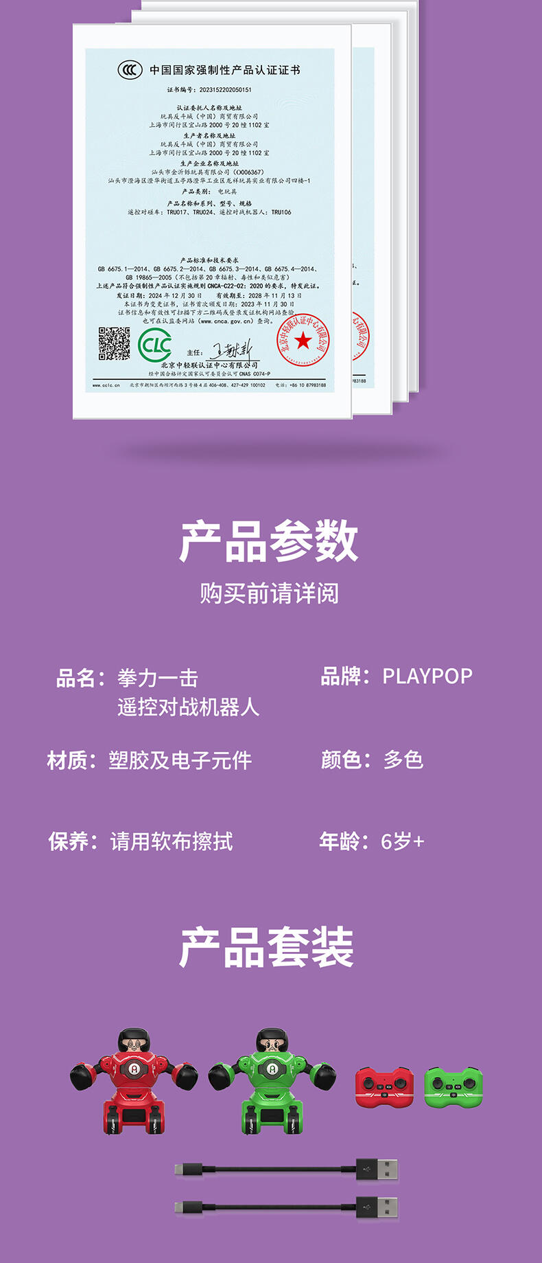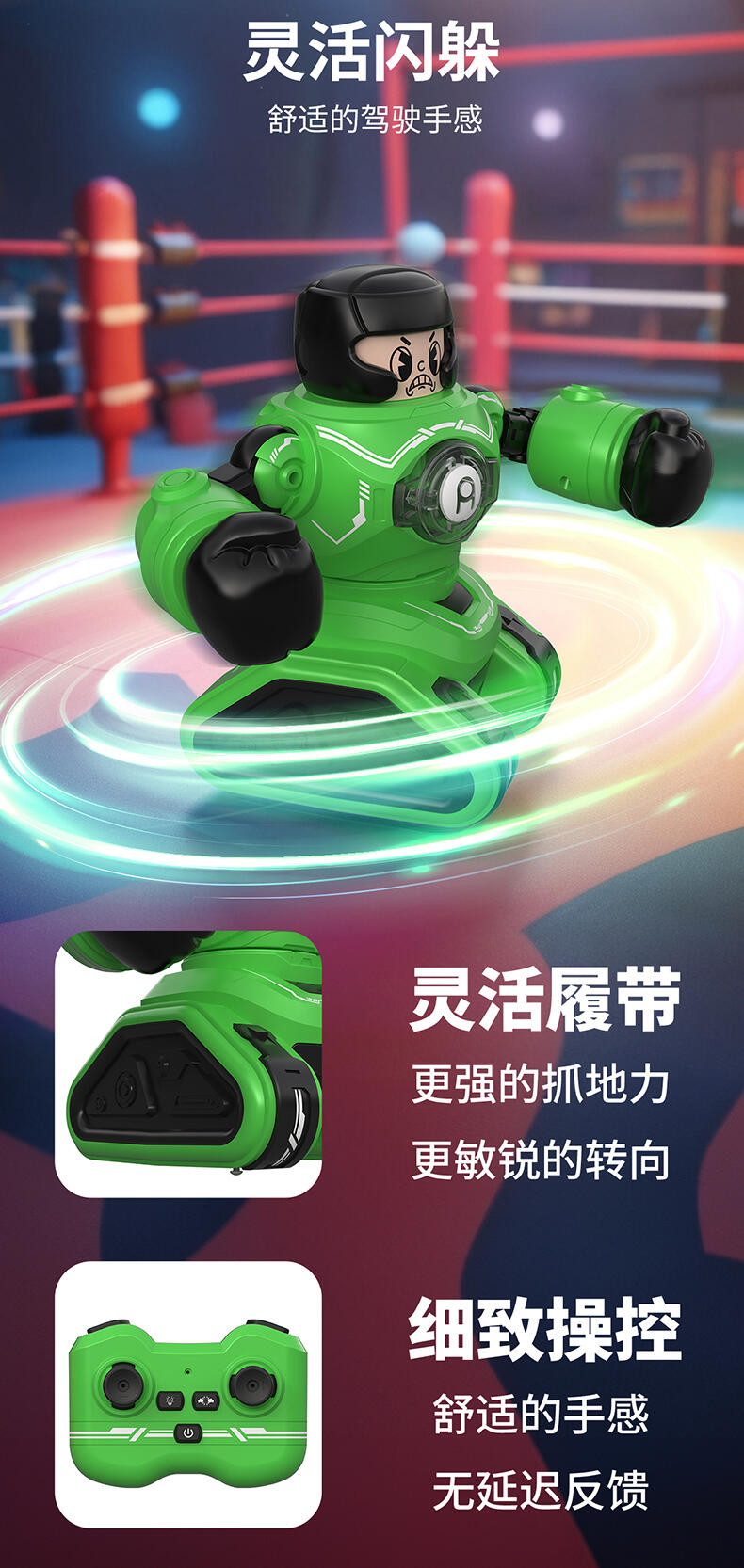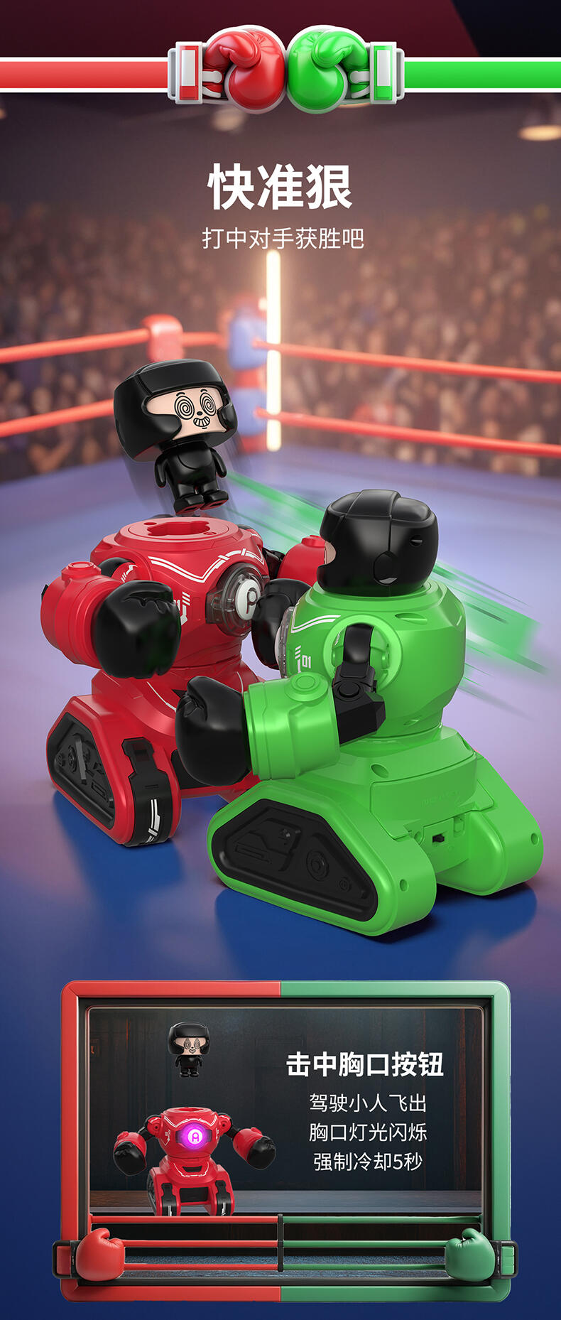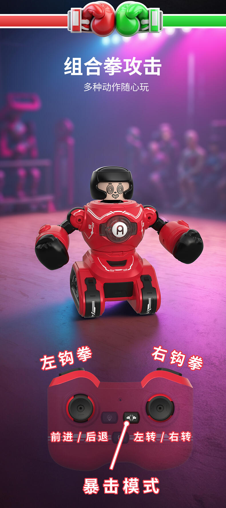 1. 20米操控距离;2.满电可对战30分钟;3. 多重动作(7通道),操作感拉满(前进、后退、左转、右转、左钩拳、右勾拳、暴击连招);4. 公仔被打出后,败者机甲将强制宕机5秒;5. Type-C外置充电口