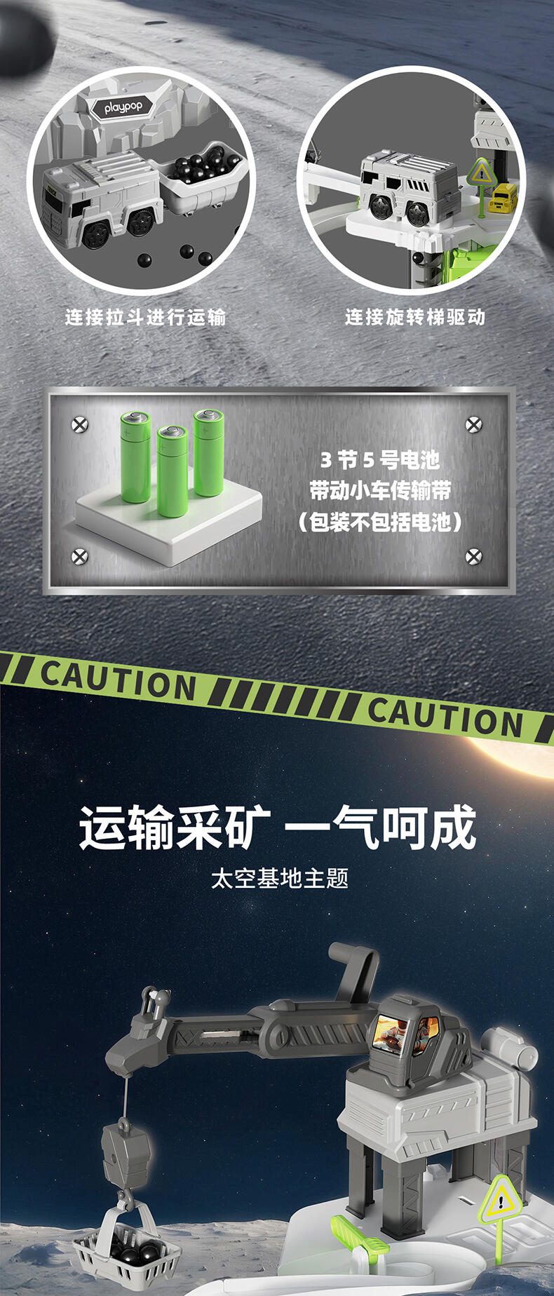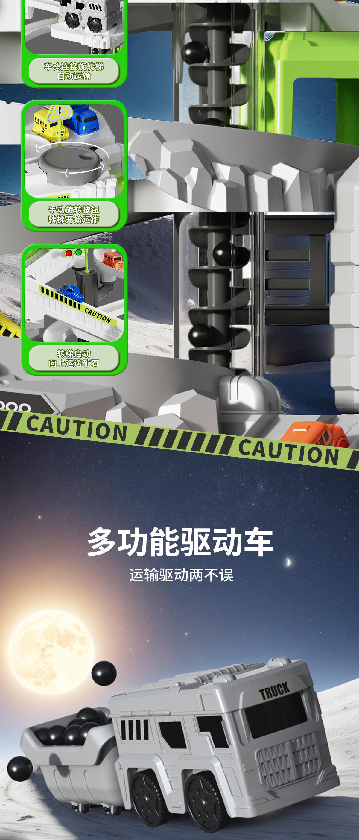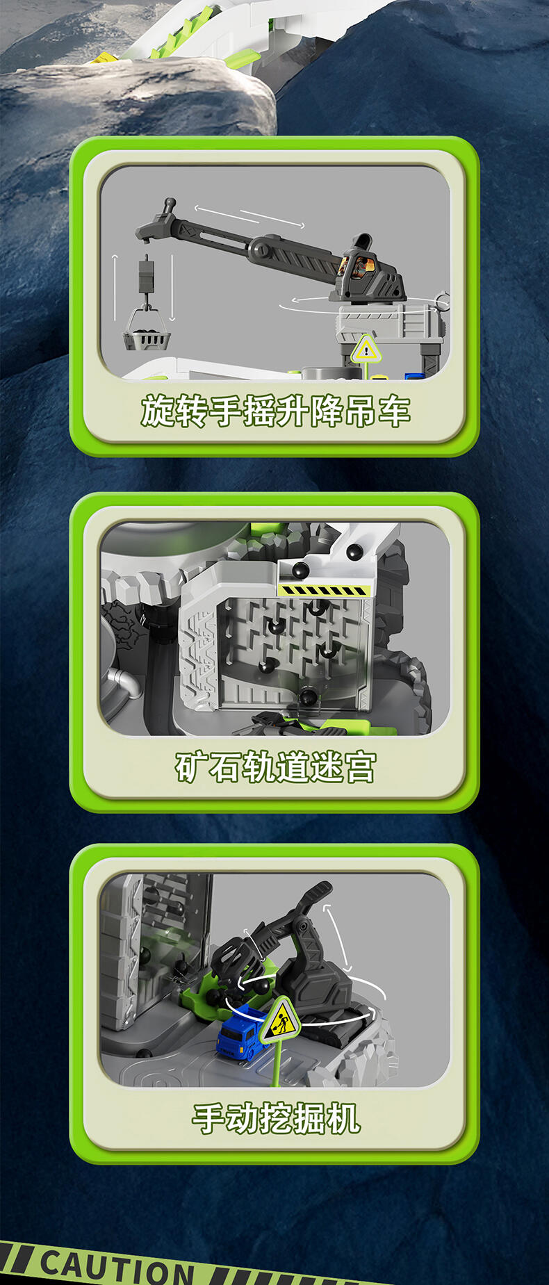 1. 电动驱动车,可连接拖斗行驶并运输煤矿,也可固定在矿场顶部,驱动旋转传送轴,将矿石传送至顶部。;2. 电动轨道运载小车(内含4辆),爬坡后顺轨道下落,循环往复。;3. 吊塔,可调整吊臂伸缩长度,可旋转;挖掘机,可模拟抓矿石至拖斗。;4. 具备3档开关,适用不同使用环境。