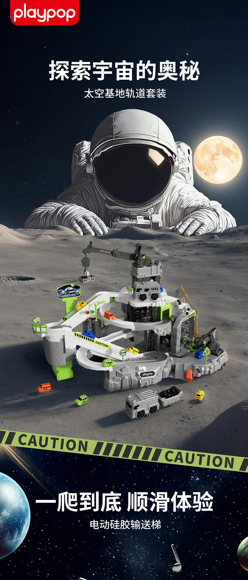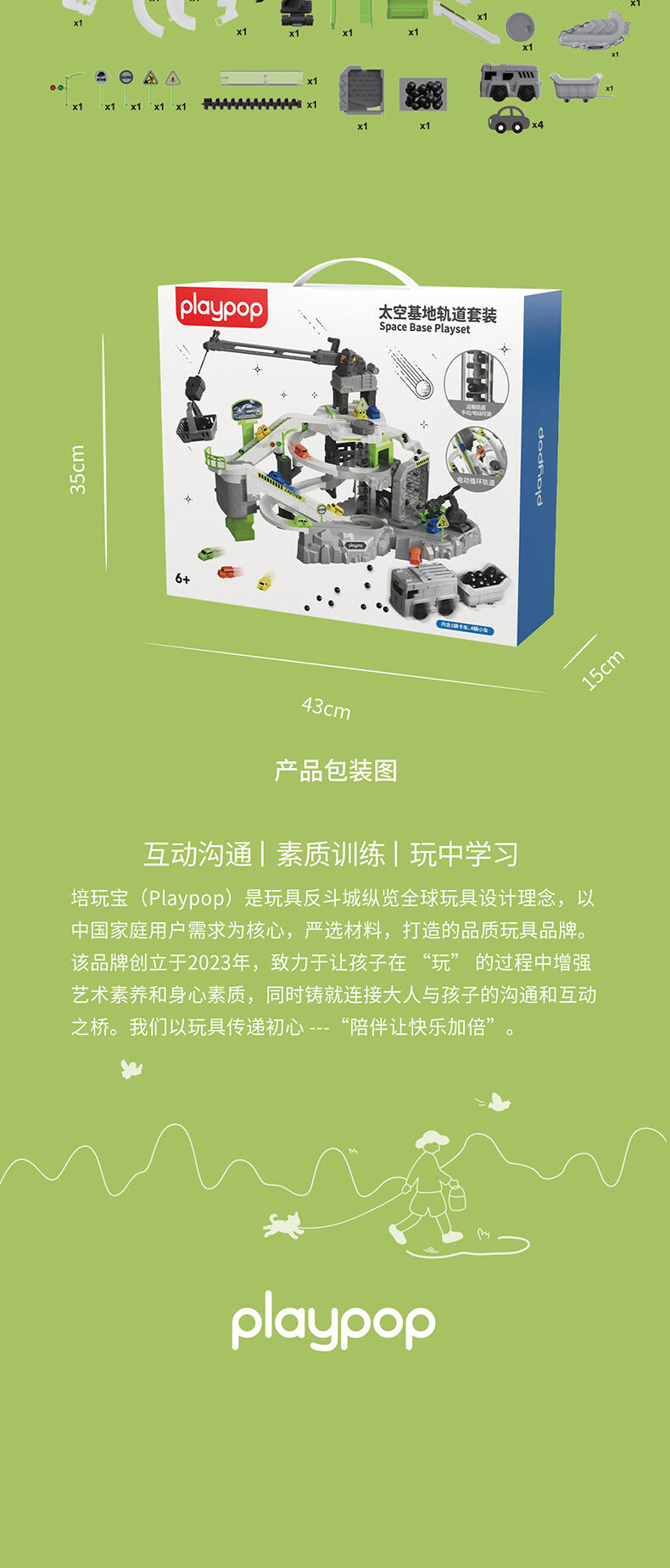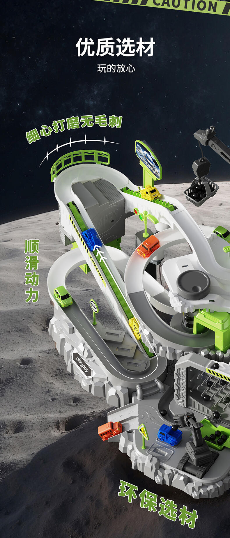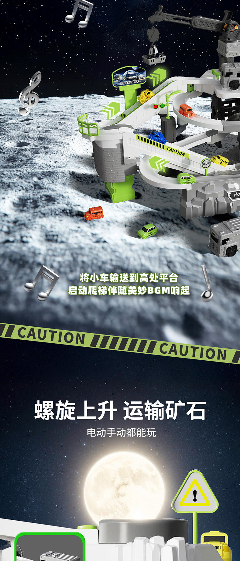 1. 电动驱动车,可连接拖斗行驶并运输煤矿,也可固定在矿场顶部,驱动旋转传送轴,将矿石传送至顶部。;2. 电动轨道运载小车(内含4辆),爬坡后顺轨道下落,循环往复。;3. 吊塔,可调整吊臂伸缩长度,可旋转;挖掘机,可模拟抓矿石至拖斗。;4. 具备3档开关,适用不同使用环境。