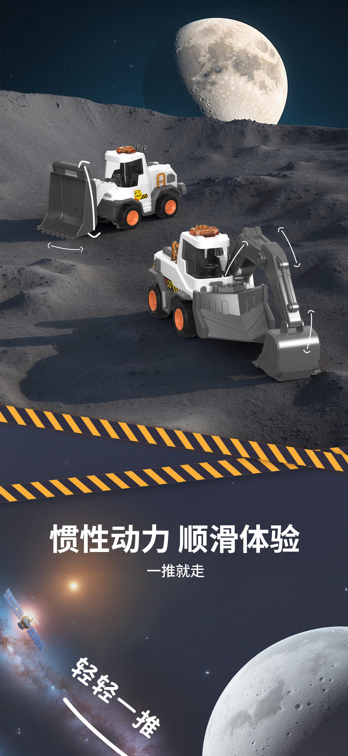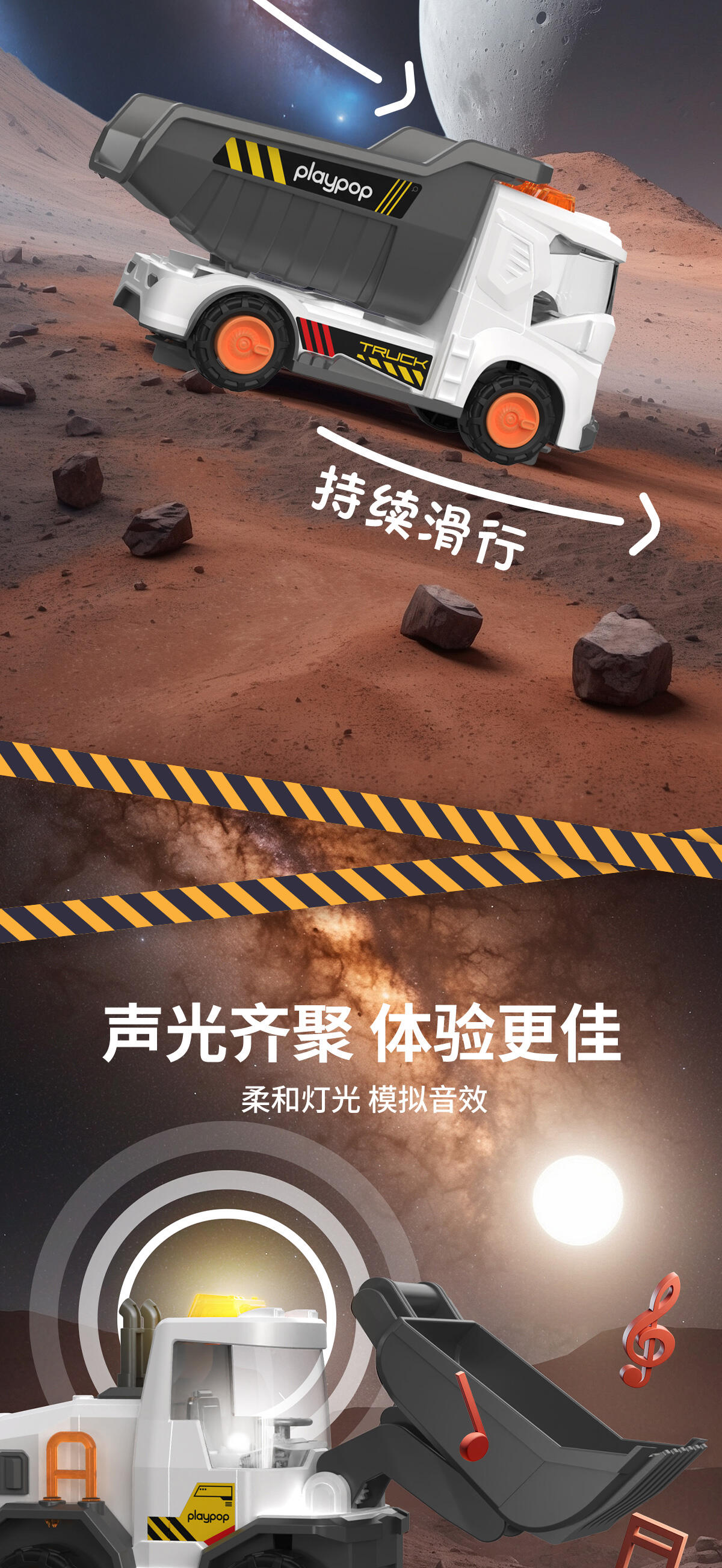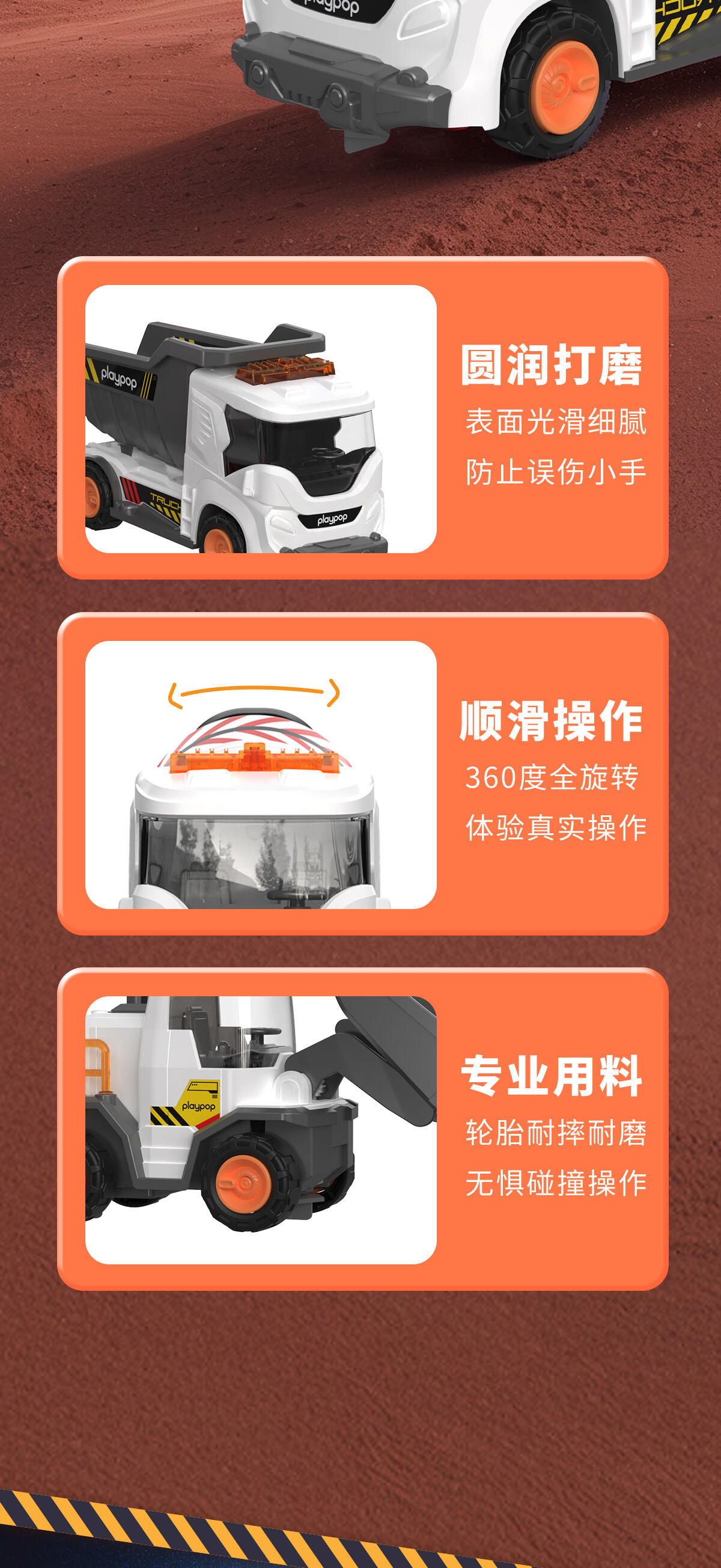 1. 仿真声音+炫酷灯光;2.多出结构可灵活转动;3. 表面光滑,倒角圆润不扎手;4. 惯性动力,一推就走