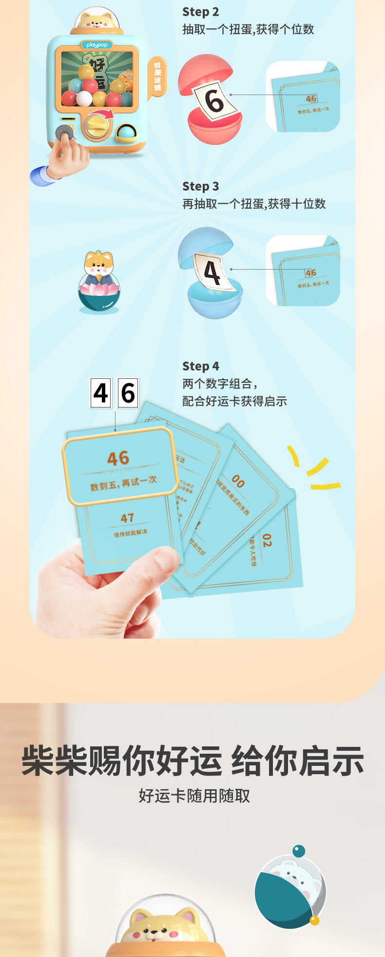 “很多时候,你心中其实已有答案,只是需要一个回应去肯定它” 1. 顶部人仔拧开可再将扭蛋放入,可以重复使用的可爱造型扭蛋机 2. 可DIY放置小物件或自制惊喜内容,进行扭蛋玩法 3. 配置“答案之书”玩法,让扭蛋来协助做决策 4. 自带音乐和灯光