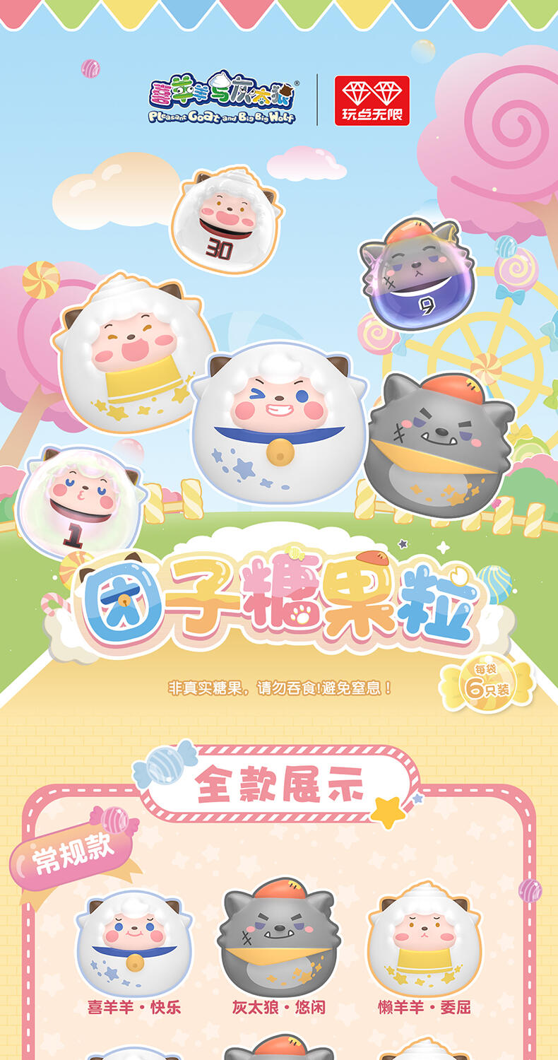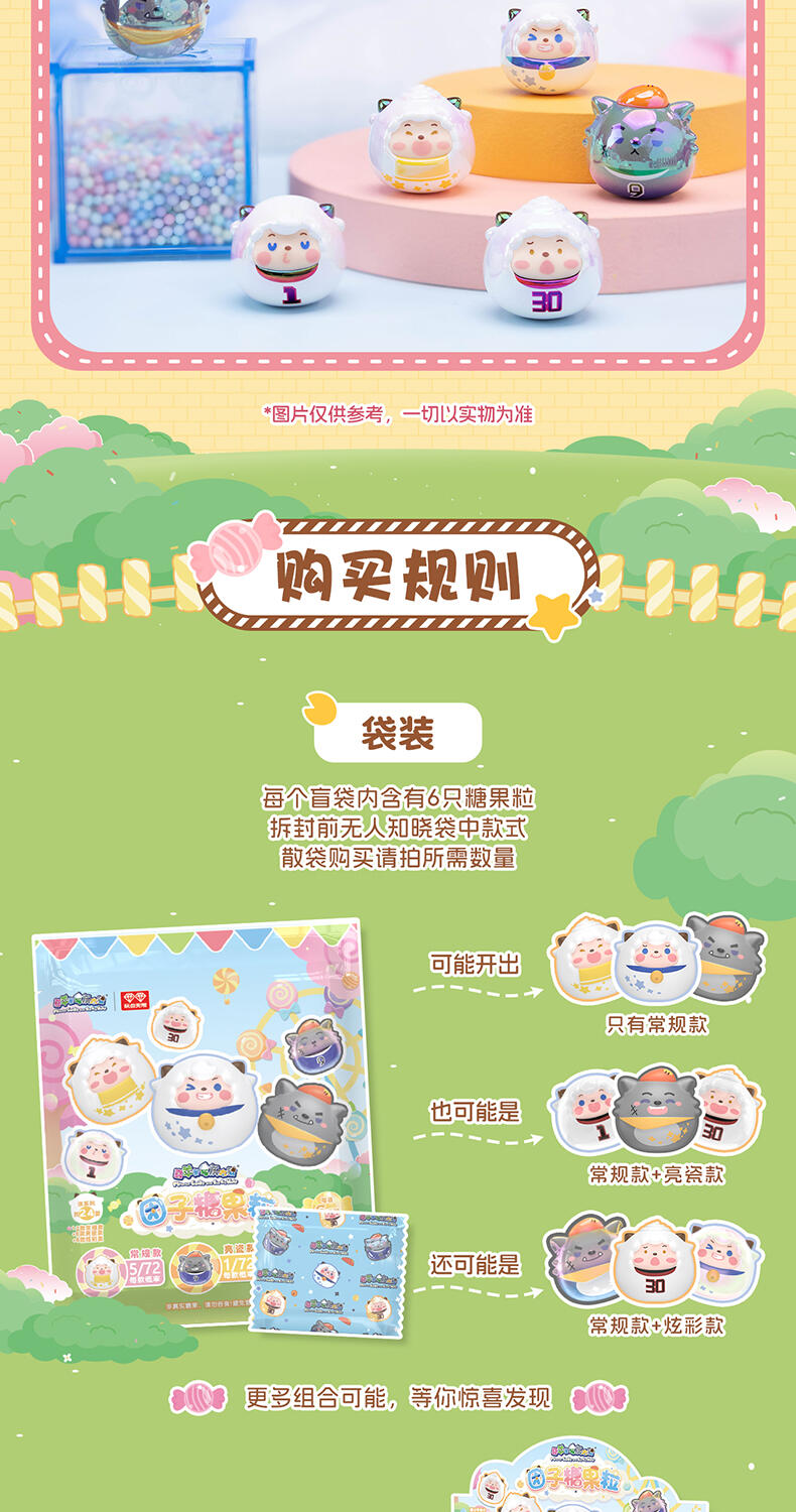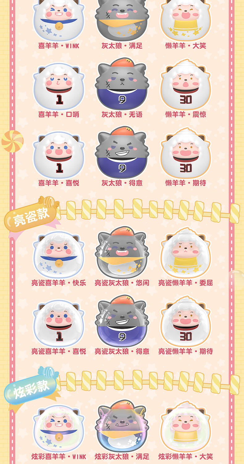 1、喜羊羊与灰太狼IP,童年回忆,经典角色 2、圆圆糖果粒,小巧造型,高性价比 3、糖果搭配外壳,可爱设计,组合堆叠玩法,趣味互动 4、稀有异色款,多样质感,闪亮吸睛