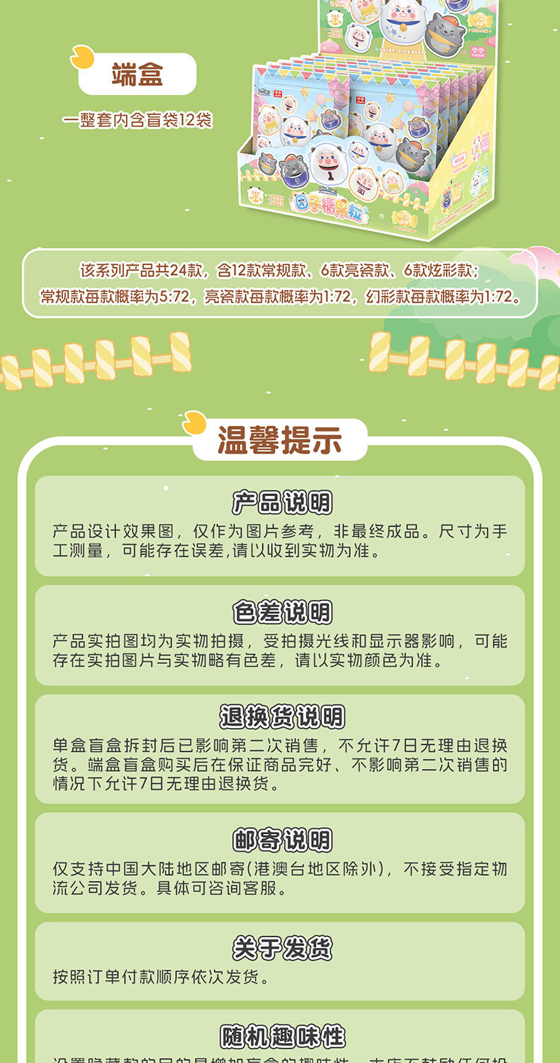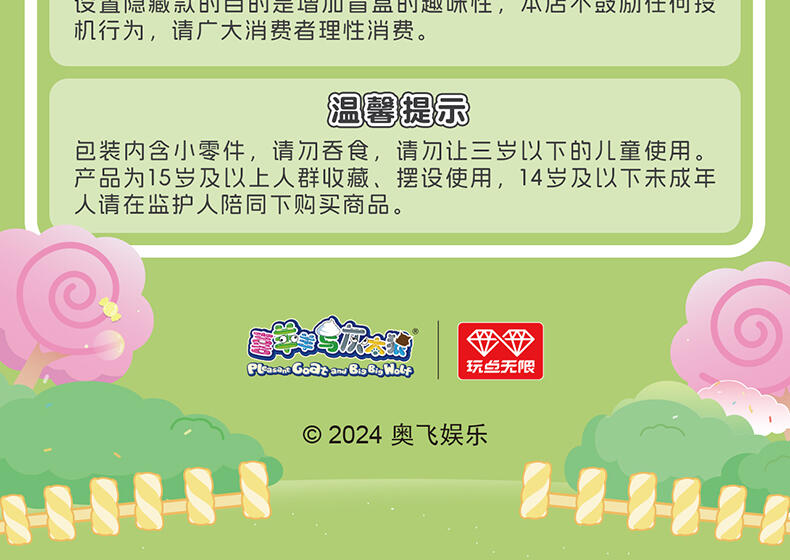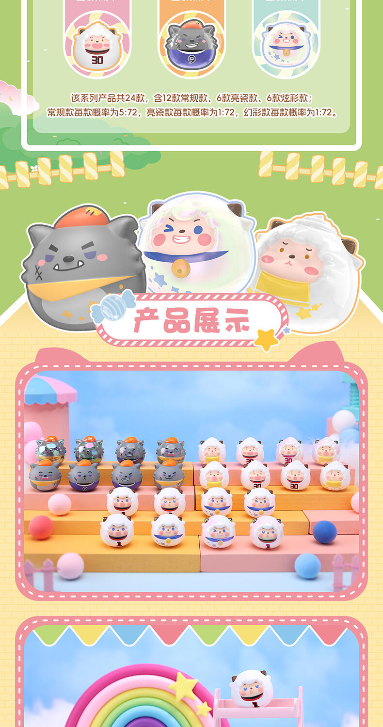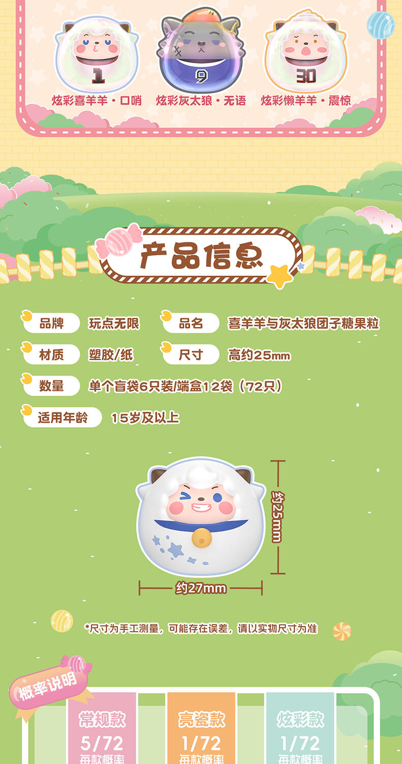 1、喜羊羊与灰太狼IP,童年回忆,经典角色 2、圆圆糖果粒,小巧造型,高性价比 3、糖果搭配外壳,可爱设计,组合堆叠玩法,趣味互动 4、稀有异色款,多样质感,闪亮吸睛