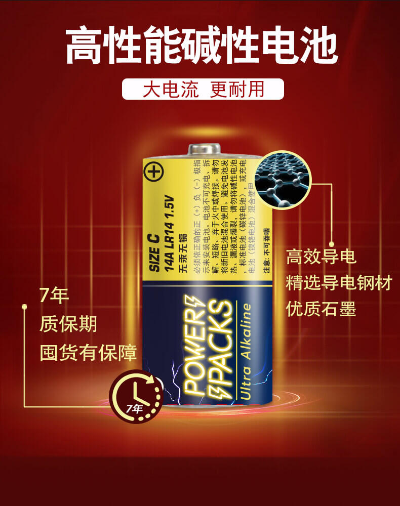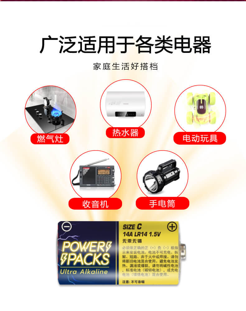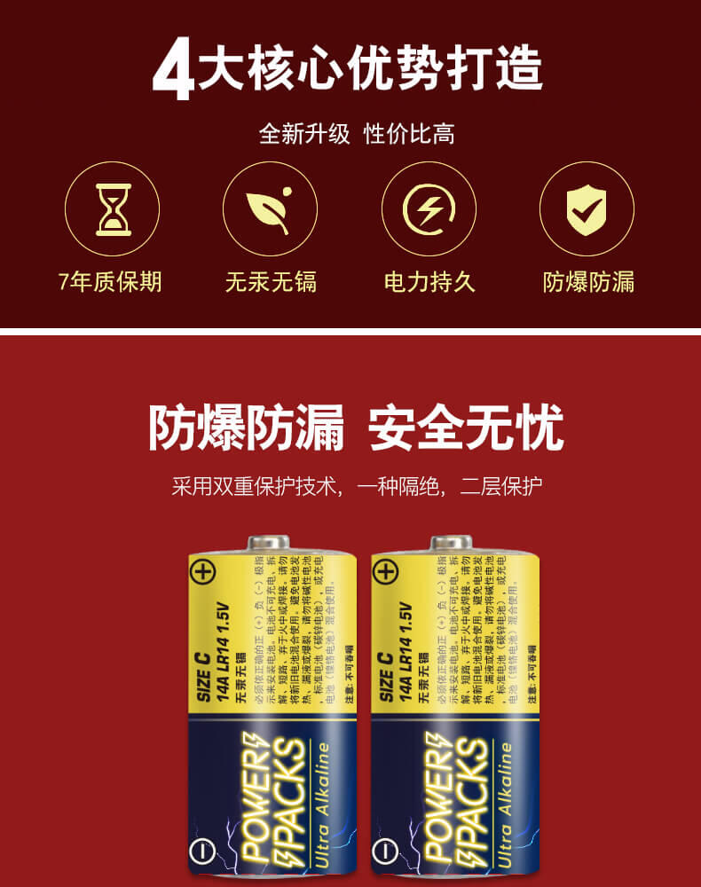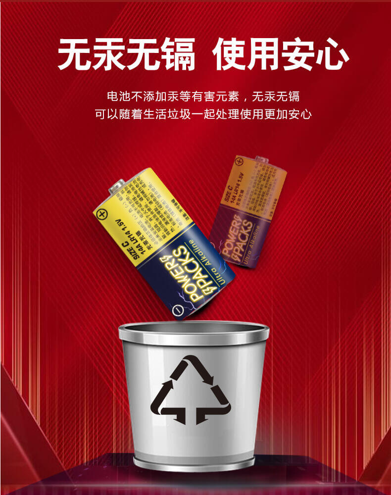1.碱性电池持久耐用;2.无汞无镉,环保电池,可作为干垃圾丢弃;3.防爆防漏,安全无忧;4.适用于手电筒、收音机、玩具、电子琴等电器