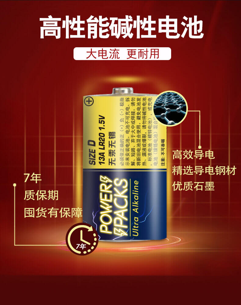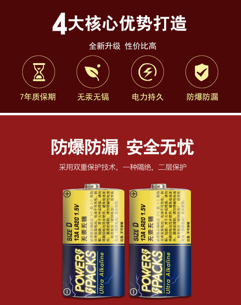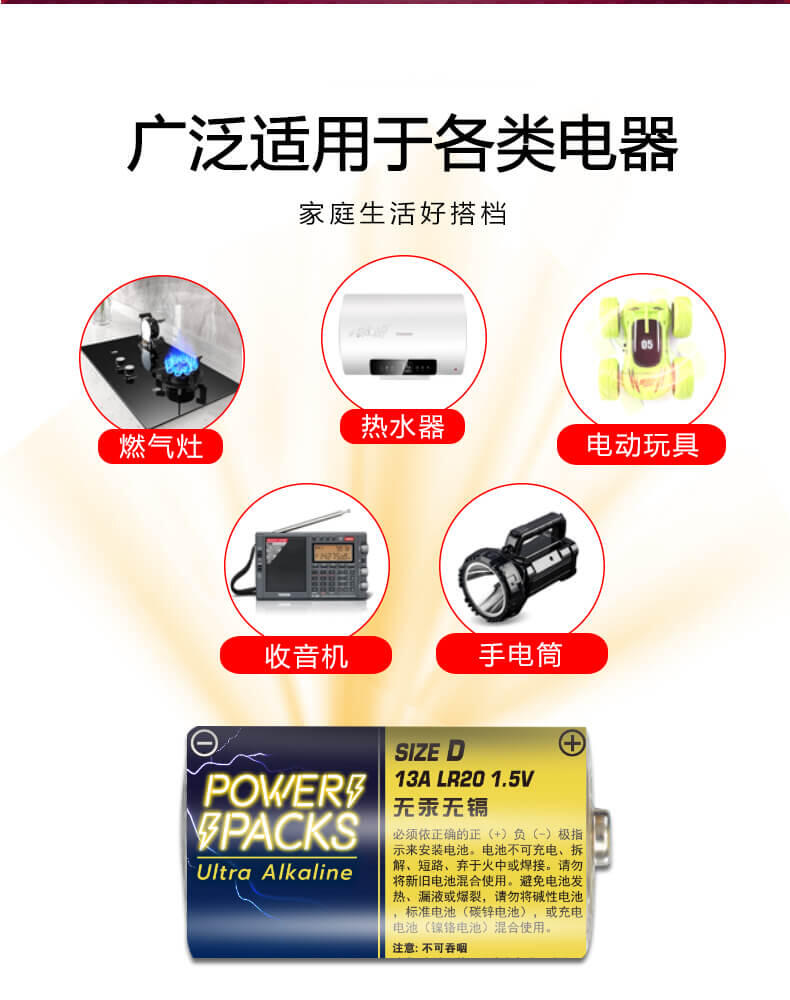 1.碱性电池持久耐用;2.无汞无镉,环保电池,可作为干垃圾丢弃;3.防爆防漏,安全无忧;4.适用于灶具、热水器、手电筒、收音机、玩具、车位锁、电子琴等电器