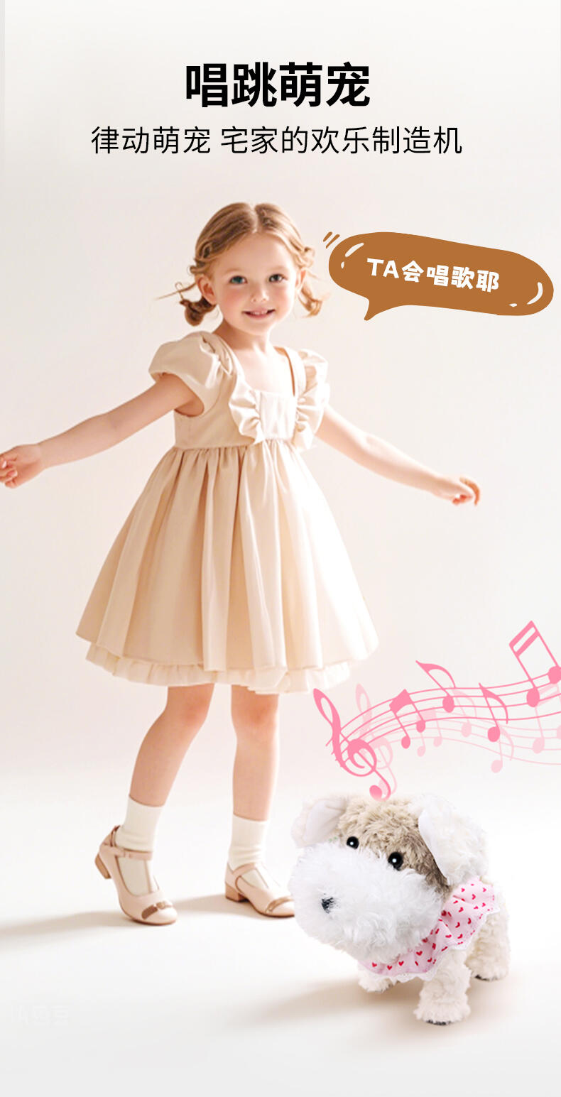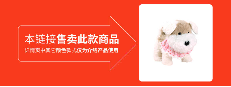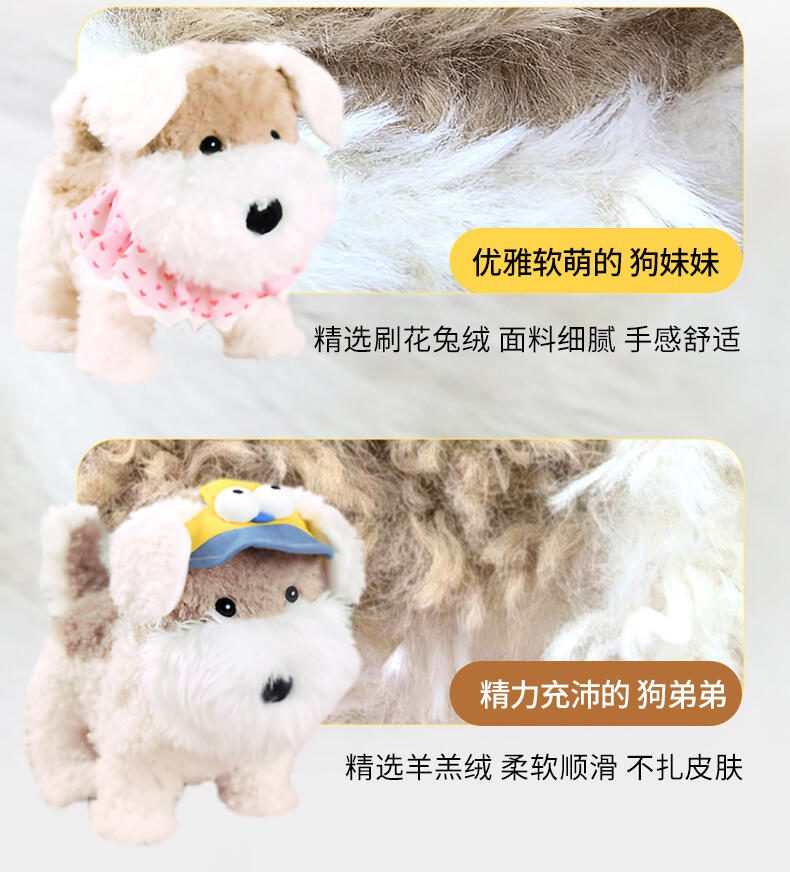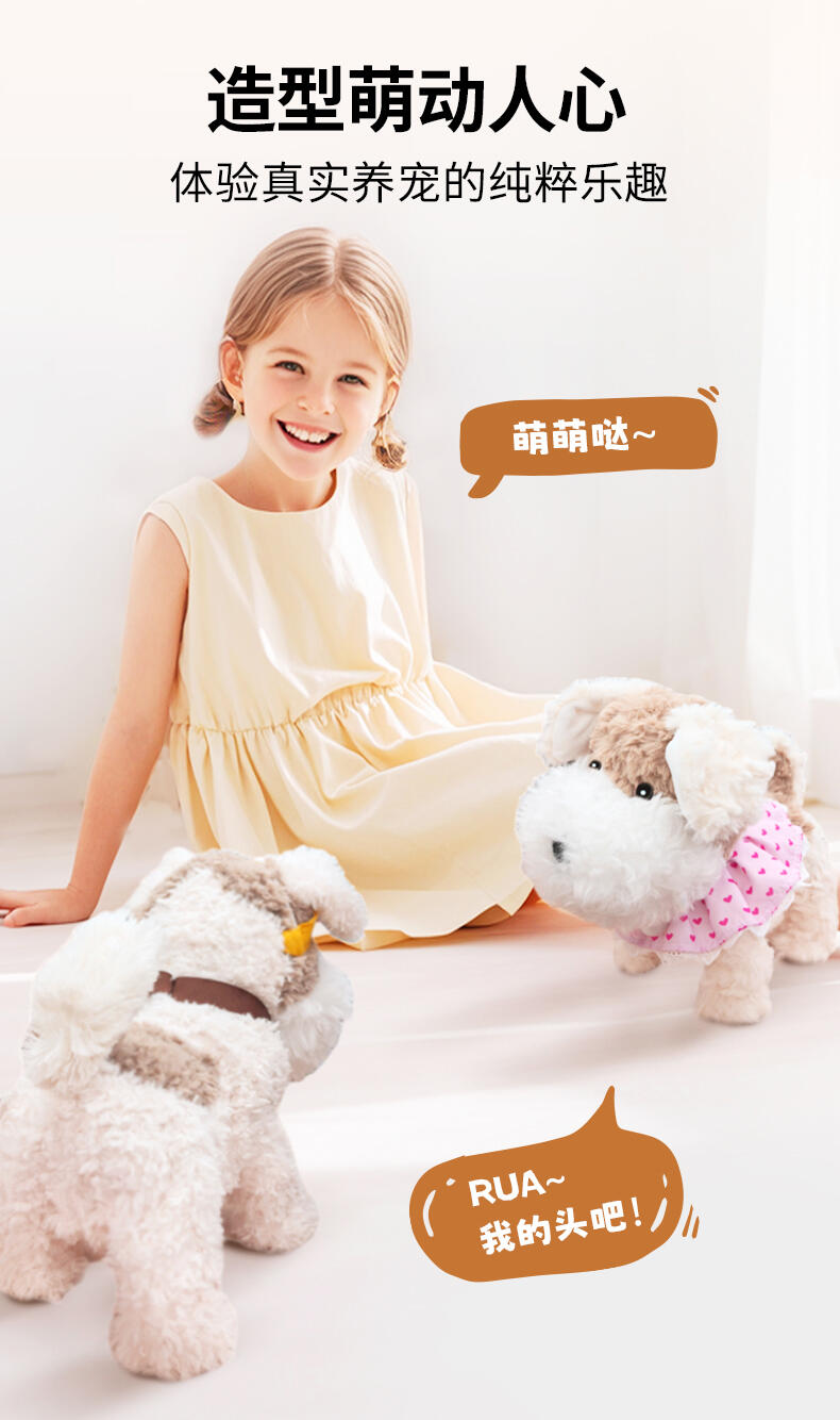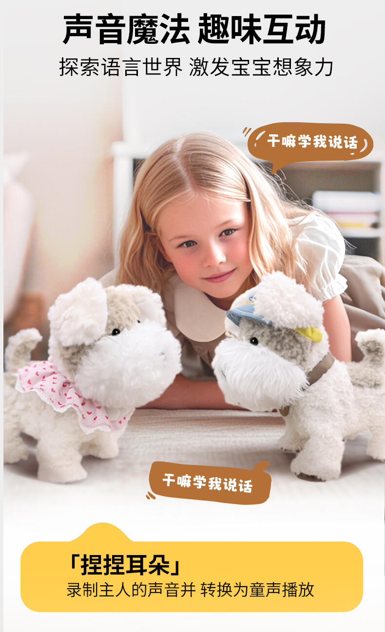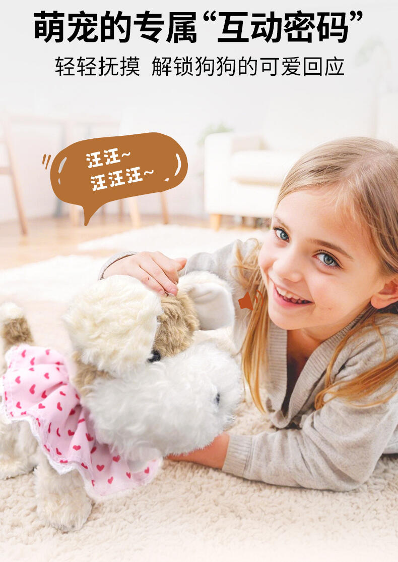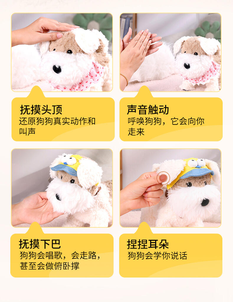 1.精选刷花兔绒,面料细腻,高柔软度手感舒适;2. 学舌功能,录制主人的声音并转换为童声播放;3. 抚摸头顶、下巴、大声喊狗狗,会触发做俯卧撑、摇摇头、摆摆尾,向主人走来等形象动作;4. 可爱造型,仿生动作和声效,如同养了一只真实小宠