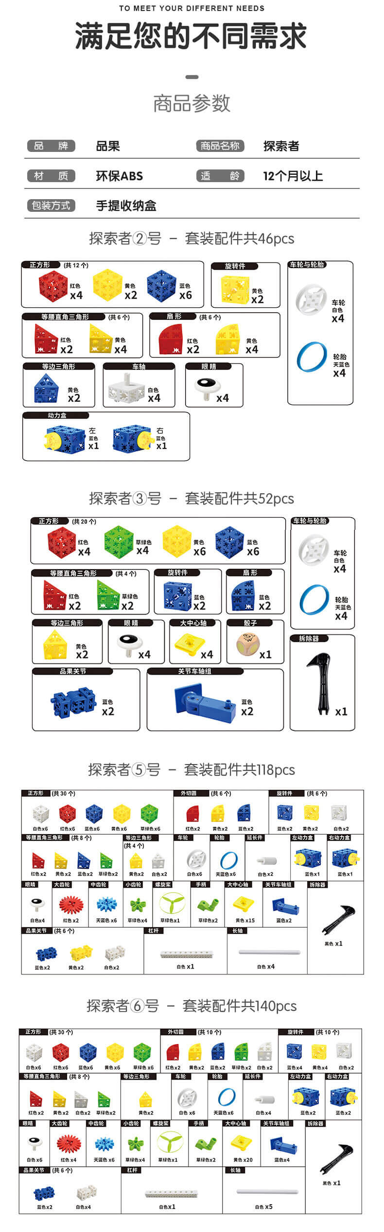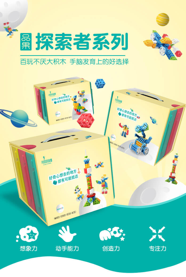 品果是四喜人旗下一款可以六面拼插、隐藏接点、跨接固定的方块构建积木,品果方块的形状包括了正方形、直角三角形、等边三角形、扇形、内切圆和半型六种基本的几何形状,还有车轮、旋转件等配件