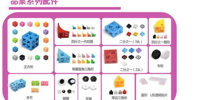 品果是四喜人旗下一款可以六面拼插、隐藏接点、跨接固定的方块构建积木,品果方块的形状包括了正方形、直角三角形、等边三角形、扇形、内切圆和半型六种基本的几何形状,还有车轮、旋转件等配件