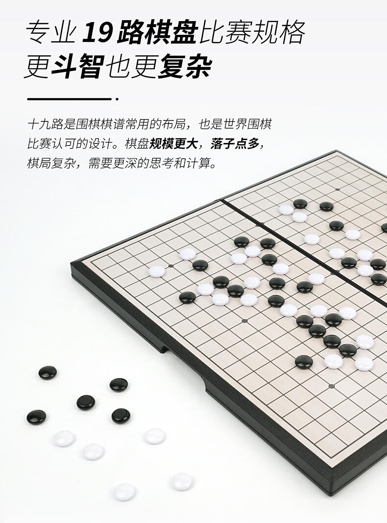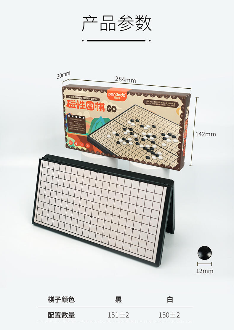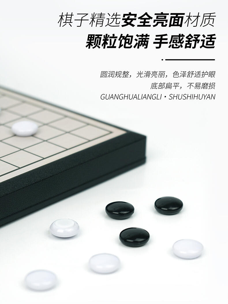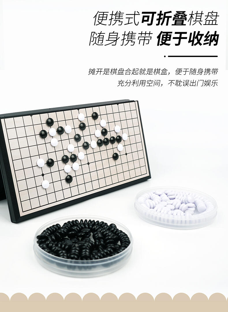 棋盘为折叠磁性便携收纳,棋盘内置黑白二子收纳盒,打开后尺寸为28.5*28.5CM,围棋,是一种策略性二人棋类,使用格状棋盘及黑白二色棋子进行对奕,过程中围地吃子,以所围“地”的大小决定胜负。属琴棋书画四艺之一。下五子棋可以提高孩子的注意力集中力,养成能静的习惯,培养孩子的挫折承受能力,数学能力。锻炼孩子的逻辑思维,逆向思维,帮助孩子养成独立思考和解决问题的习惯。 本产品经过精心设计,优质材料制成,用心打磨细节,边缘光滑,制作精良。适合小朋友玩耍,也可以与其他小朋友一起分享,和父母同玩,促进亲子关系发展