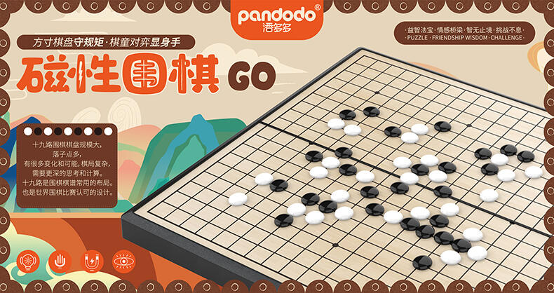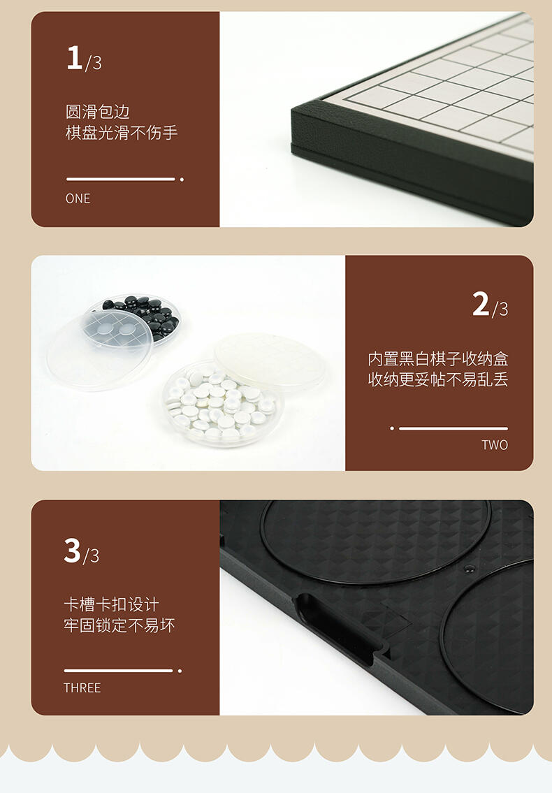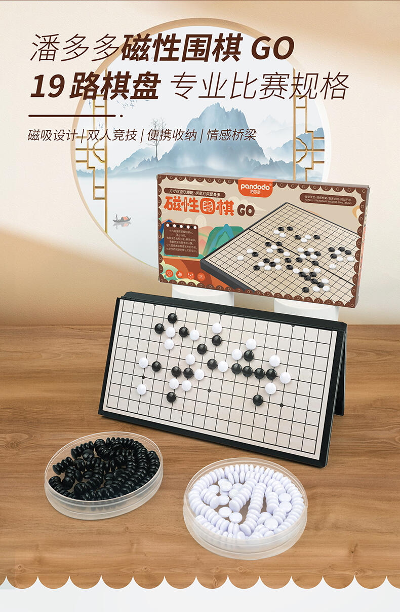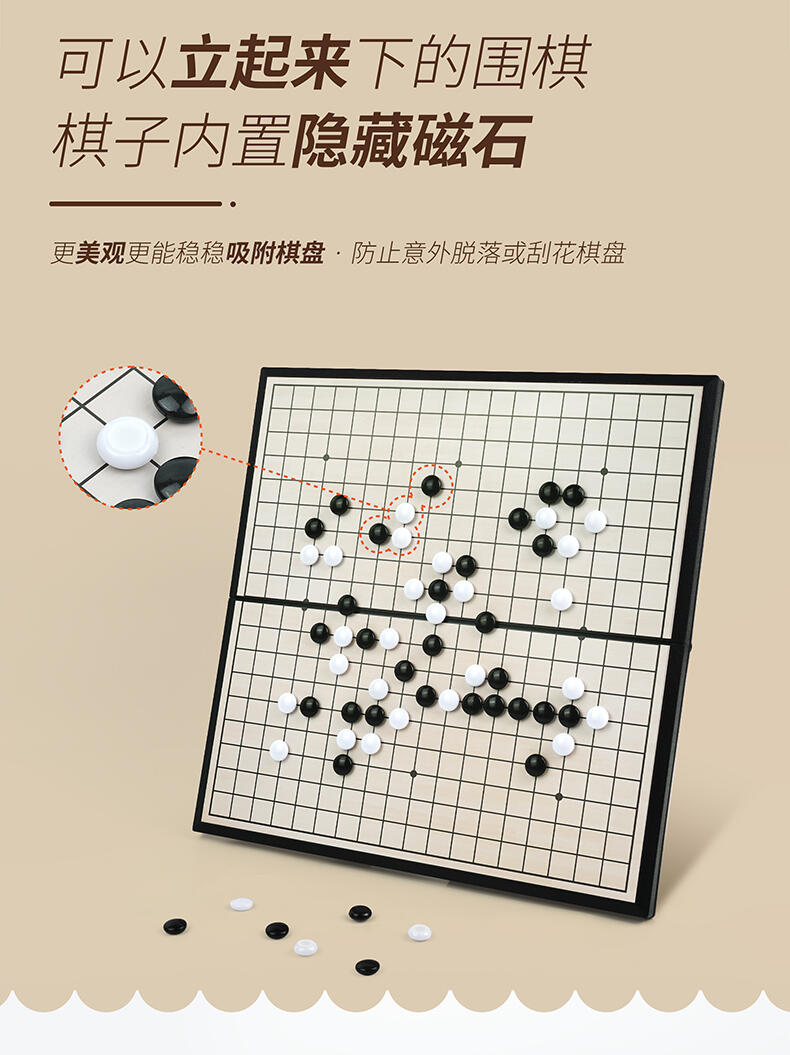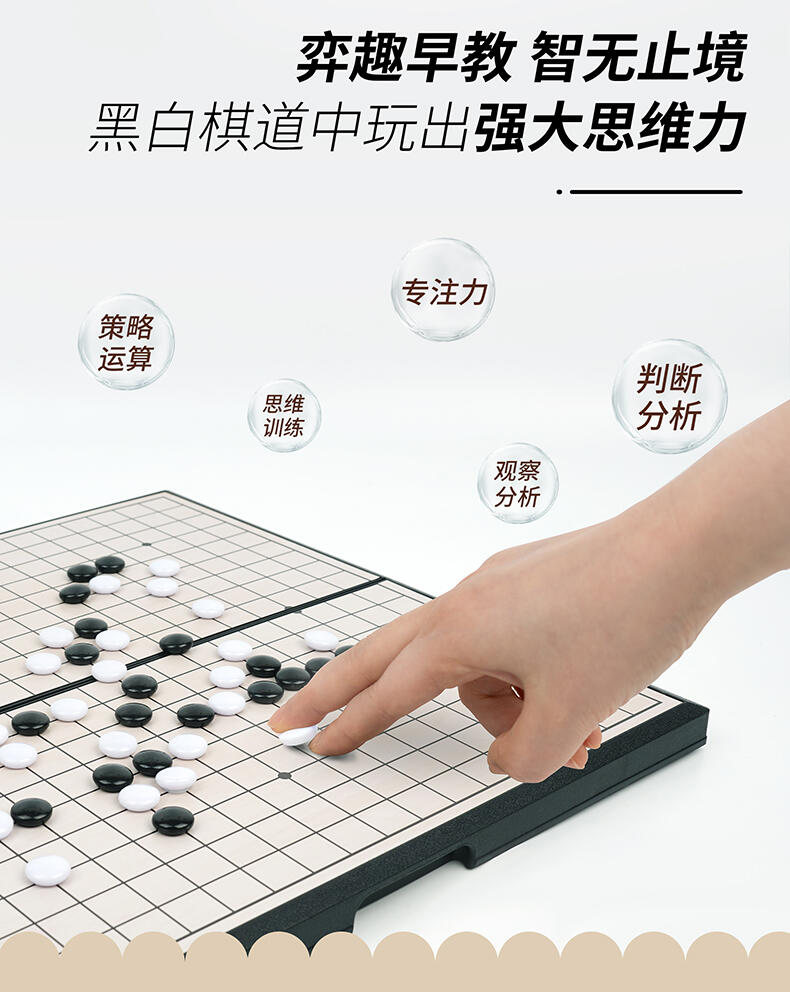 棋盘为折叠磁性便携收纳,棋盘内置黑白二子收纳盒,打开后尺寸为28.5*28.5CM,围棋,是一种策略性二人棋类,使用格状棋盘及黑白二色棋子进行对奕,过程中围地吃子,以所围“地”的大小决定胜负。属琴棋书画四艺之一。下五子棋可以提高孩子的注意力集中力,养成能静的习惯,培养孩子的挫折承受能力,数学能力。锻炼孩子的逻辑思维,逆向思维,帮助孩子养成独立思考和解决问题的习惯。 本产品经过精心设计,优质材料制成,用心打磨细节,边缘光滑,制作精良。适合小朋友玩耍,也可以与其他小朋友一起分享,和父母同玩,促进亲子关系发展