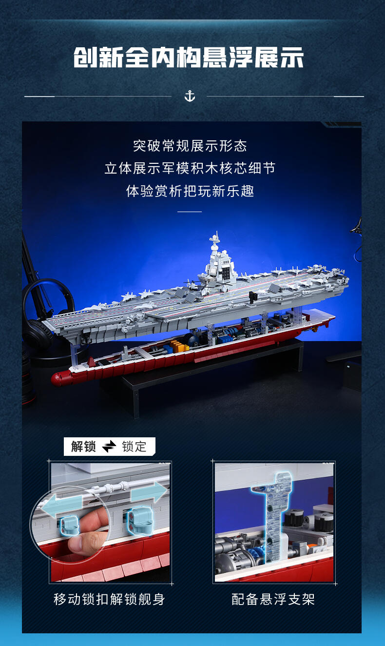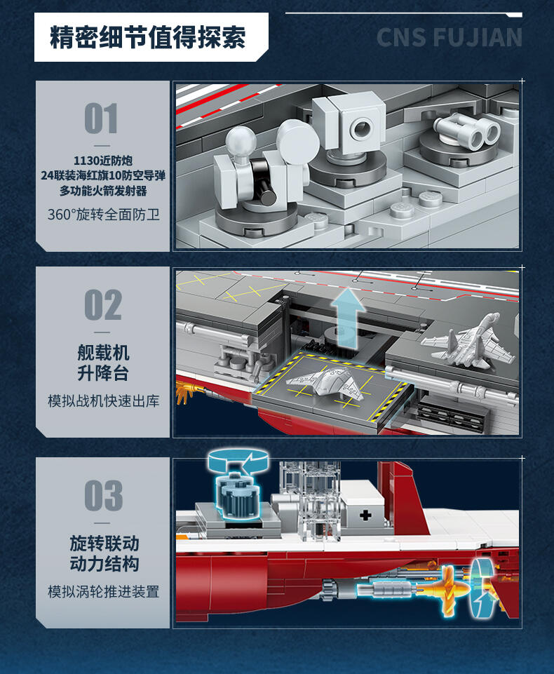 1、360°旋转全面防卫 2、模拟战机快速出库 3、模拟涡轮推进装置 4、突破常规展示形态,立体展示军模积木核芯细节,体验赏析把玩新乐趣