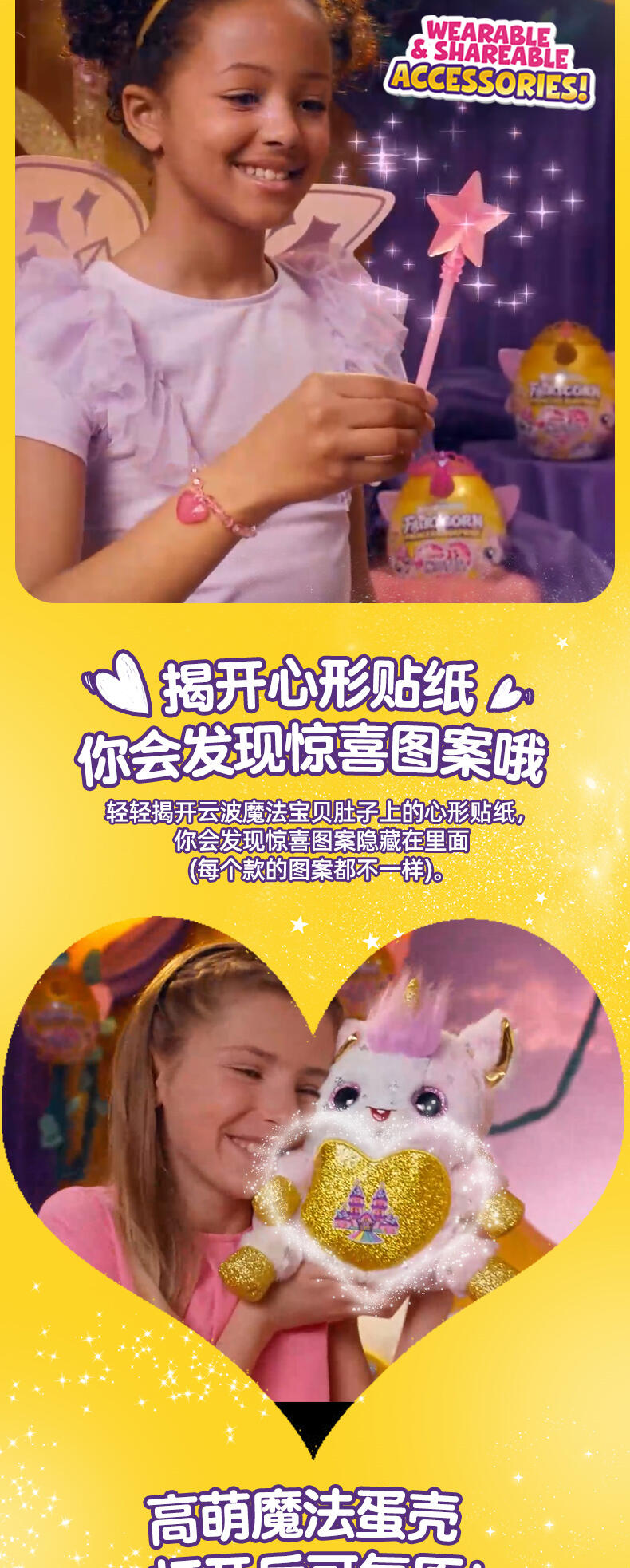 3.皇冠翅膀可穿戴,穿上精灵翅膀,头戴公主皇冠,手持魔法棒,带着你的云波魔法宝贝,一起开启精灵公主的梦幻旅程吧~ 4.揭开心形贴纸 你会发现惊喜图案哦。轻轻揭开云波魔法宝贝肚子上的心形贴纸,