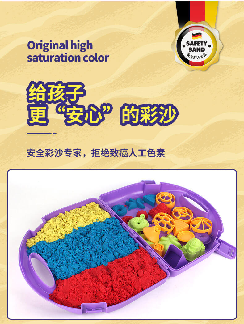 ·安全彩沙专家:采用德国巴斯夫有机颜料、天然蜂巢蜂蜡,符合国家标准和欧盟标准(瑞士权威机构SGS检测)成分安心,家长放心。动态创意玩法,激发孩子想象力,不同颜色的搭配和工具任意组合孩子可以自由创造出充满想象力精彩作品,玩具沙颜色更鲜艳,提高孩子对色彩的认知和敏感度、并锻炼色彩搭配能力,三合一手提箱:方便携带+易收纳(工具和沙子再也不用担心到处都是难以打扫了)+60厘米超大沙盘,宝宝玩沙更尽兴!,安全彩沙专家:采用德国巴斯夫有机颜料、天然蜂巢蜂蜡,符合国家标准和欧盟标准(瑞士权威机构SGS检测)成分安心,家长放心,提高孩子专注力